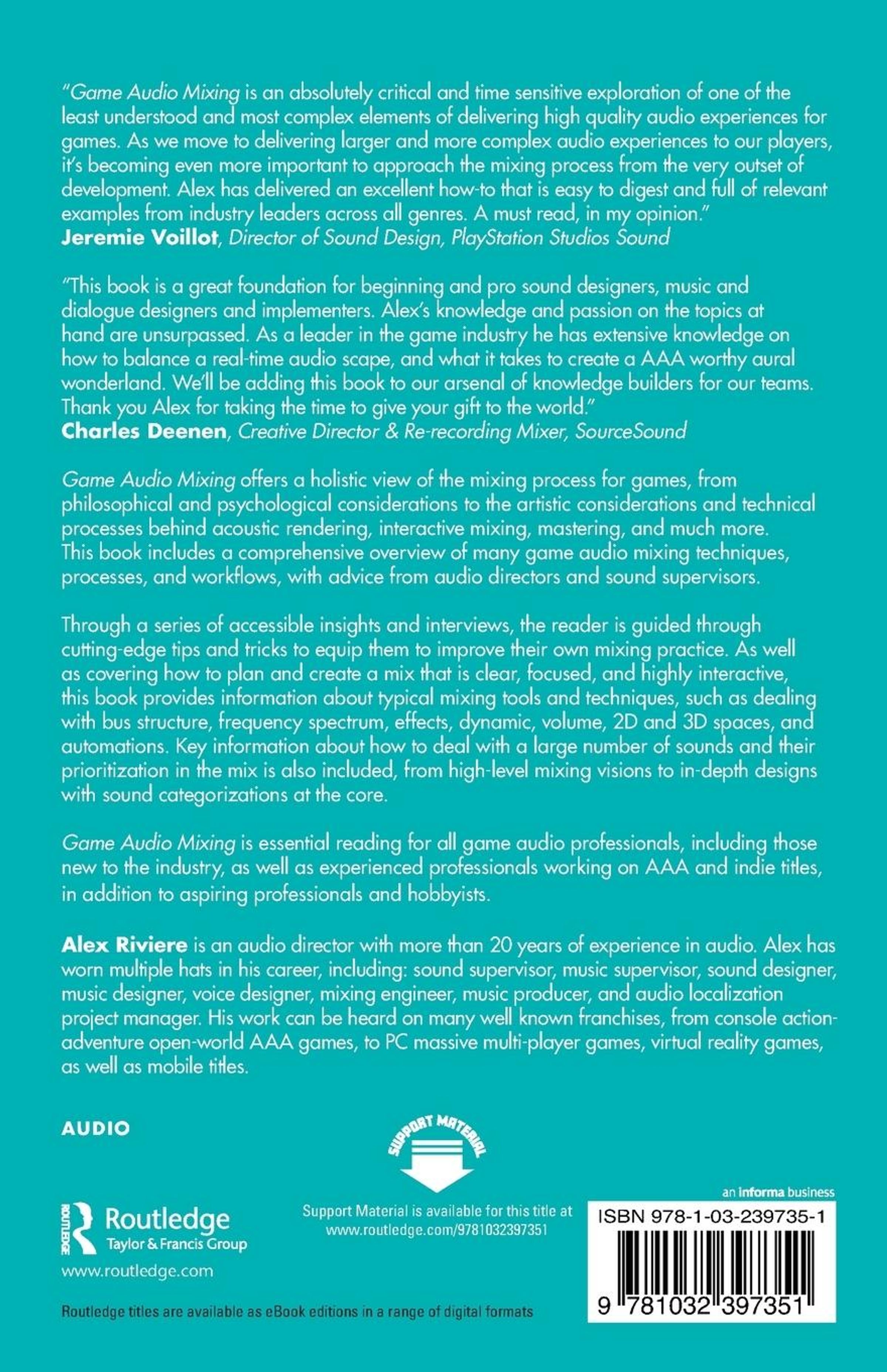 Game Audio Mixing is essential reading for all game audio professionals, including those new to the industry, as well as experienced professionals working on AAA and indie titles, in addition to aspiring professionals and hobbyists.