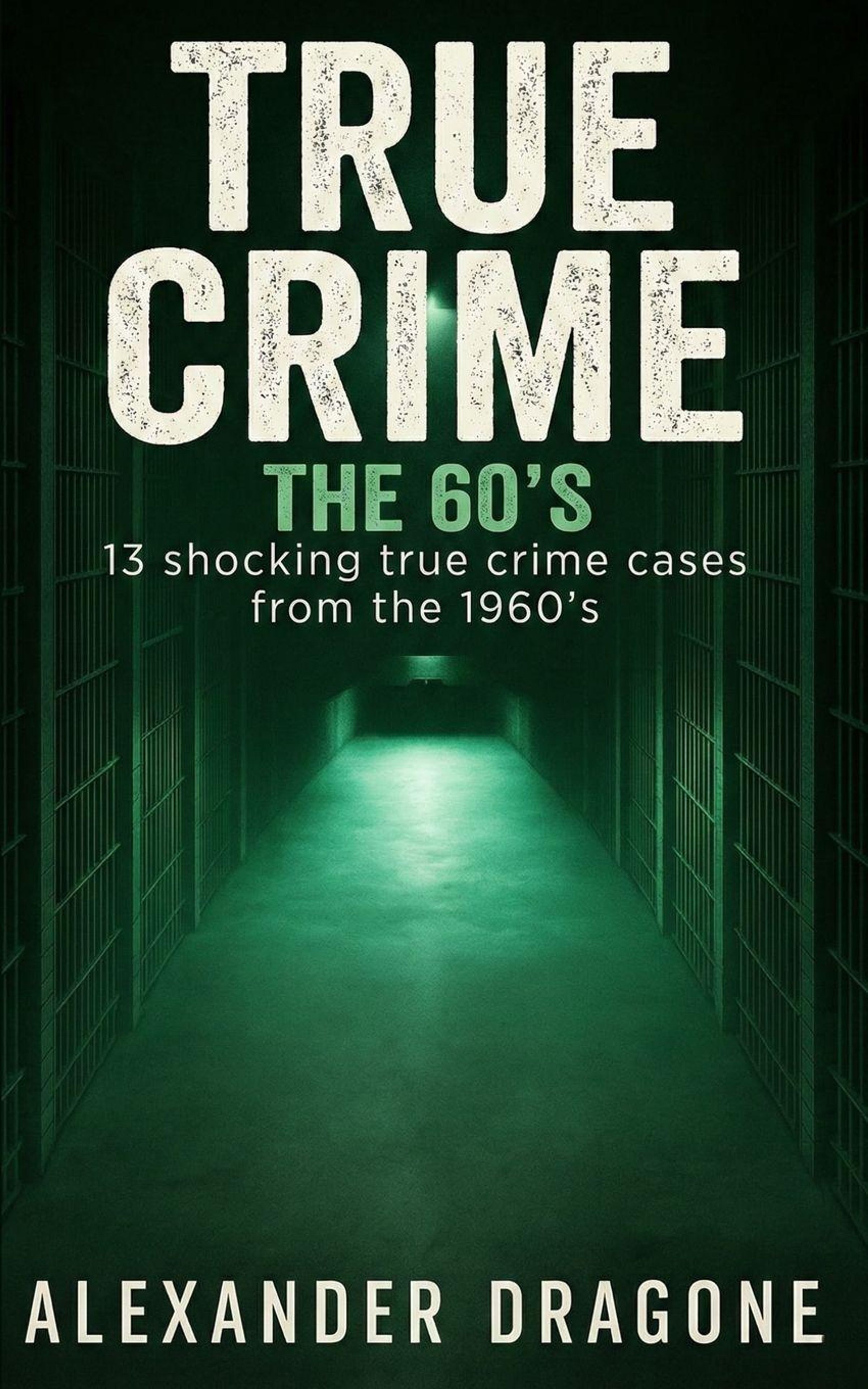 Text: "TRUE CRIME THE 60'S, 13 shocking true crime cases from the 1960’s, ALEXANDER DRAGONE." Korridorbild in Grün., Buch