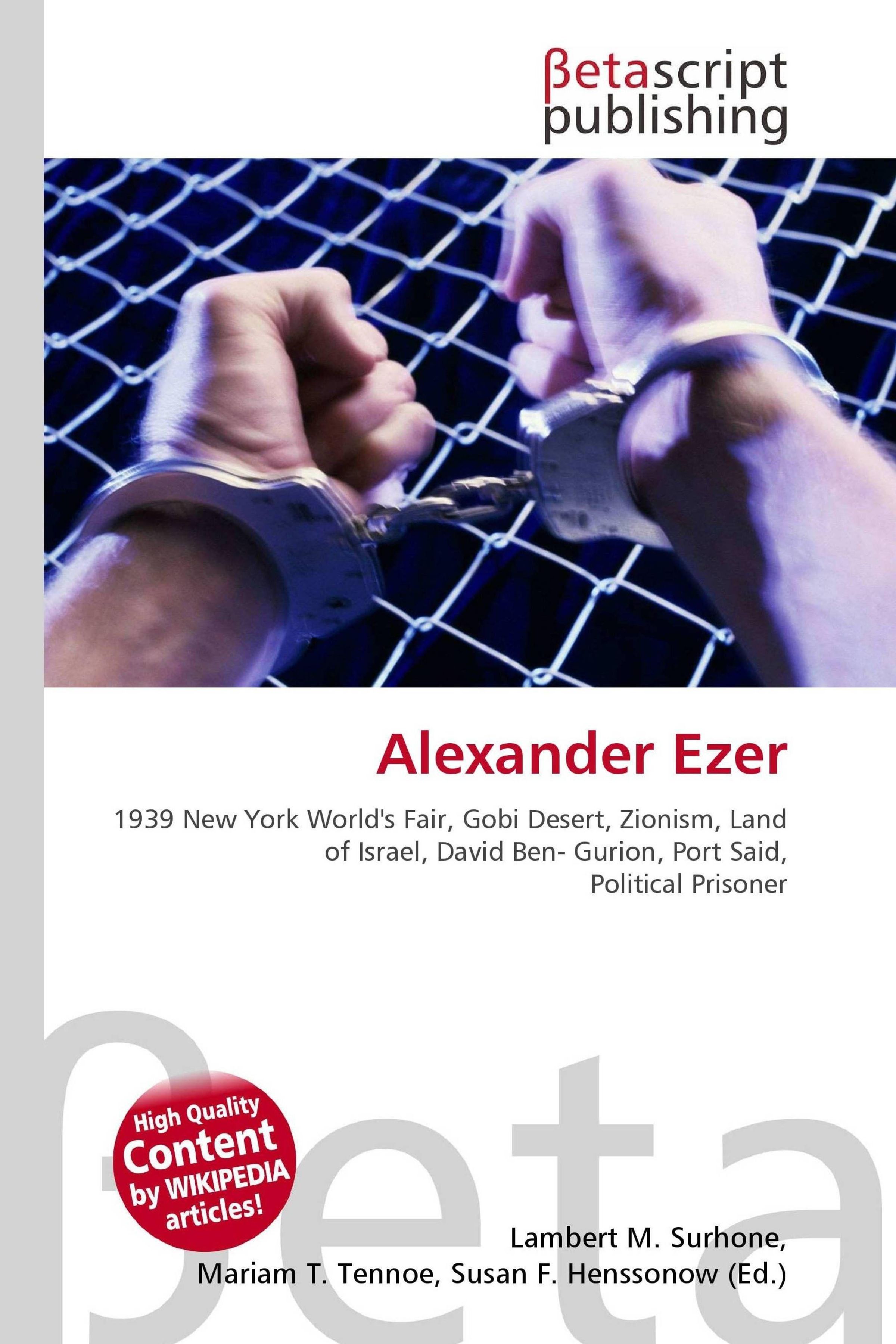 Please note that the content of this book primarily consists of articles available from Wikipedia or other free sources online. Alexander (Evserov) Ezer (1894-1973) was the first secretary of tourism of Israel. He is also known for helping manage the Middle Eastern section of the 1939 New York World's Fair and for helping manage the world famous Levant Industrial Fairs. He also built the Binyanei Ha'uma conference center. He was an active Zionist who published many books about industry and agriculture. In the 1930's he was named one of the 2, 000 most influential men in the world. His lifelong dream was to see the deserts of Israel bloom.