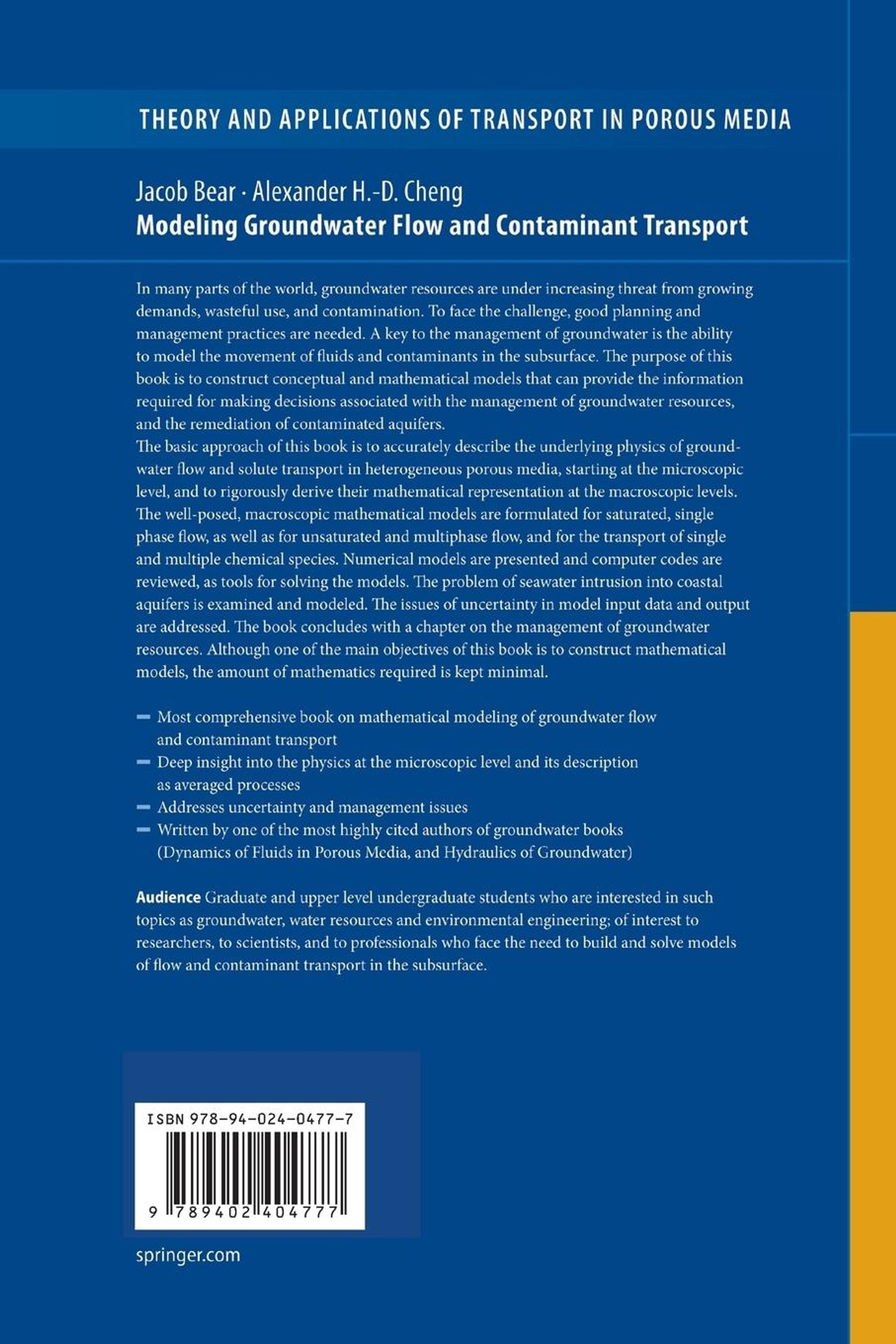 This is the most comprehensive book on mathematical modeling of groundwater flow and contaminant transport. It is written by one of the most highly cited authors of groundwater books (Dynamics of Fluids in Porous Media, and Hydraulics of Groundwater). Its purpose is to construct conceptual and mathematical models that can provide the information required for making decisions associated with the management of groundwater resources, and the remediation of contaminated aquifers. The basic approach of the book is to accurately describe the underlying physics of groundwater flow and solute transport in heterogeneous porous media, starting at the microscopic level, and to rigorously derive their mathematical representations at the macroscopic level. However, the amount of mathematical knowledge required is kept minimal. Occasionally, mathematical help is provided.