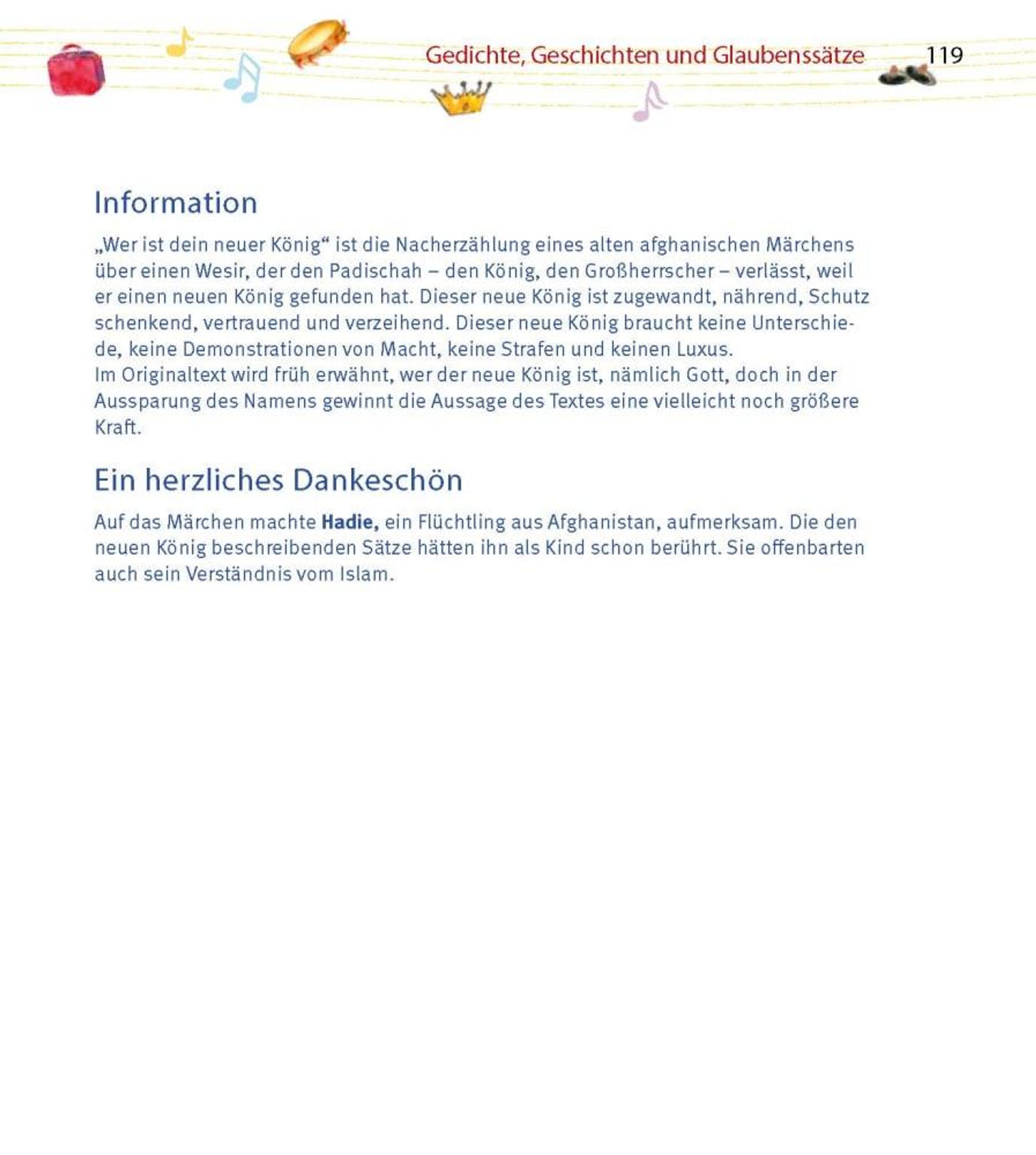 Für die Geschichten und Lieder der verschiedenen Religionen stehen bekannte Persönlichkeiten Pate: Seyran Ate, Esther Bejarano, Wilfried Hiller, Daniel Hope, Lamya Kaddor, Margot Käßmann, Greta Klingsberg, Karl-Josef Kuschel, Cem Özdemir, Josef Schuster, Christa Spannbauer, Fredrik Vahle und Rolando Villazón. In kurzen Statements erzählen sie, warum ihnen diese Texte für die Zukunft unserer Kinder in der einen Welt am Herzen liegen. Die Lieder werden in deutscher Sprache und zum Teil in Originalsprache, Lautsprache und Übersetzung angeboten.