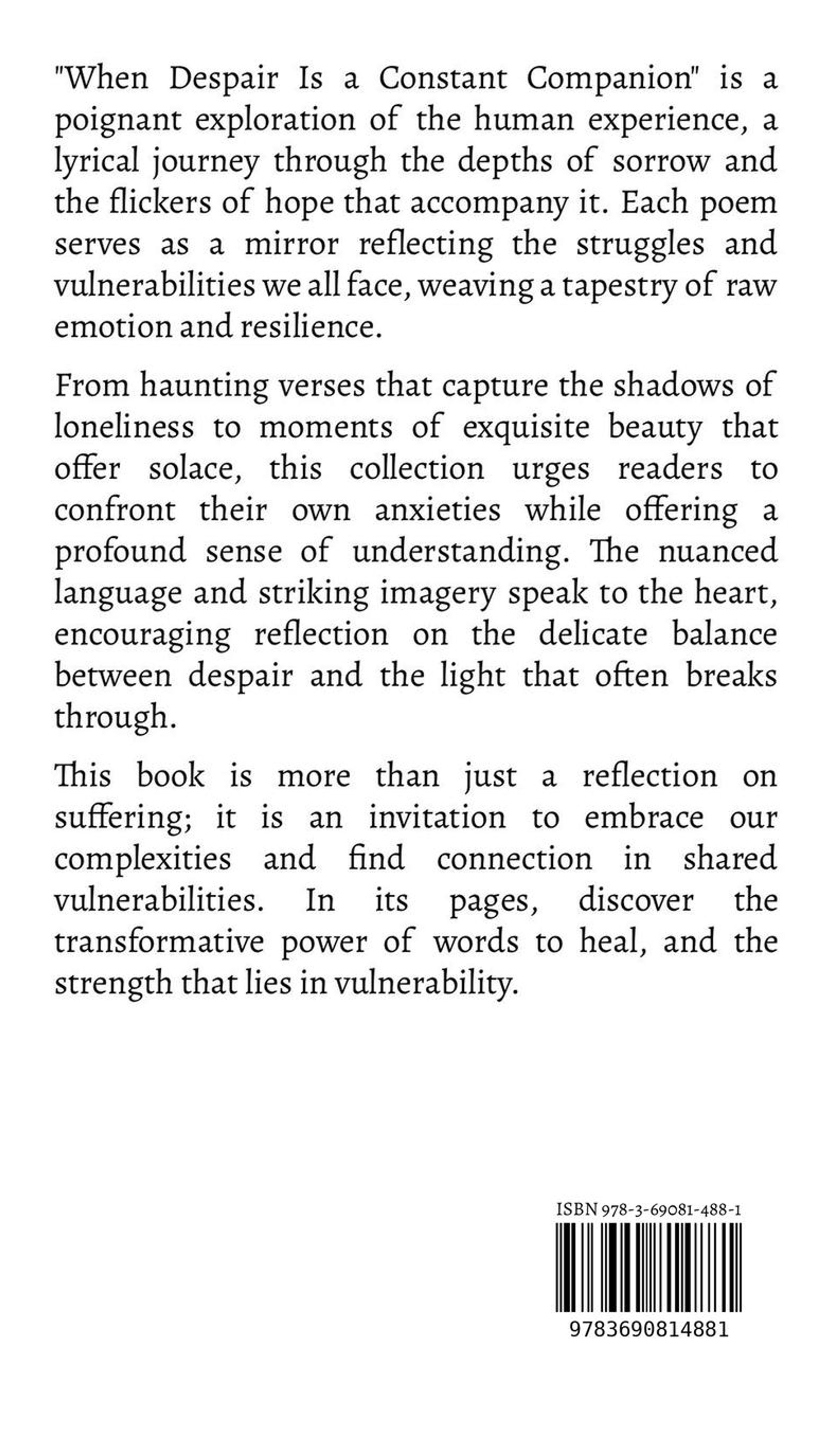 "When Despair Is a Constant Companion" is a poignant exploration of the human experience, a lyrical journey through the depths of sorrow and the flickers of hope that accompany it. Each poem serves as a mirror reflecting the struggles and vulnerabilities we all face, weaving a tapestry of raw emotion and resilience. From haunting verses that capture the shadows of loneliness to moments of exquisite beauty that offer solace, this collection urges readers to confront their own anxieties while offering a profound sense of understanding. The nuanced language and striking imagery speak to the heart, encouraging reflection on the delicate balance between despair and the light that often breaks through. This book is more than just a reflection on suffering; it is an invitation to embrace our complexities and find connection in shared vulnerabilities. In its pages, discover the transformative power of words to heal, and the strength that lies in vulnerability.