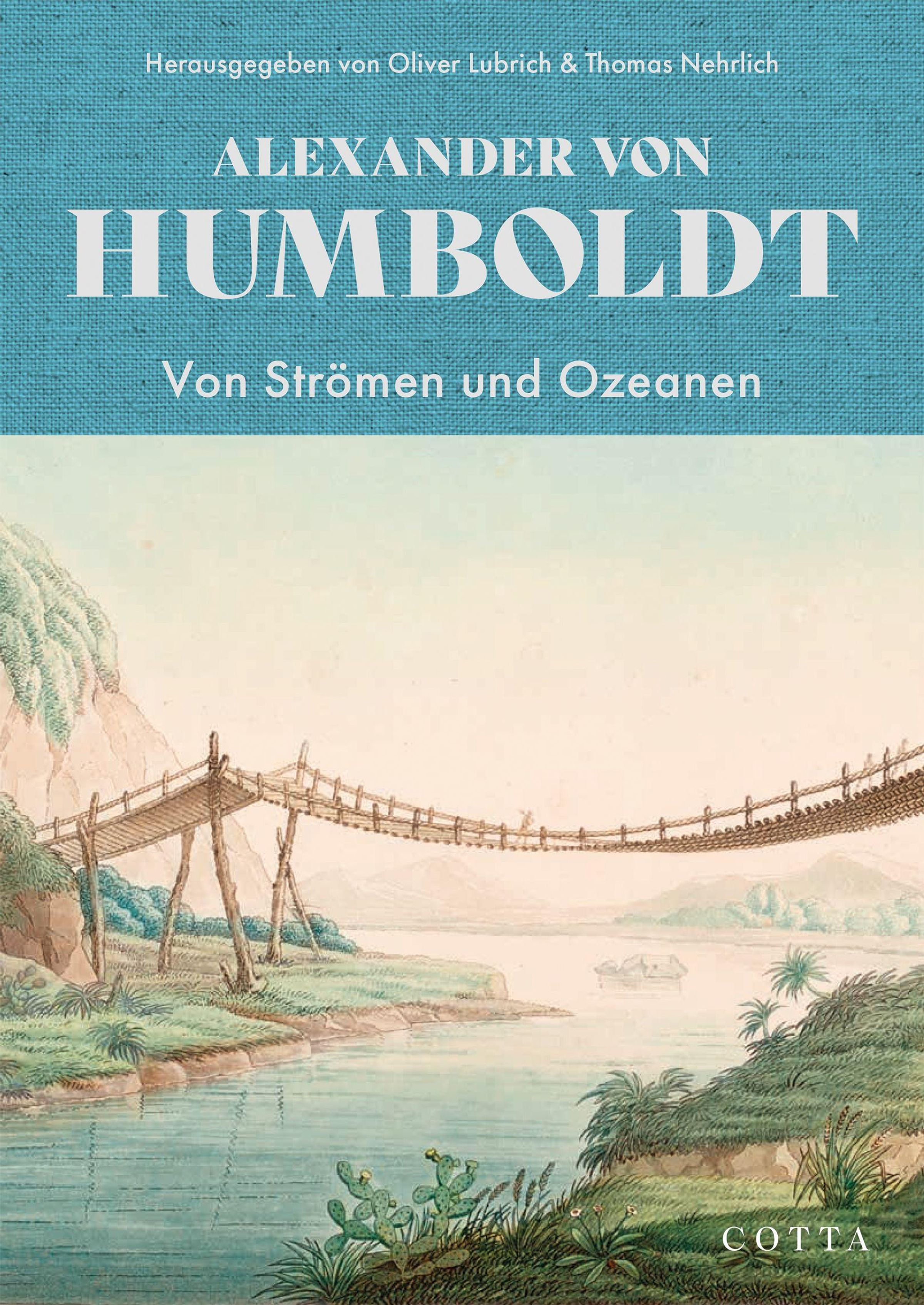 „Alexander von Humboldt: Von Strömen und Ozeanen“. Illustration einer Seilbrücke über einen Fluss, umgeben von Natur., Buch