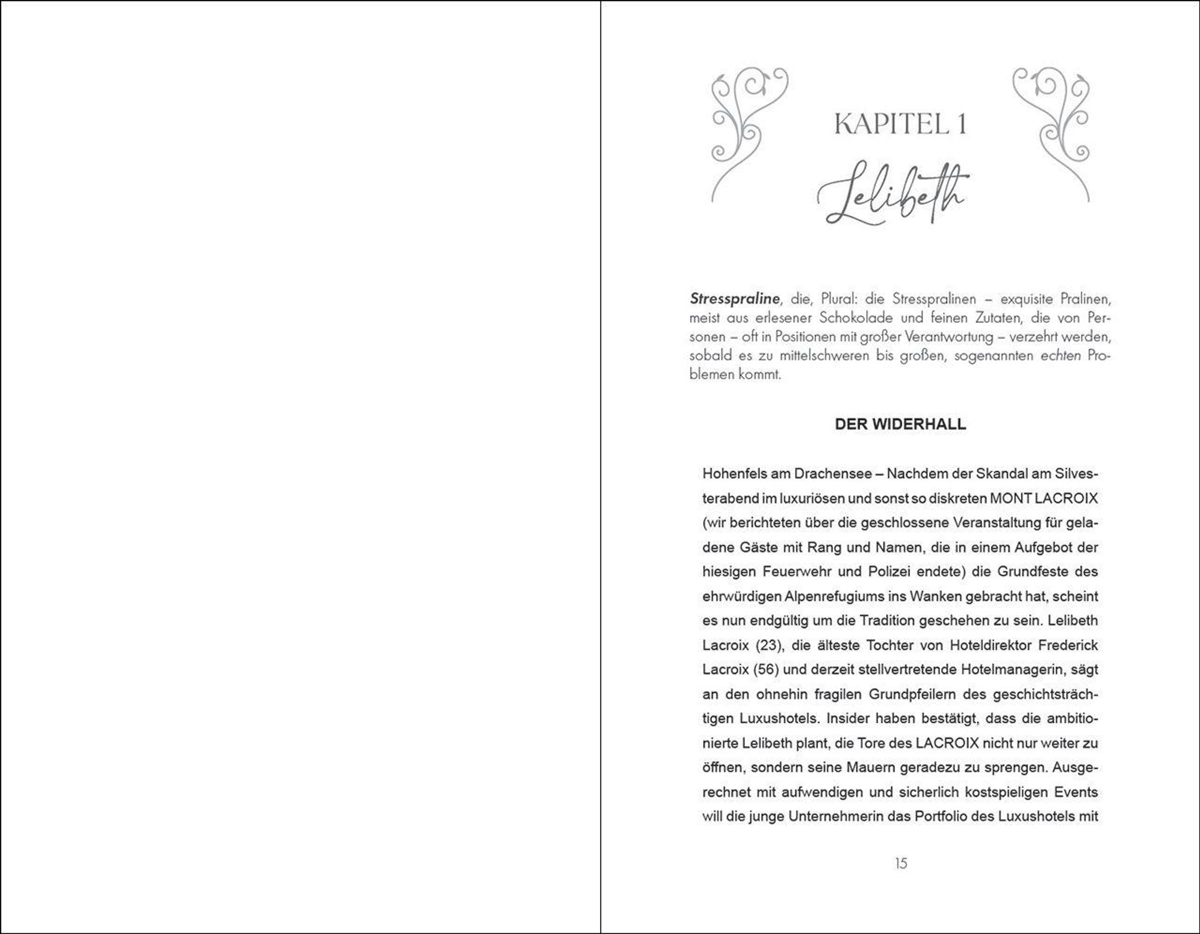 Sie lebt für das Hotel ihrer Familie. Er soll es ruinieren. Umgeben von malerischen Bergen liegt das Luxushotel Mont Lacroix. Doch für die angehende Hotelmanagerin Lelibeth ist es mehr als das - es ist ihr Zuhause. Um sich dort zu beweisen, möchte sie erstmals in der Geschichte des Hotels eine exklusive Hochzeit ausrichten, und dafür braucht sie einen Floristen. Als sie nur Absagen erhält, scheint ausgerechnet Noah Benz die einzige Option. Noah, der nicht nur deutlich macht, was er von ihrem Plan hält - nämlich gar nichts -, sondern ihr auch ungewollt viel zu sehr unter die Haut geht. Und der ein Geheimnis hat: Er ist der Sohn ihres größten Konkurrenten ...