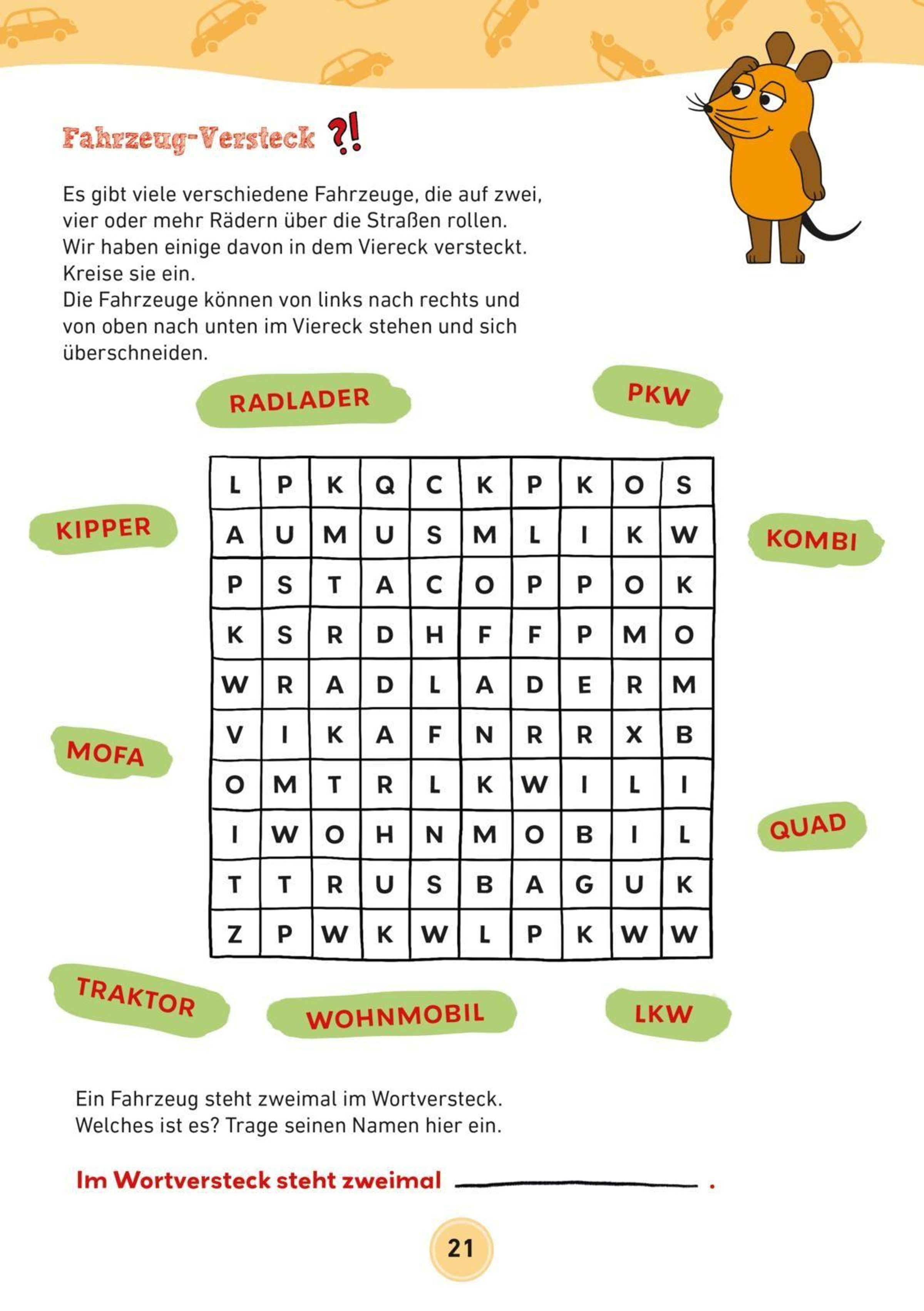 Ein bunter Rätselblock mit der Maus für Kinder ab 6 Jahren. Mit Quizfragen, Labyrinthen, Wortspielen und vielen anderen Rätseln rund um Fahrzeuge und Verkehr. Spielerisch lernen Kinder spannende Fakten über Fahrzeuge und Verkehr. Malaufgaben und Scherzfragen sorgen für Abwechslung. Ideal für unterwegs - so wird jede Reise zum Vergnügen.
