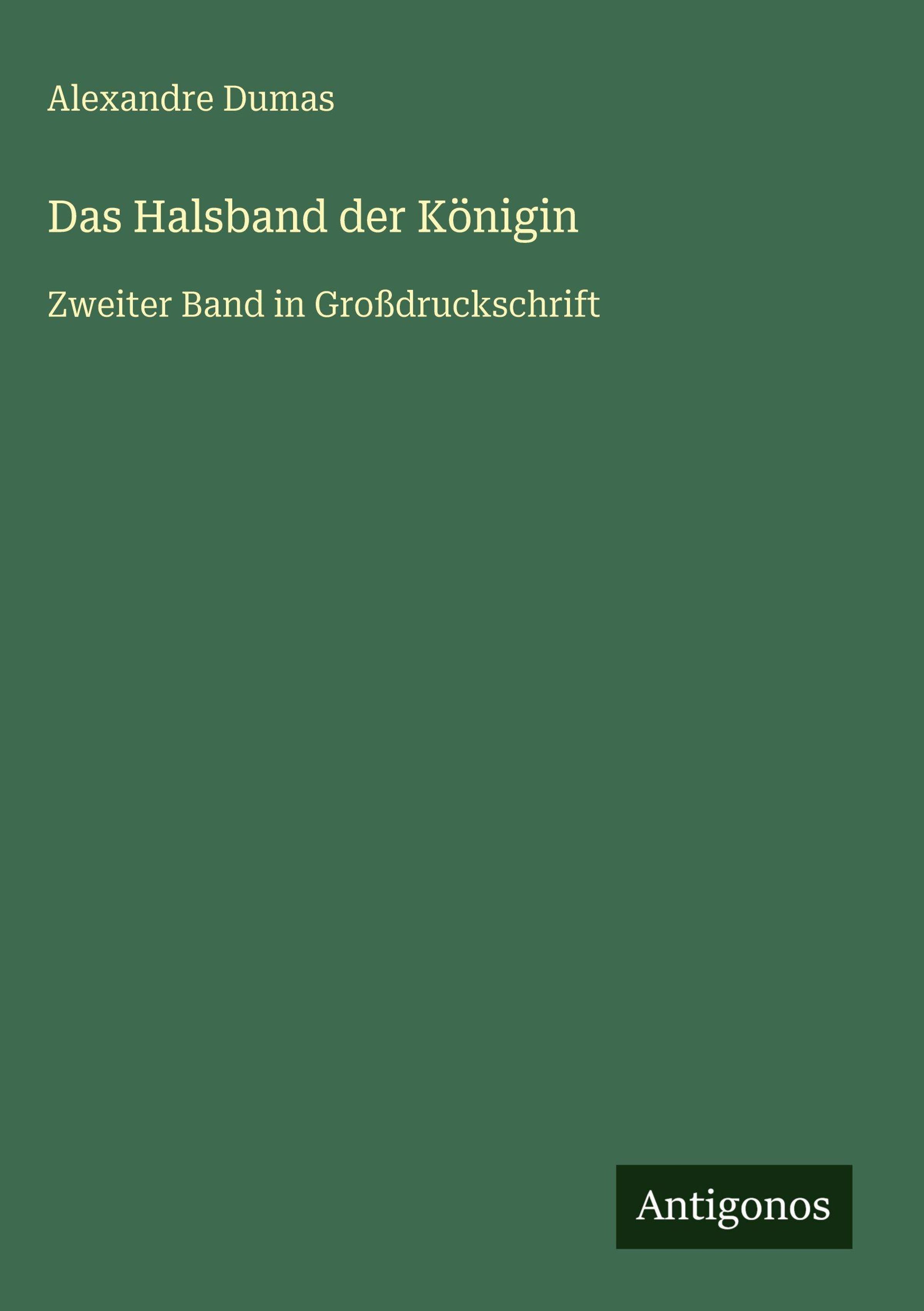 Titel: "Das Halsband der Königin"; Autor: Alexandre Dumas; "Zweiter Band in Großdruckschrift". Unten steht "Antigonos"., Buch