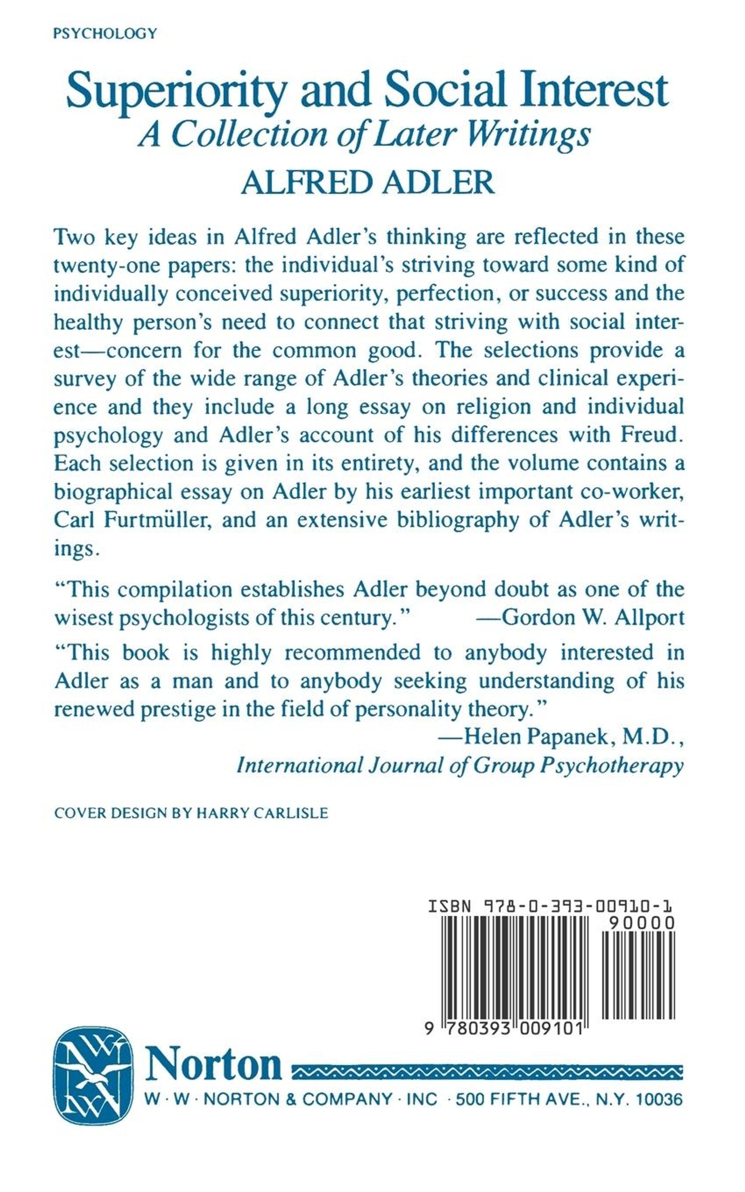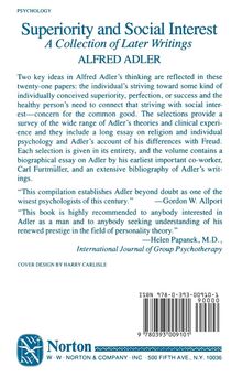 Two key ideas in Alfred Adler's thinking are reflected in these twenty-one papers: the individual's striving toward some kind of individually conceived superiority, perfection, or success and the healthy person's need to connect that striving with social interest-concern for the common good. The selections provide a survey of the wide range of Adler's theories and clinical experience and they include a long essay on religion and individual psychology and Adler's account of his differences with Freud. Each selection is given in its entirety, and the volume contains a biographical essay on Adler by his earliest important co-worker, Carl Furtmüller, and an extensive bibliography of Adler's writings.