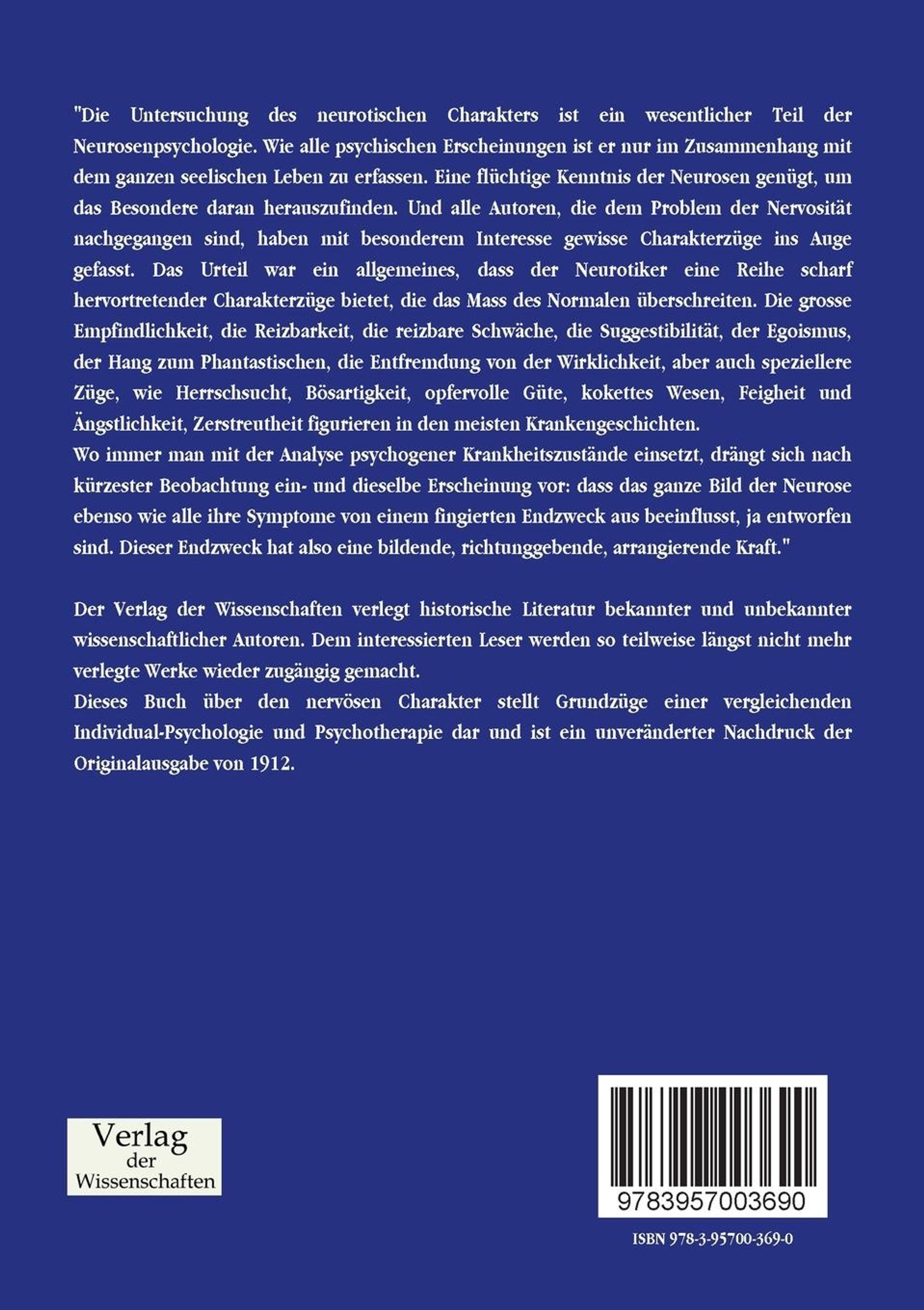 Der Verlag der Wissenschaften verlegt historische Literatur bekannter und unbekannter wissenschaftlicher Autoren. Dem interessierten Leser werden so teilweise längst nicht mehr verlegte Werke wieder zugängig gemacht. Dieses Buch über den nervösen Charakter stellt Grundzüge einer vergleichenden Individual-Psychologie und Psychotherapie dar und ist ein unveränderter Nachdruck der Originalausgabe von 1912.