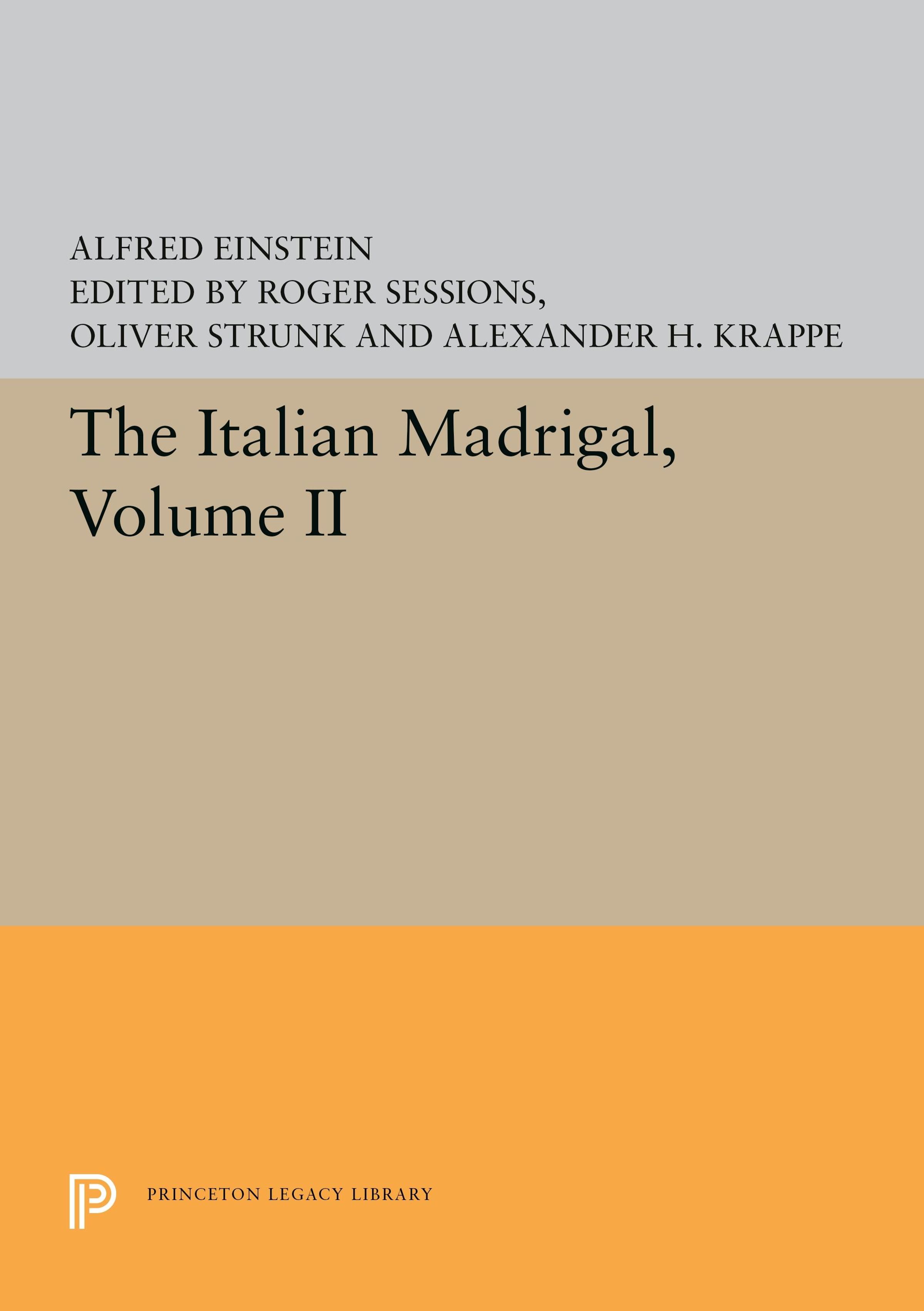 Volume 2 of 3. This monumental three-volume work on the Italian madrigal from its beginnings about 1500 to its decline in the 17th century is based on the research of 40 years, and is a cultural history of the development of Italian music. Mr. Einstein, renowned musicologist, supplies a background and a sense of proportion to the field: he gives the right order to the single composers in the evolution fo the madrigal, attaches new values to old names, and places in the foreground the outstanding, but until now rather neglected, personality of Cipriano de Rore. His work is not, however, purely musicological; his object is to inquire into the functions of secular music in Italian life during the Cinquecento, and to contribute to our knowledge and understanding of that great century in general. Translated from the German by Oliver Strunk, Roger Sessions and Alexander H. Krappe.