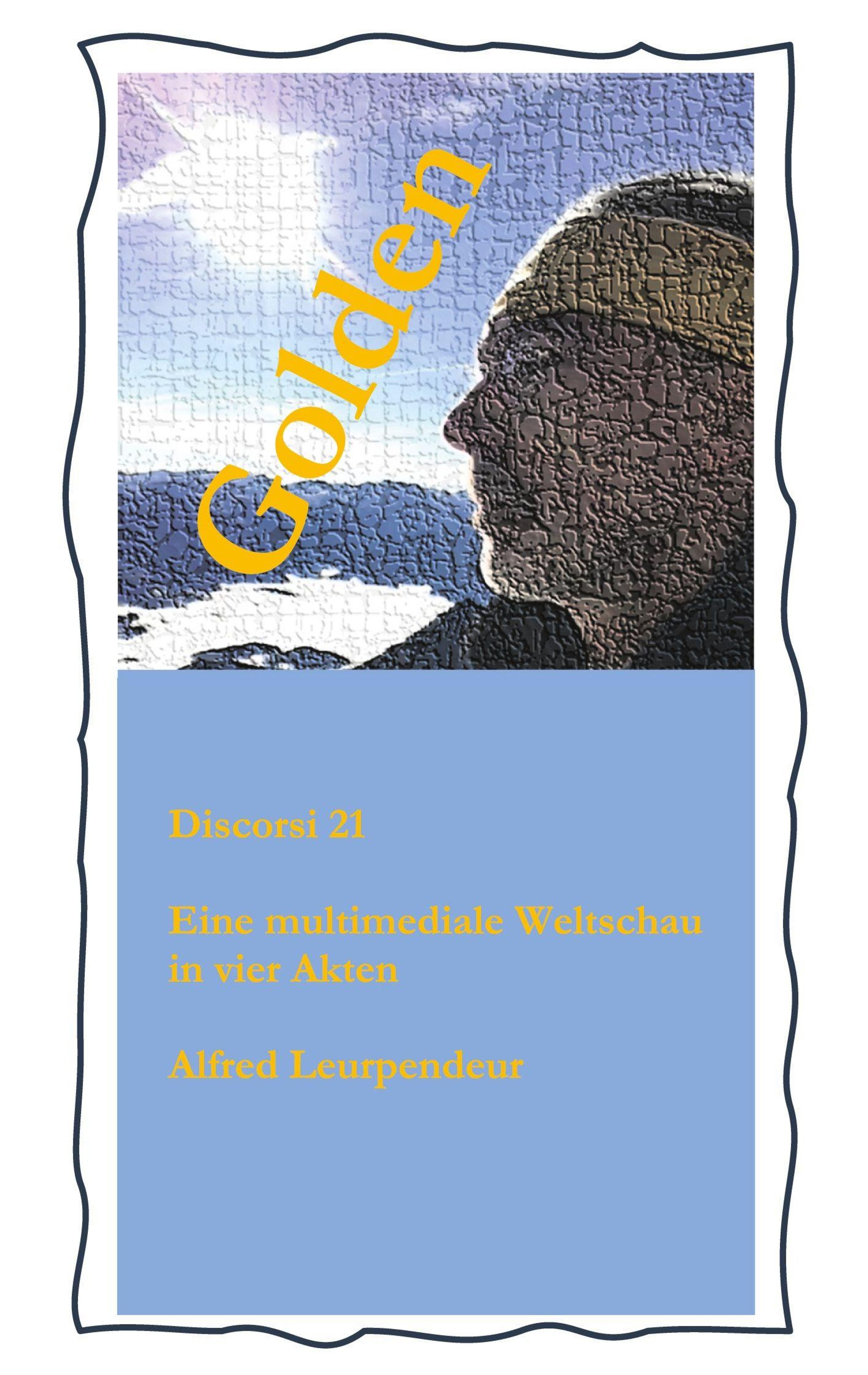 Der Text lautet: "Golden", "Discorsi 21", "Eine multimediale Weltschau in vier Akten", "Alfred Leurpendeur". Ganzseitige Illustration., Buch