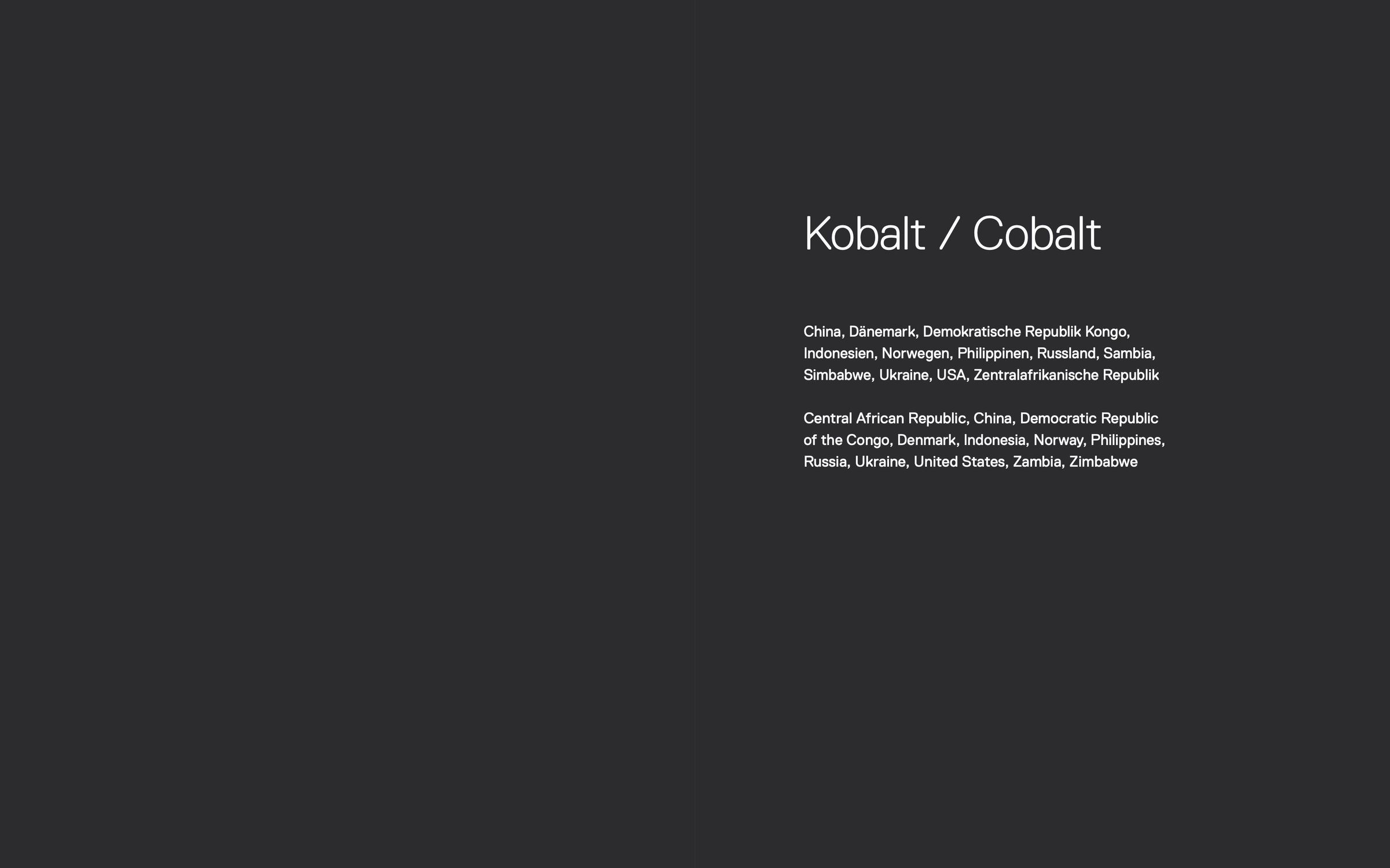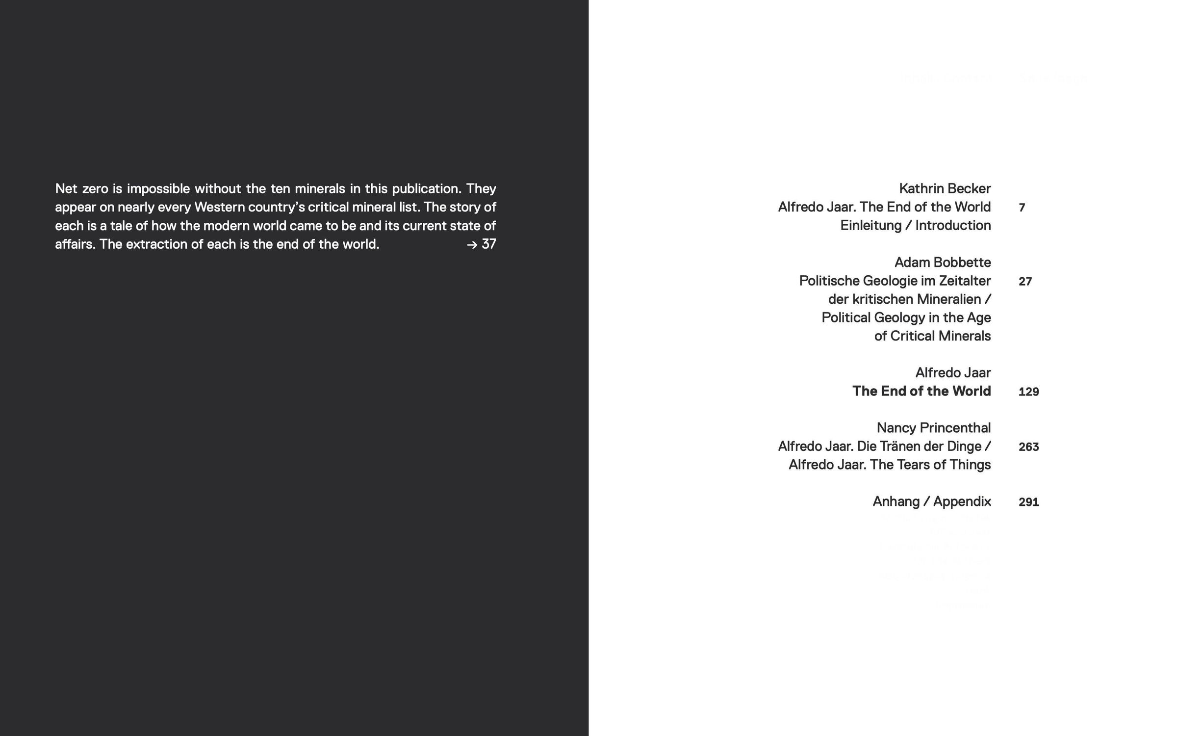 In The End of the World, which grew out of a multi-year research project assisted by the human geographer and political geologist Adam Bobbette, Jaar shines a spotlight on the struggle for resources, which is a central and ever more salient factor in international conflicts. The site-specific work, a cube measuring 4 × 4 × 4 centimeters, is composed of several such resources: cobalt, rare earths, copper, tin, nickel, lithium, manganese, coltan, germanium, and platinum. These ten strategic metals are of vital importance in the fields of digital technology and electromobility, for high-tech applications and storage media. As demand for them has grown steadily, their extraction has been accompanied by massive human rights violations and environmental destruction. Jaar astutely observes these lines of conflict that convulse our planet. His artistic research is complemented by essays by Adam Bobbette and Nancy Princenthal and an introduction by Kathrin Becker.