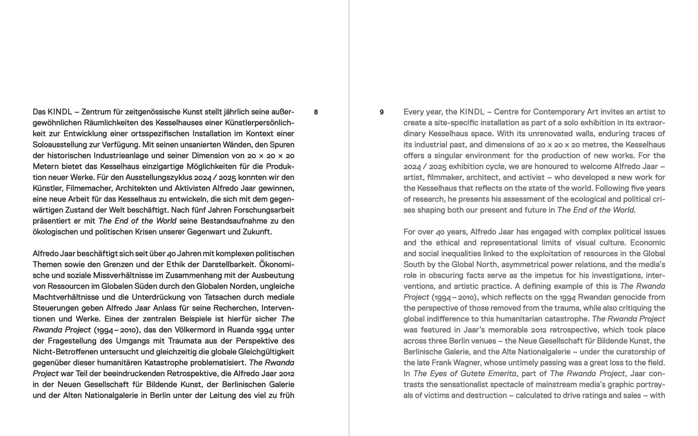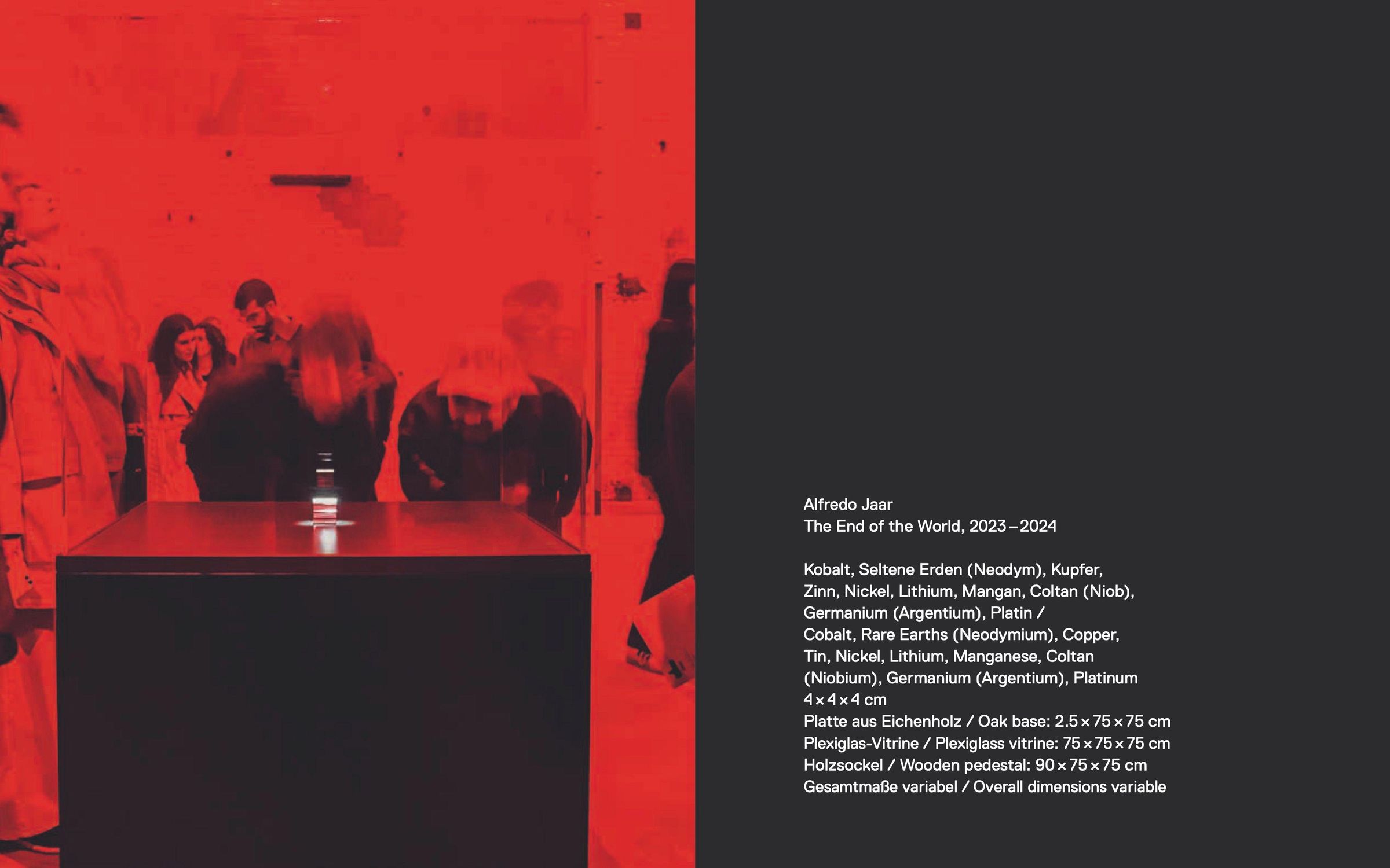 Mit The End of the World, dem mehrjährige Recherchen mit Unterstützung des Humangeografen und politischen Geologen Adam Bobbette vorausgingen, wirft Jaar ein Schlaglicht auf den Kampf um Ressourcen, der ein wesentlicher und in seiner Bedeutung steigender Faktor im internationalen Konfliktgeschehen ist. Die ortsspezifische Arbeit, ein 4 × 4 × 4 cm großer Würfel, ist zusammengesetzt aus den Rohstoffen Kobalt, Seltene Erden, Kupfer, Zinn, Nickel, Lithium, Mangan, Coltan, Germanium und Platin. Diese zehn strategischen Metalle spielen für die Bereiche Digitalisierung und Elektromobilität, für Hightechanwendungen und Speichermedien eine zentrale Rolle. Die Nachfrage danach steigt stetig, ihr Abbau geht mit massiven Menschenrechtsverletzungen und der Zerstörung der Natur einher. Scharfsinnig beobachtet Jaar diese Konfliktlinien, die unseren Planeten erschüttern. Angereichert wird seine künstlerische Recherche durch Essays von Adam Bobbette und Nancy Princenthal und einer Einleitung von Kathrin Becker.