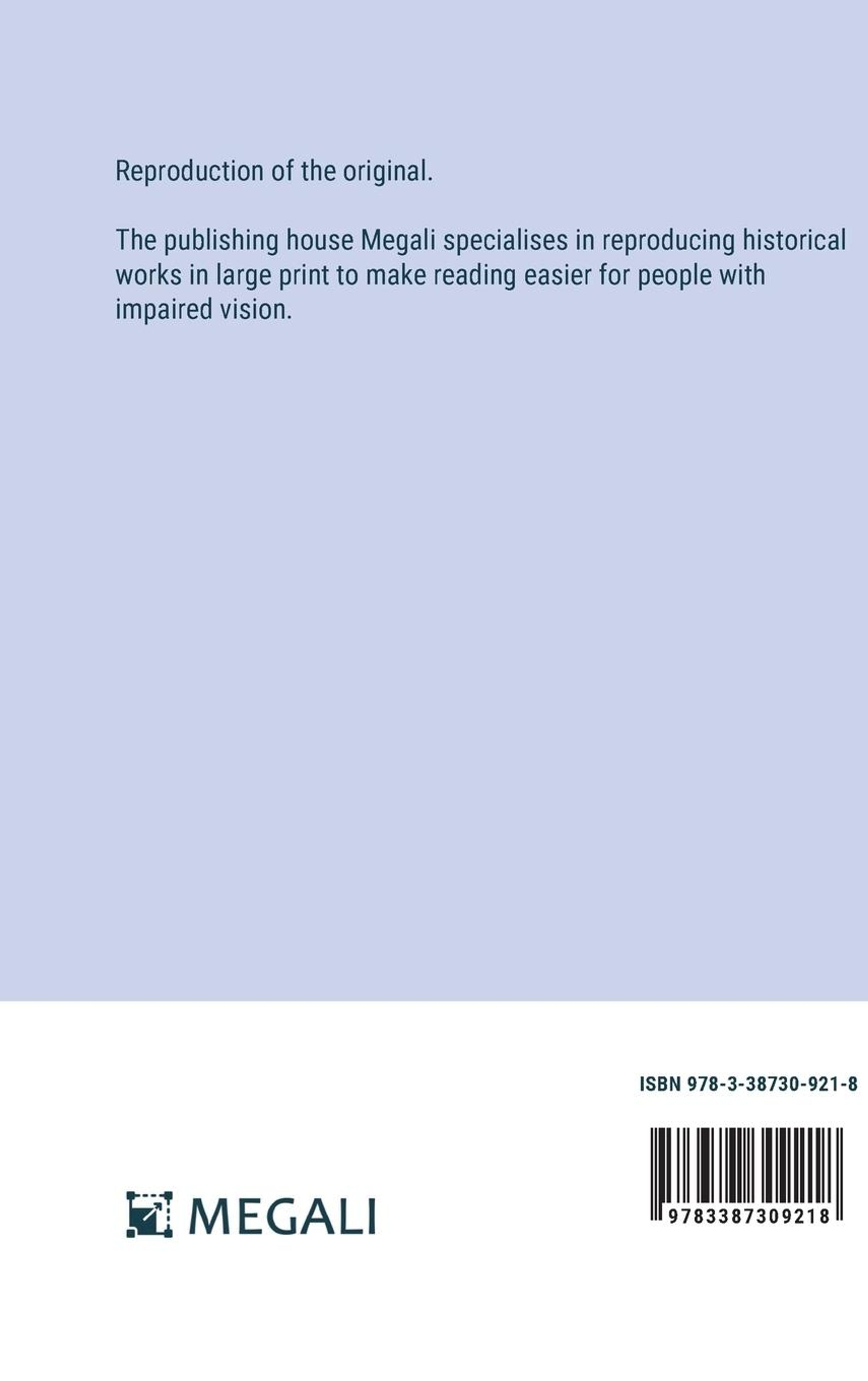 Reproduction of the original. The publishing house Megali specialises in reproducing historical works in large print to make reading easier for people with impaired vision.
