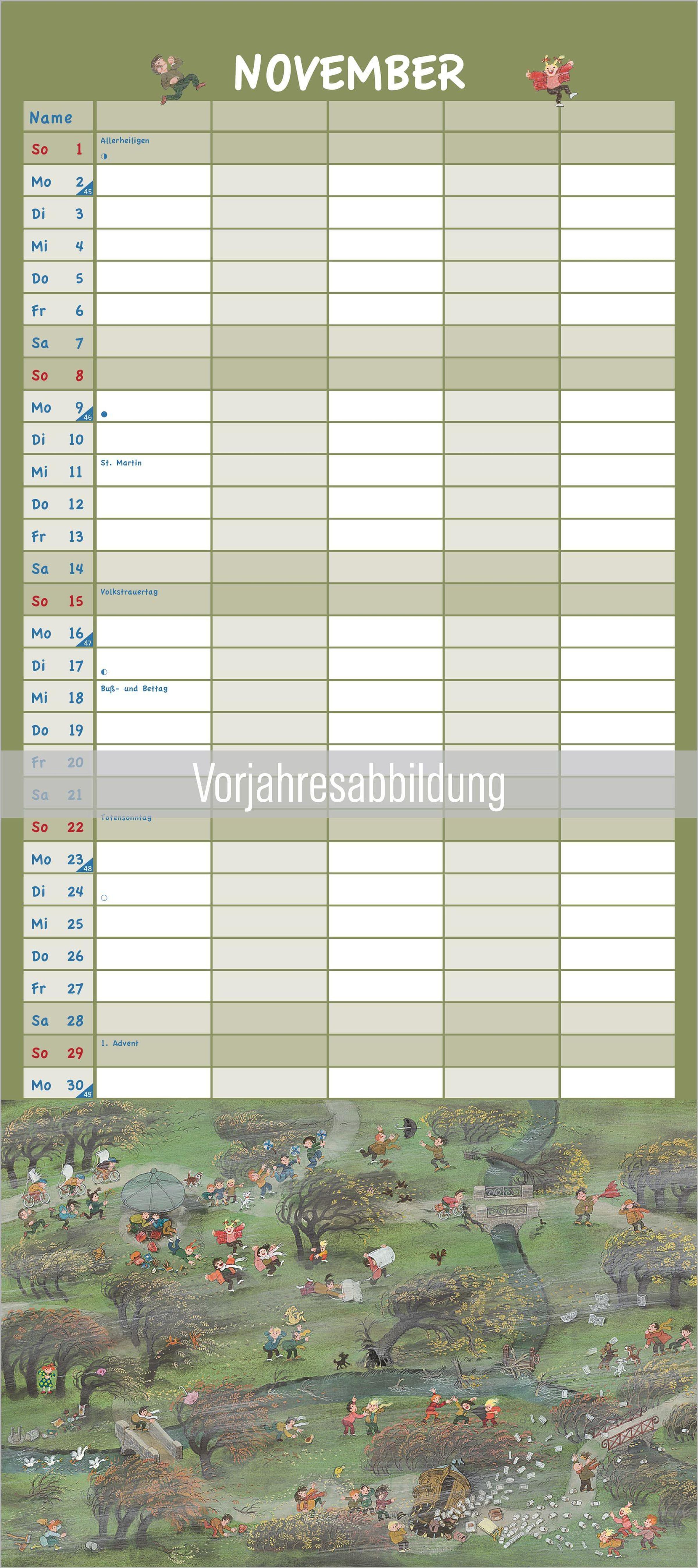 "ALI MITGUTSCH FAMILIEN-KALENDER 2026" in grünem Kalenderformat, Illustration eines belebten Bauernhofs., Kalender