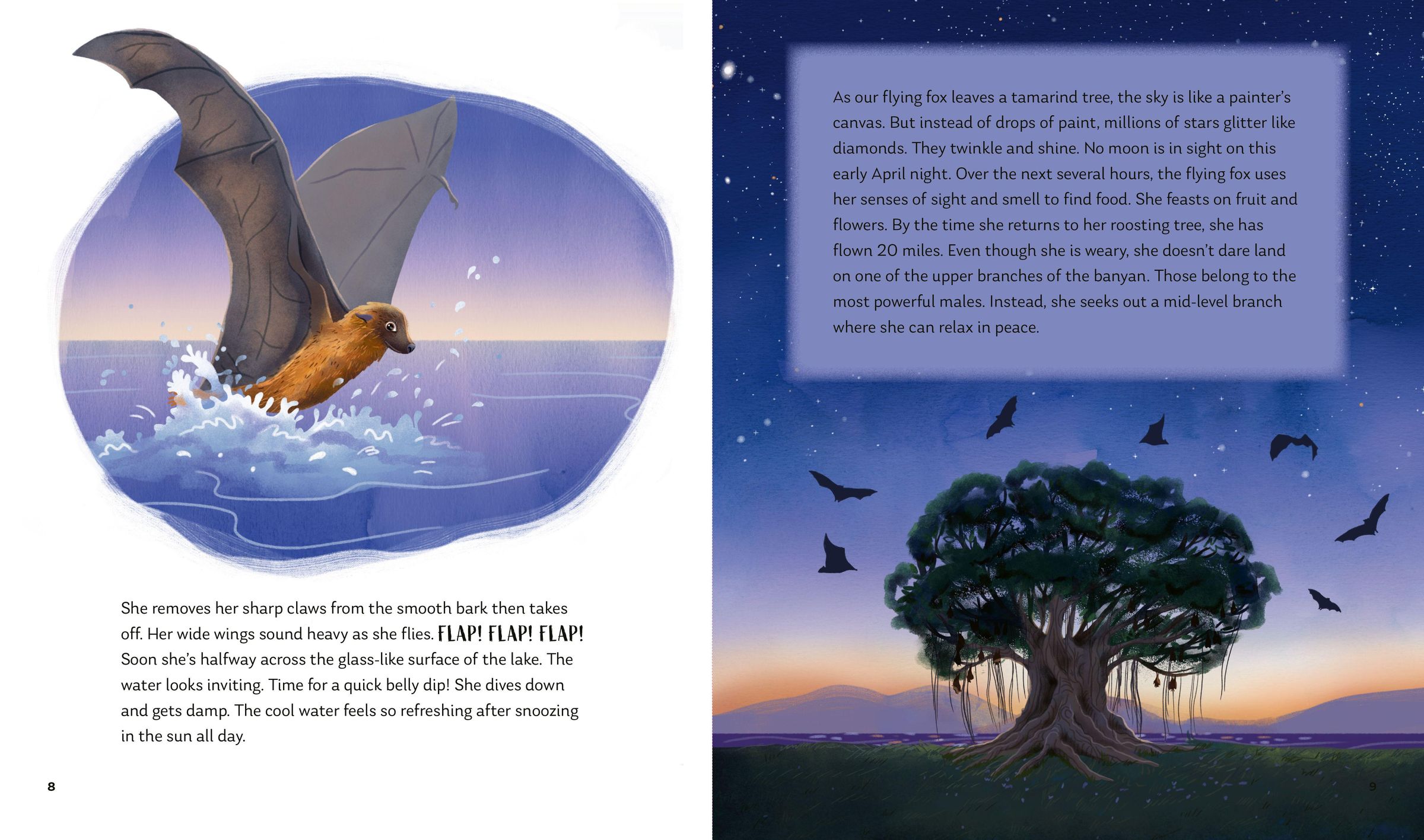 Other stories feature American alligators, Fennec foxes, wombats, snowy owls, bushbabies, flying frogs, luna moths and even a rat making its way across a sleeping city. All of these nighttime animals and their habitats are brought to life with impressive skill by illustrator Jennifer Falkner.