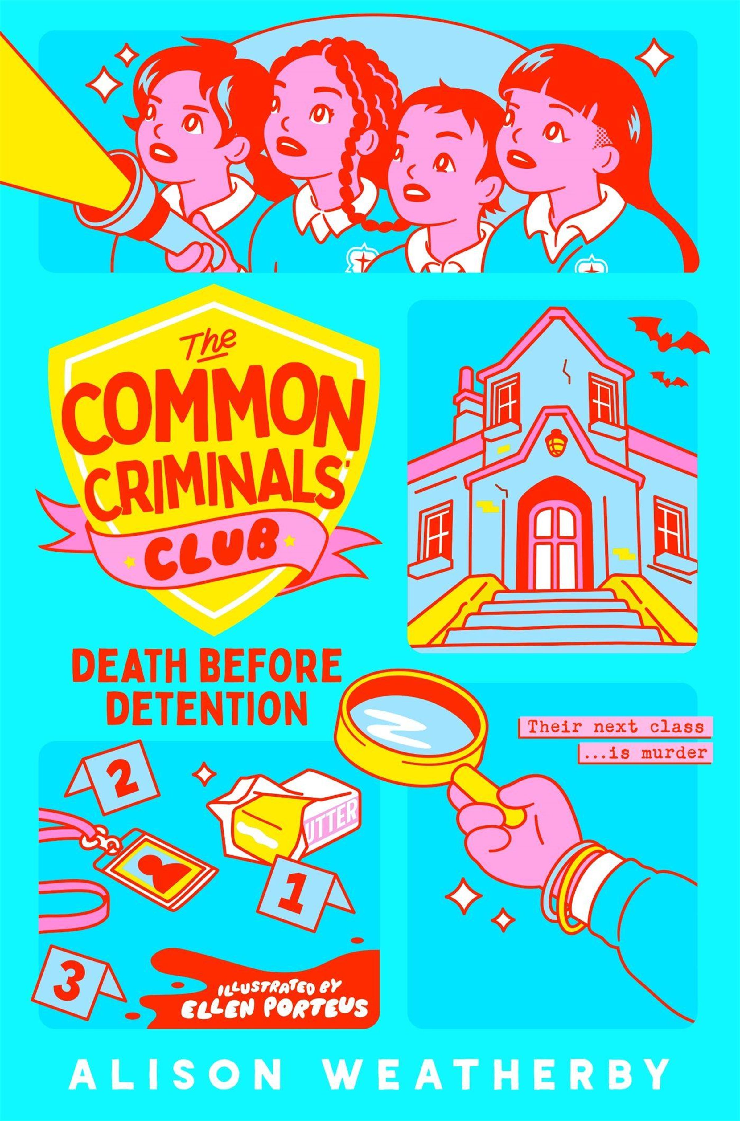 Der Text enthält: "The Common Criminals Club: Death Before Detention". Illustration mit Kindern, einem Haus, Lupe und Hinweiszetteln., Buch