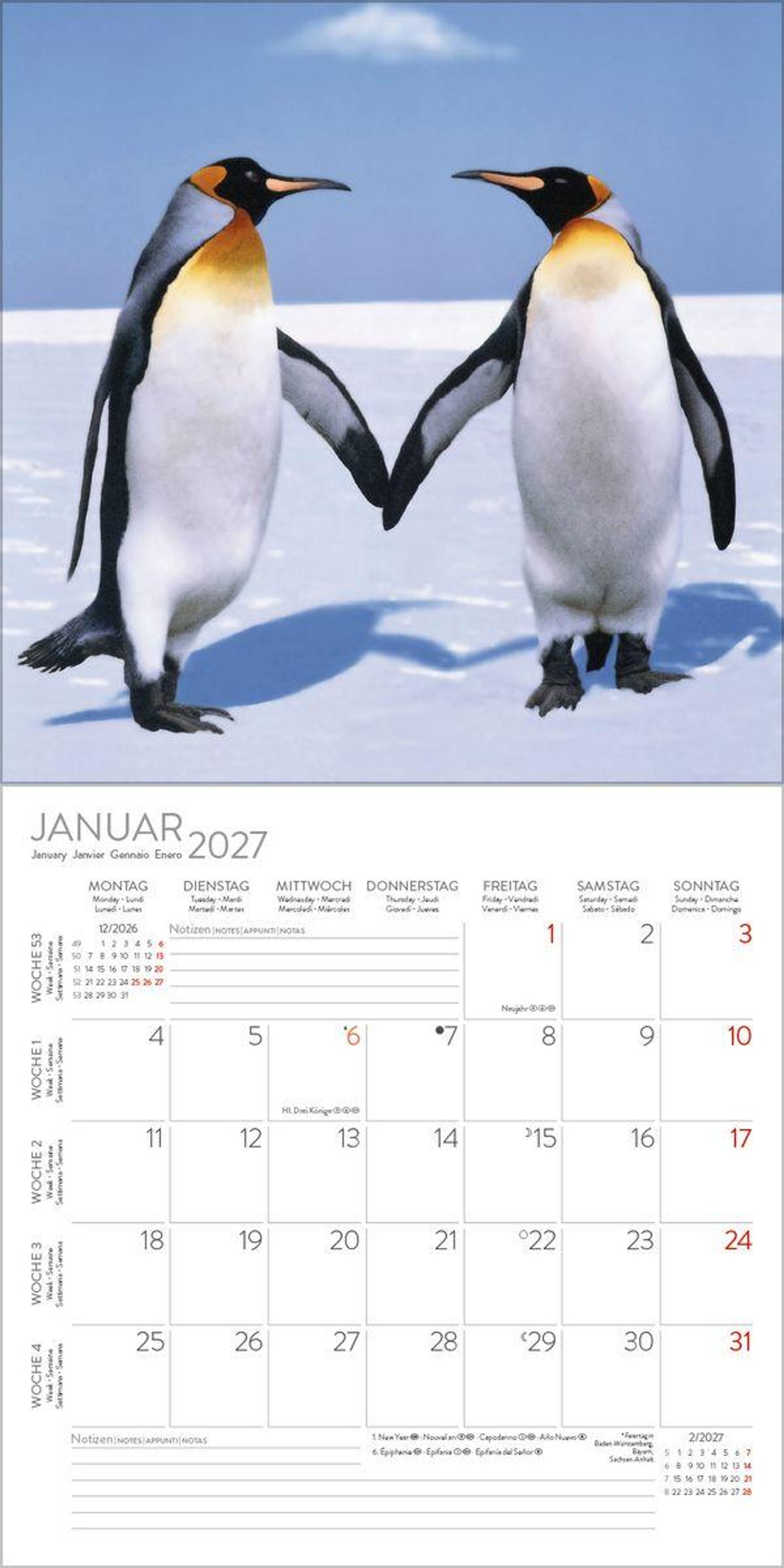 - Jede Kalenderseite mit großem Bild und viel Platz im Kalendarium für Notizen und Termine