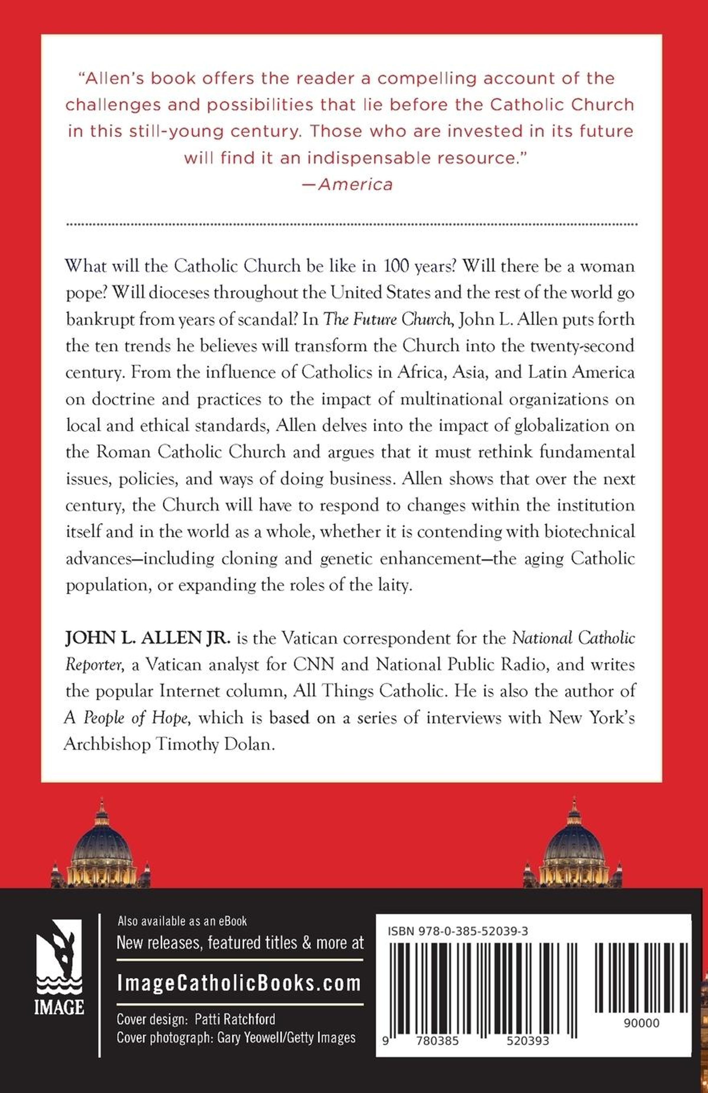What will the Catholic Church be like in 100 years? Will there be a woman pope? Will dioceses throughout the United States and the rest of the world go bankrupt from years of scandal? In THE FUTURE CHURCH, John L. Allen puts forth the ten trends he believes will transform the Church into the twenty-second century. From the influence of Catholics in Africa, Asia, and Latin America on doctrine and practices to the impact of multinational organizations on local and ethical standards, Allen delves into the impact of globalization on the Roman Catholic Church and argues that it must rethink fundamental issues, policies, and ways of doing business. Allen shows that over the next century, the Church will have to respond to changes within the institution itself and in the world as a whole whether it is contending with biotechnical advances---including cloning and genetic enhancement---the aging Catholic population, or expanding the roles of the laity.