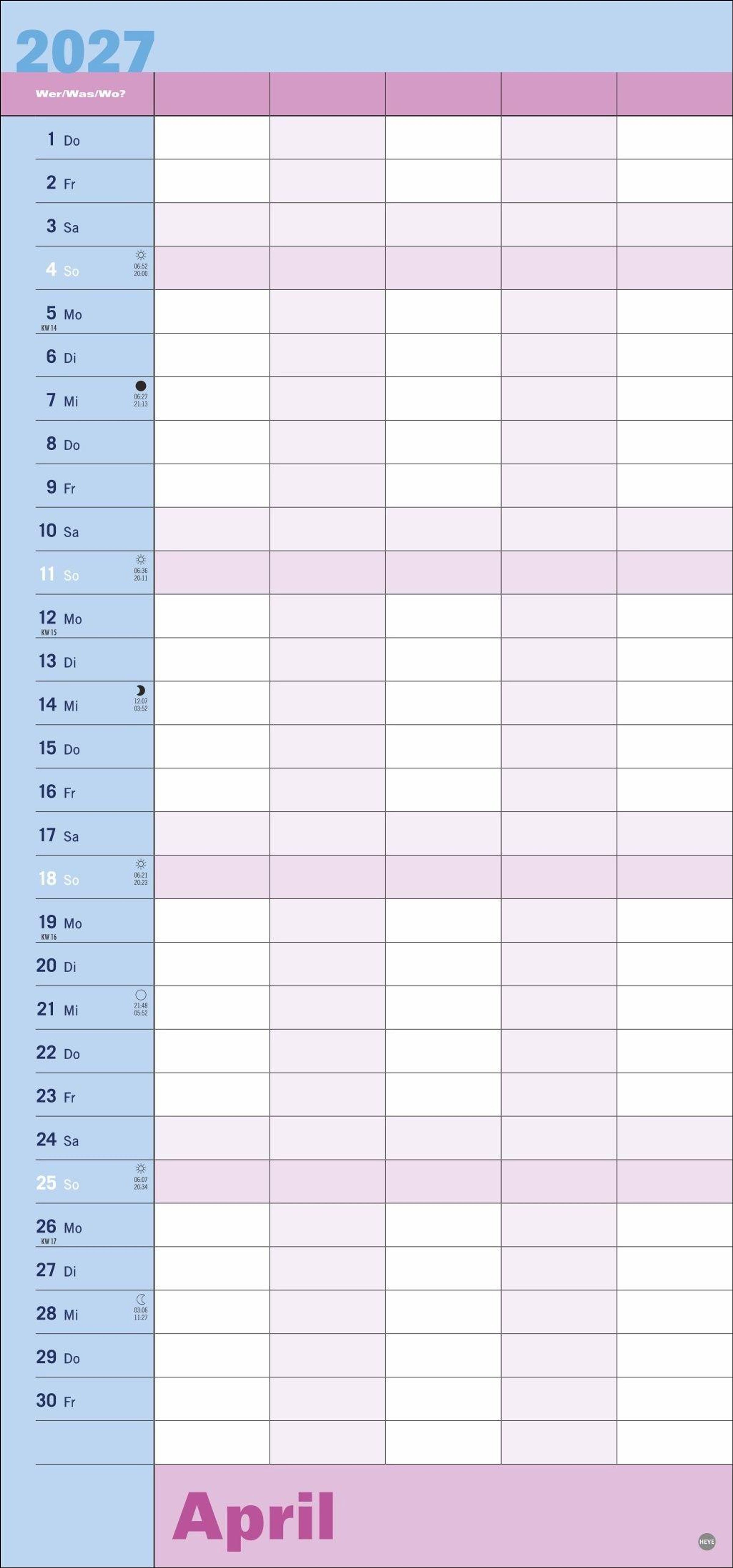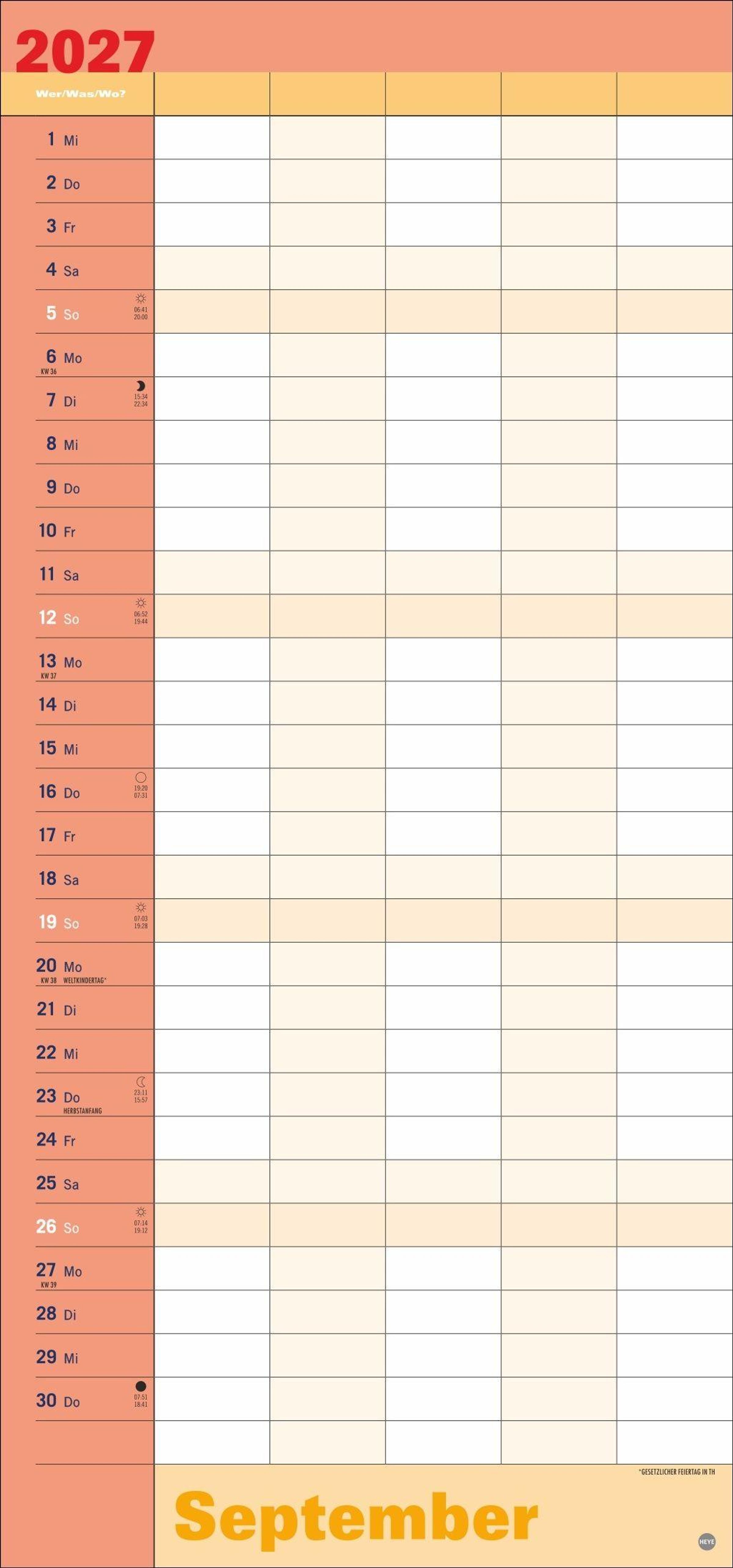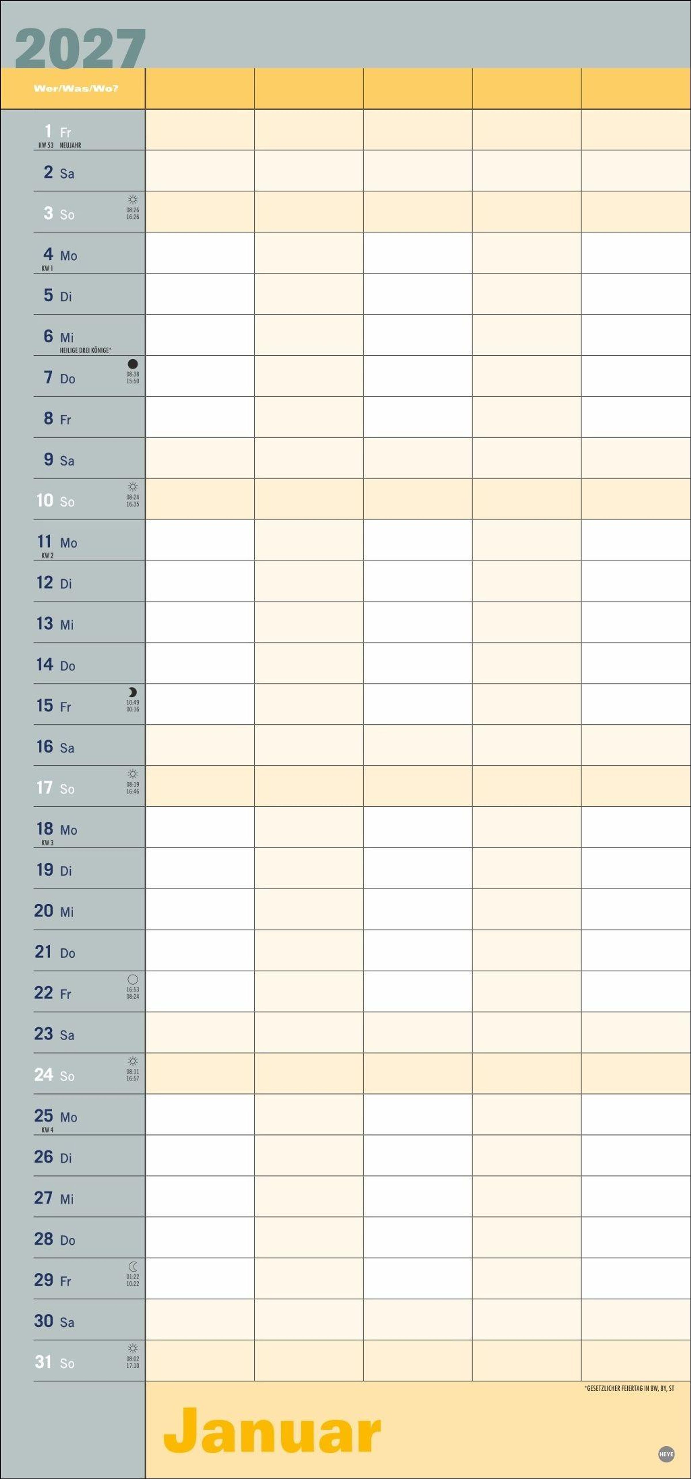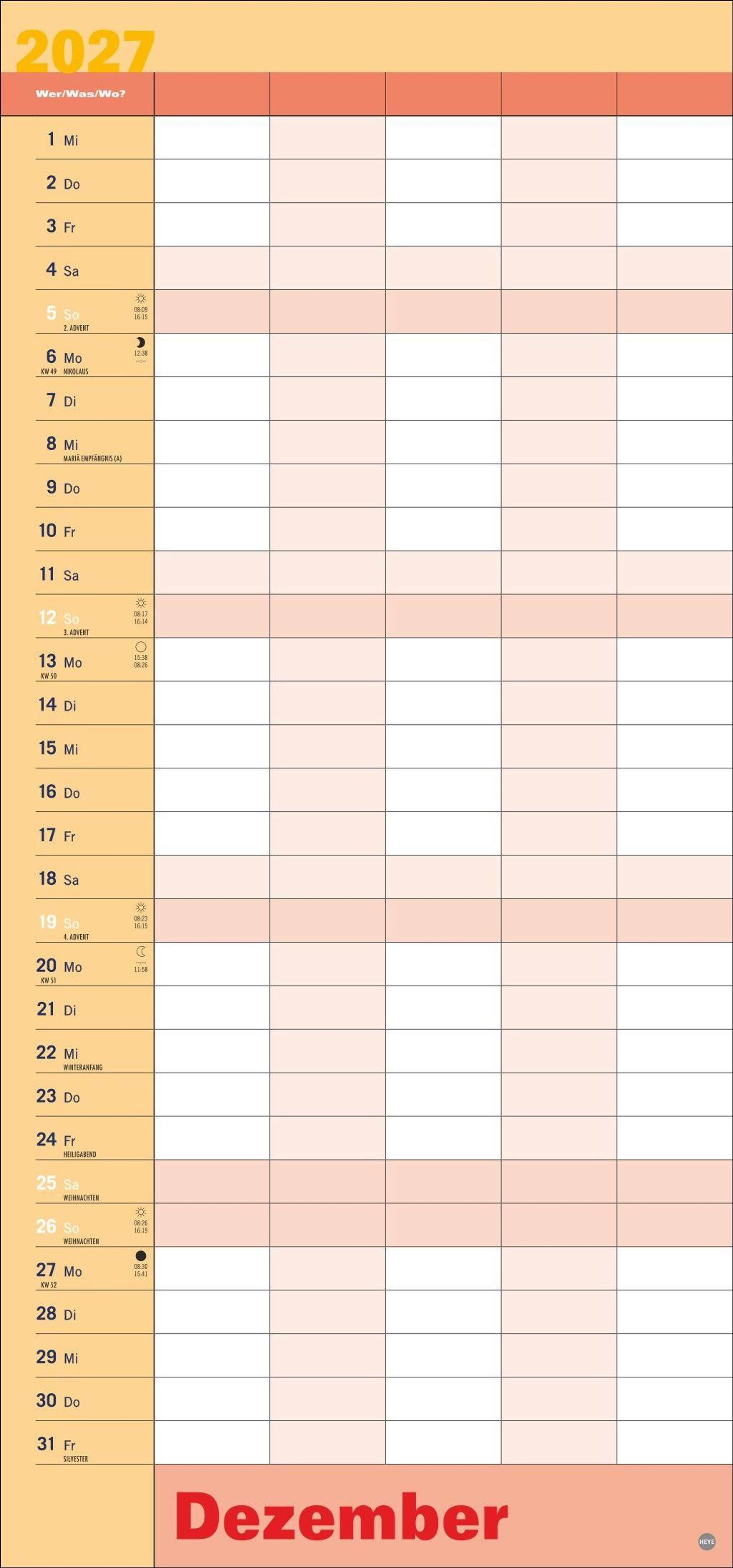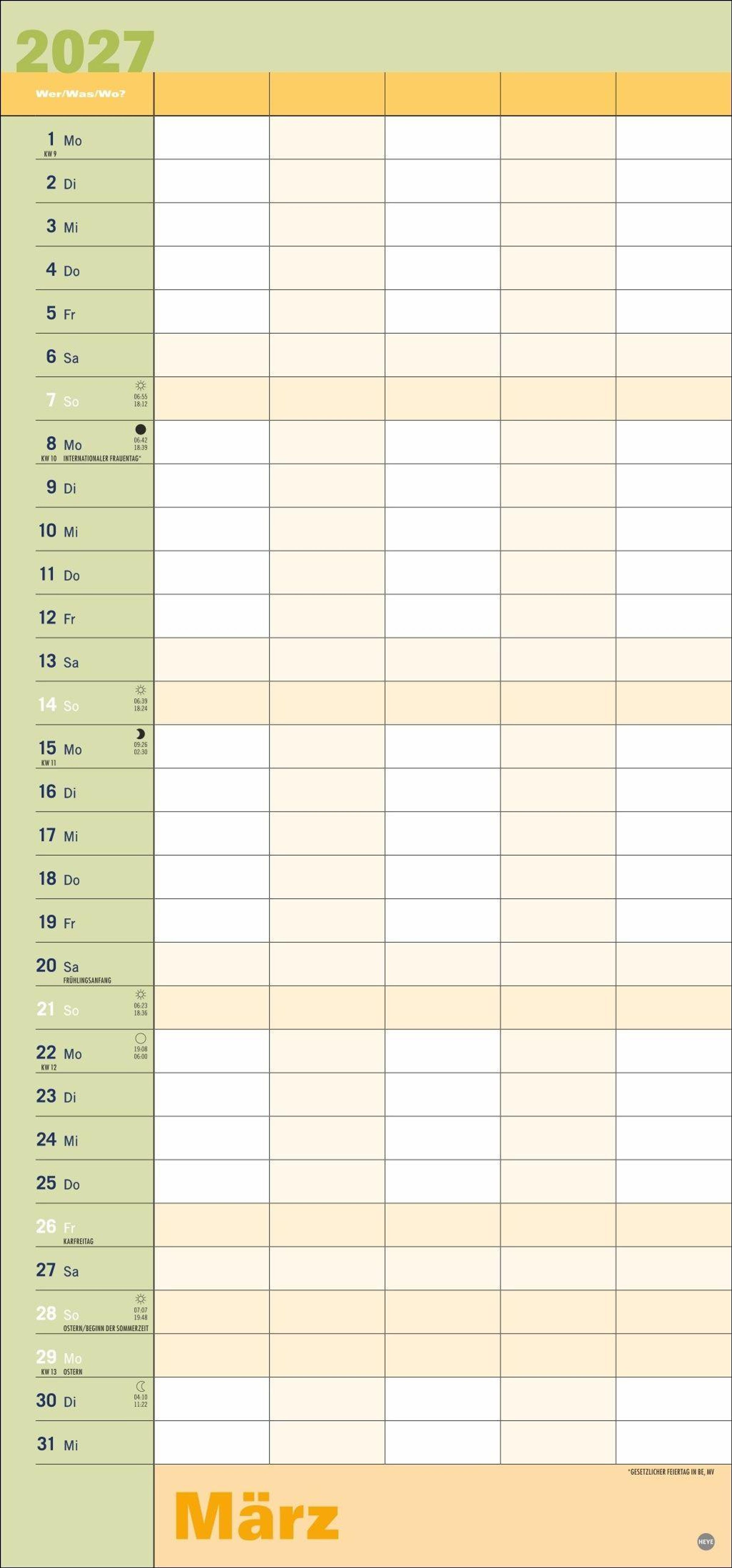 - Praktischer Wandplaner mit 5 Spalten. Wandkalender mit Schulferien und 3-Monats-Ausblick. Termin-Kalender 2027. 21 x 45 cm.