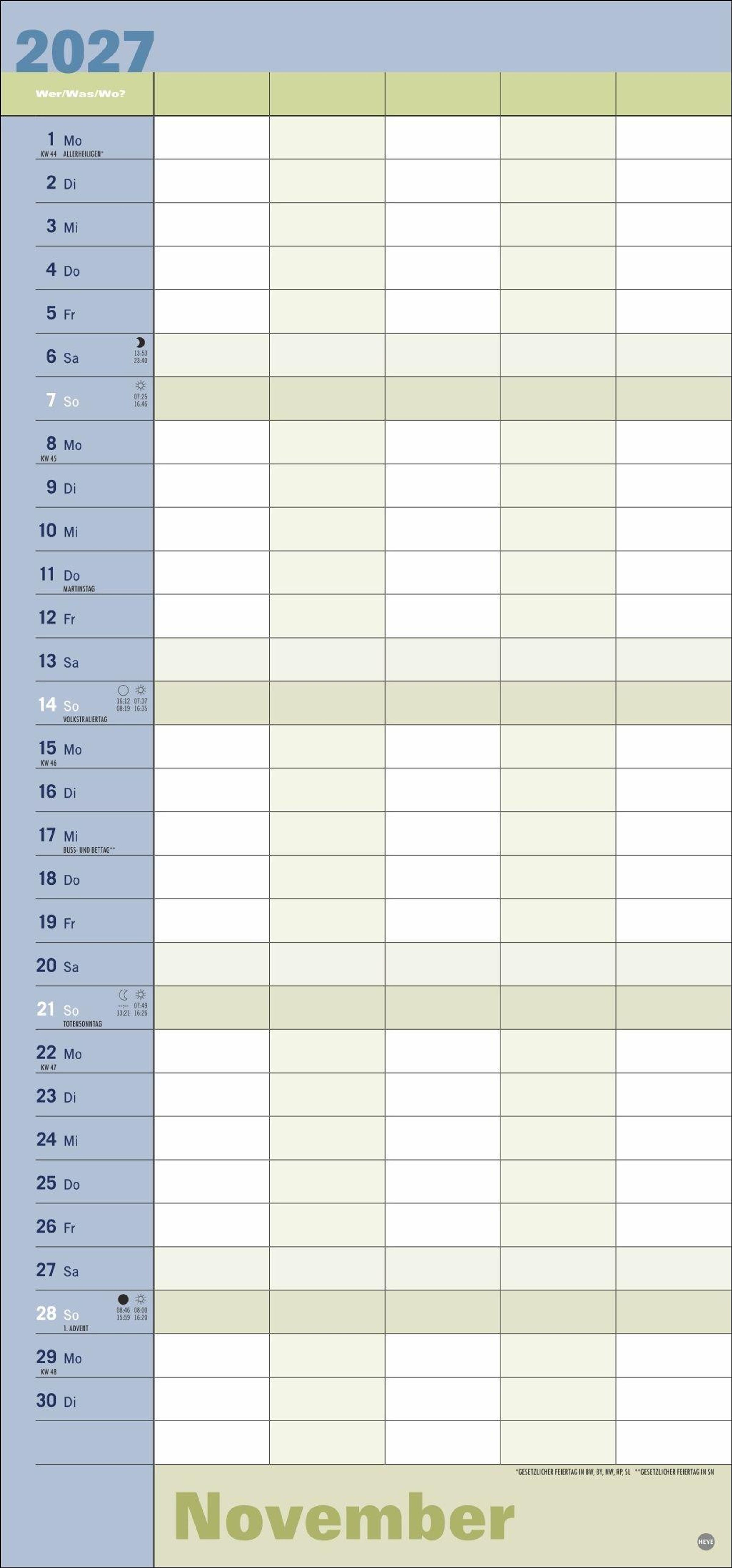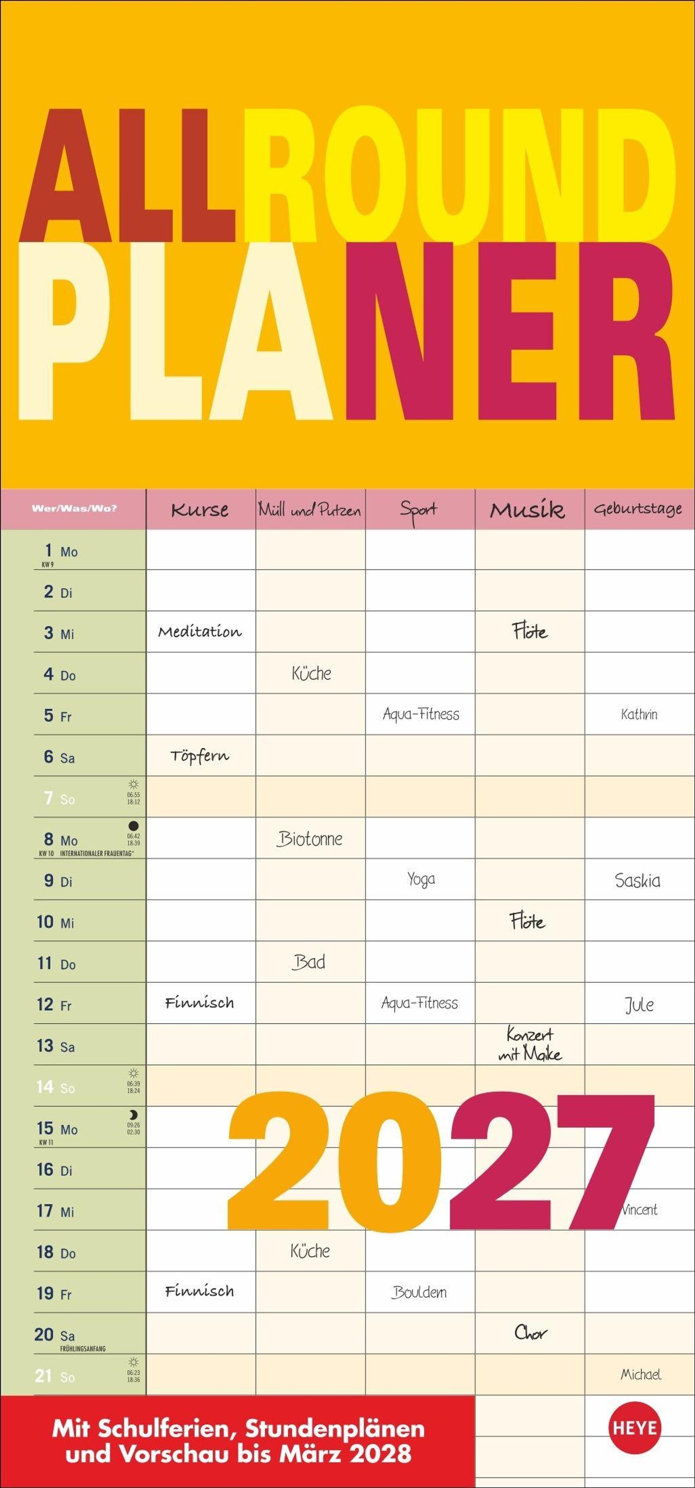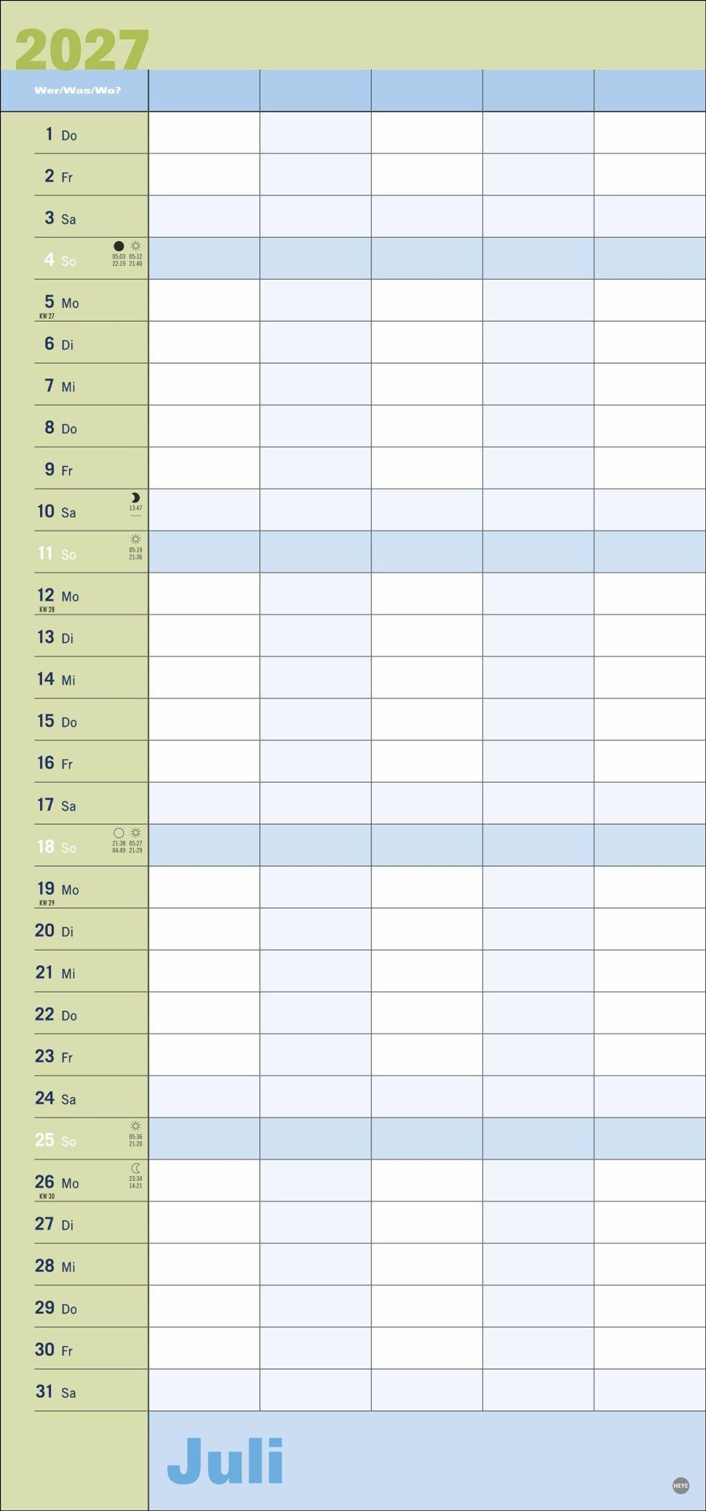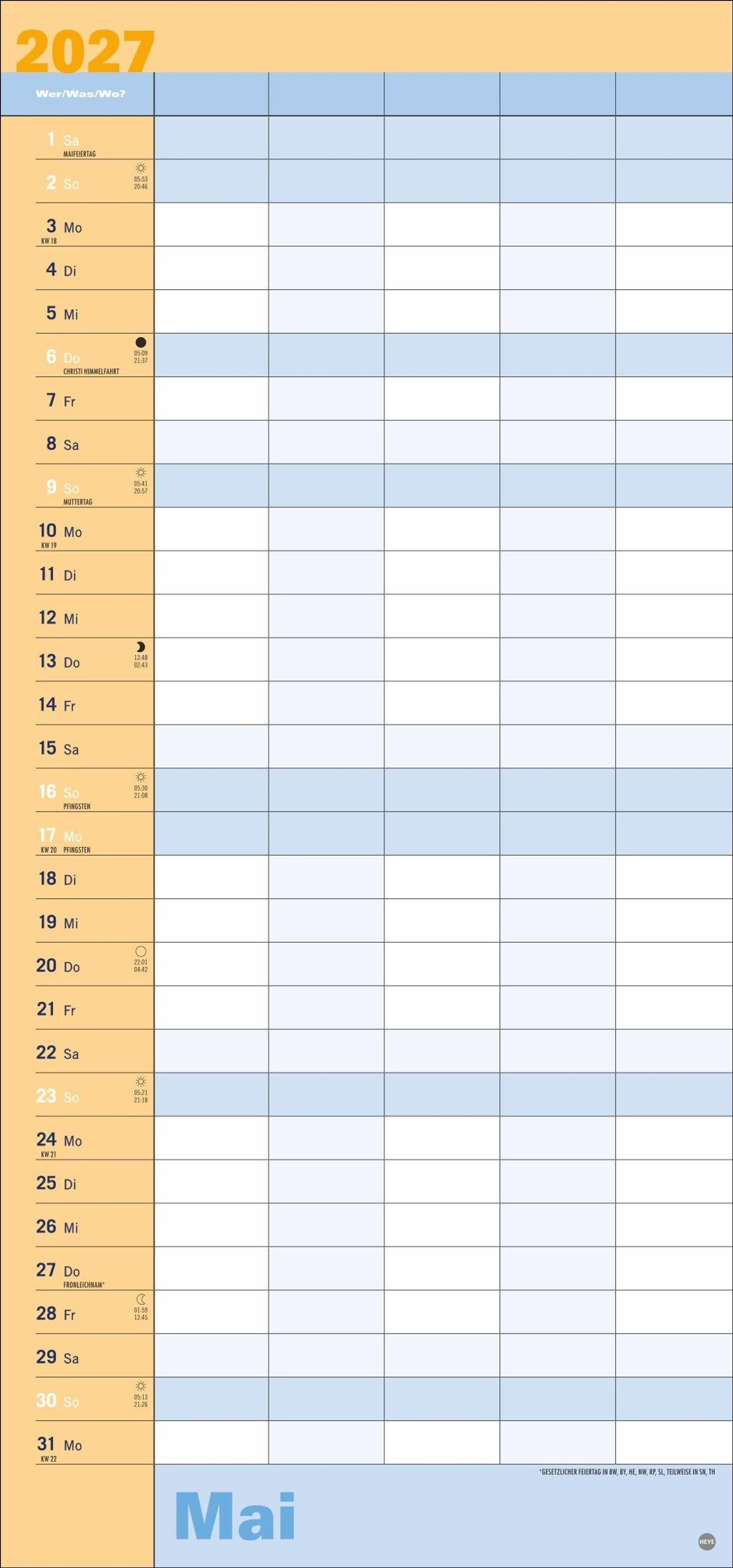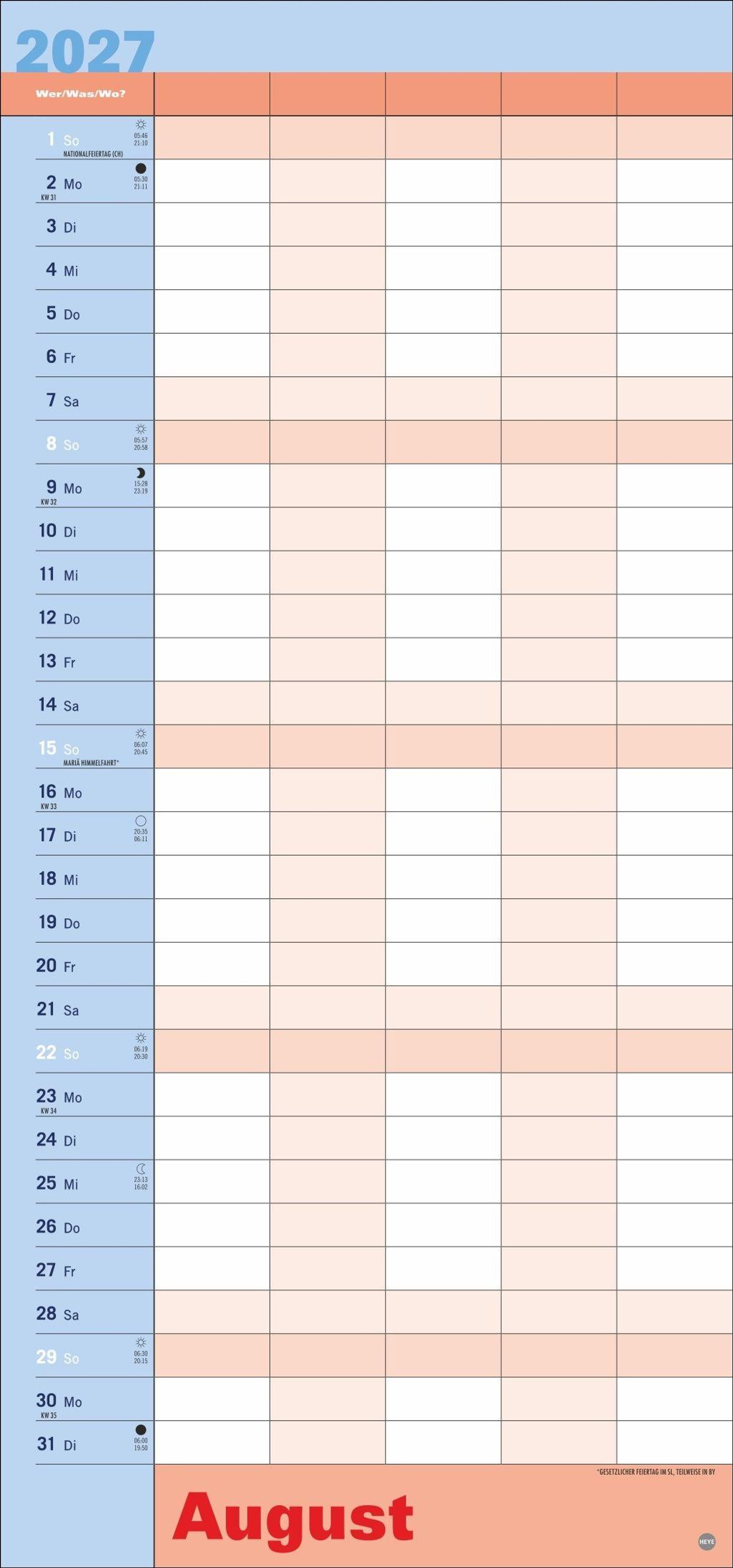 - Praktischer Wandplaner mit 5 Spalten. Wandkalender mit Schulferien und 3-Monats-Ausblick. Termin-Kalender 2027. 21 x 45 cm.