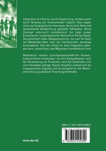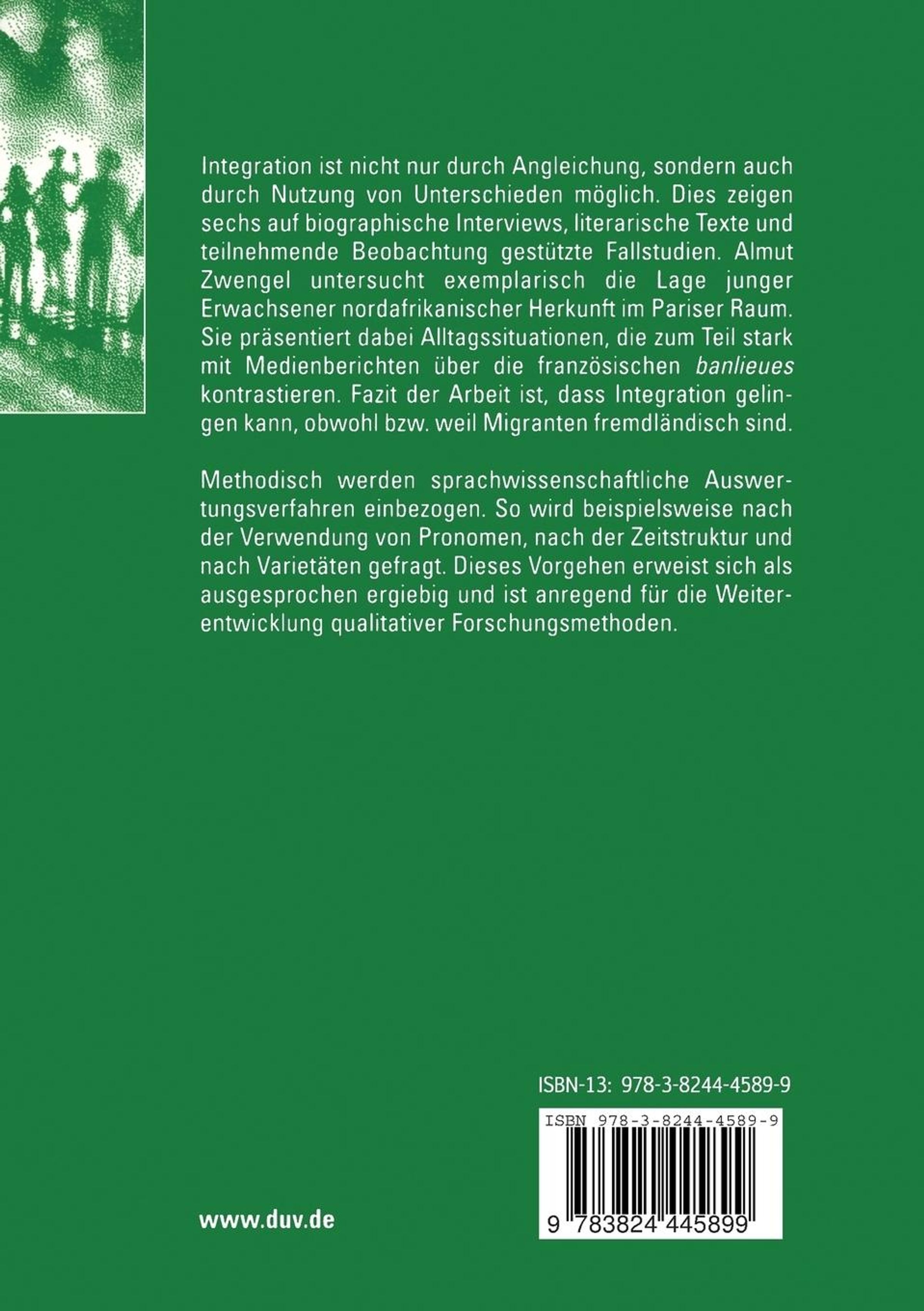 Almut Zwengel untersucht exemplarisch die Lage junger Erwachsener nordafrikanischer Herkunft im Pariser Raum. Sie zeigt Alltagssituationen, die zum Teil stark mit Medienberichten über die französischen banlieues kontrastieren, und es wird deutlich, dass Integration gelingen kann, obwohl bzw. weil Migranten fremdländisch sind.