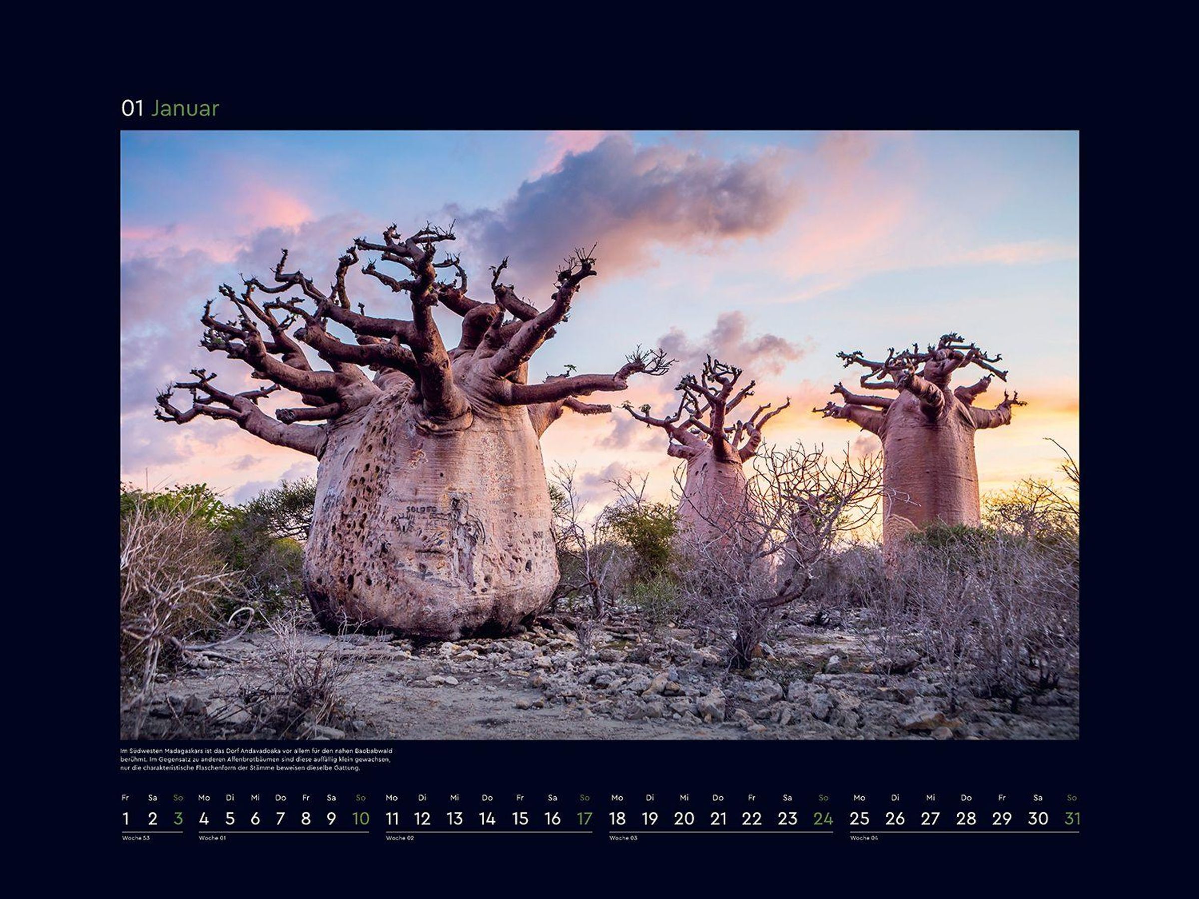 Monat für Monat wartet ein bildstarkes Highlight auf Entdeckung, und ein ansprechendes Kalendarium sorgt für optimalen Nutzen. Die mattschwarzen Rahmen bilden einen starken Kontrast zu den brillanten Fotografien.
