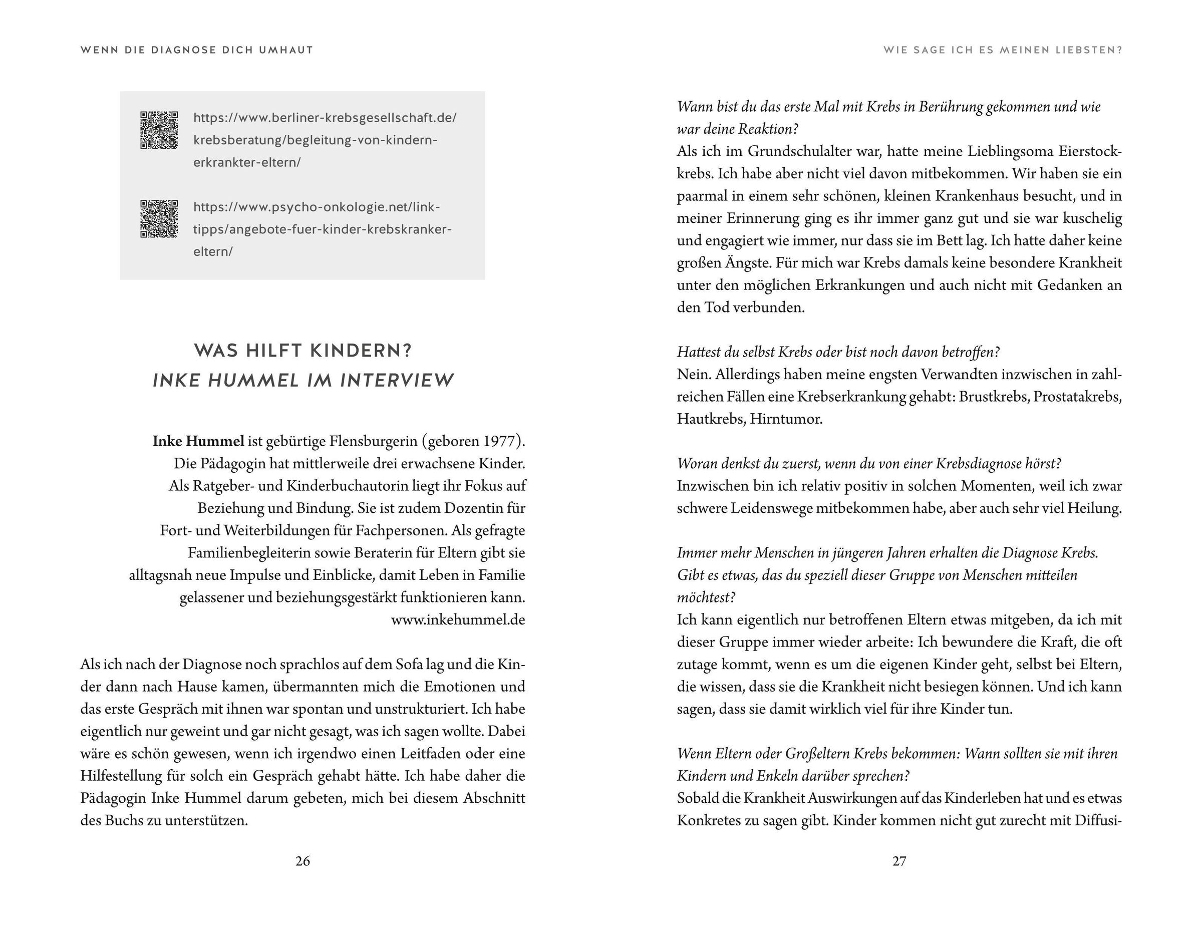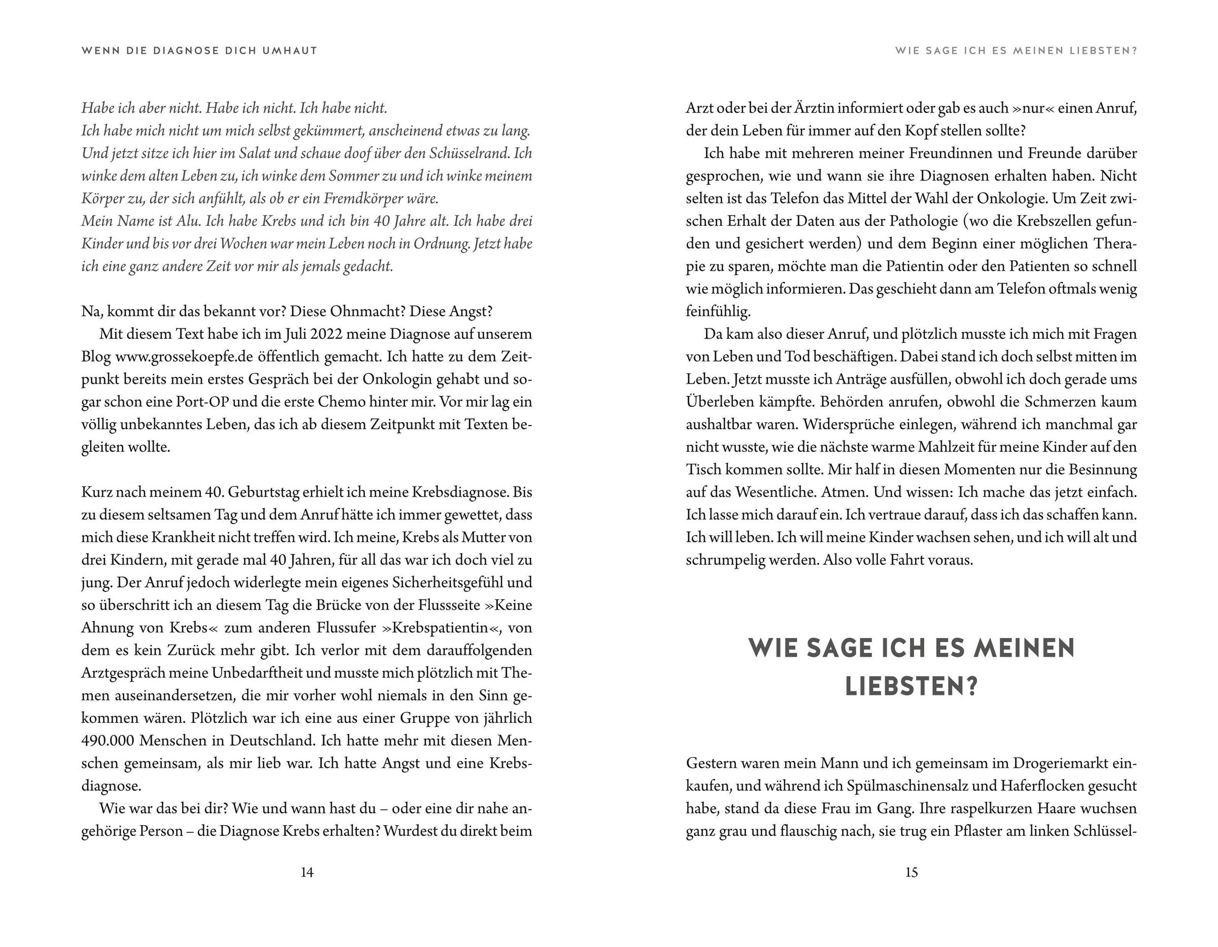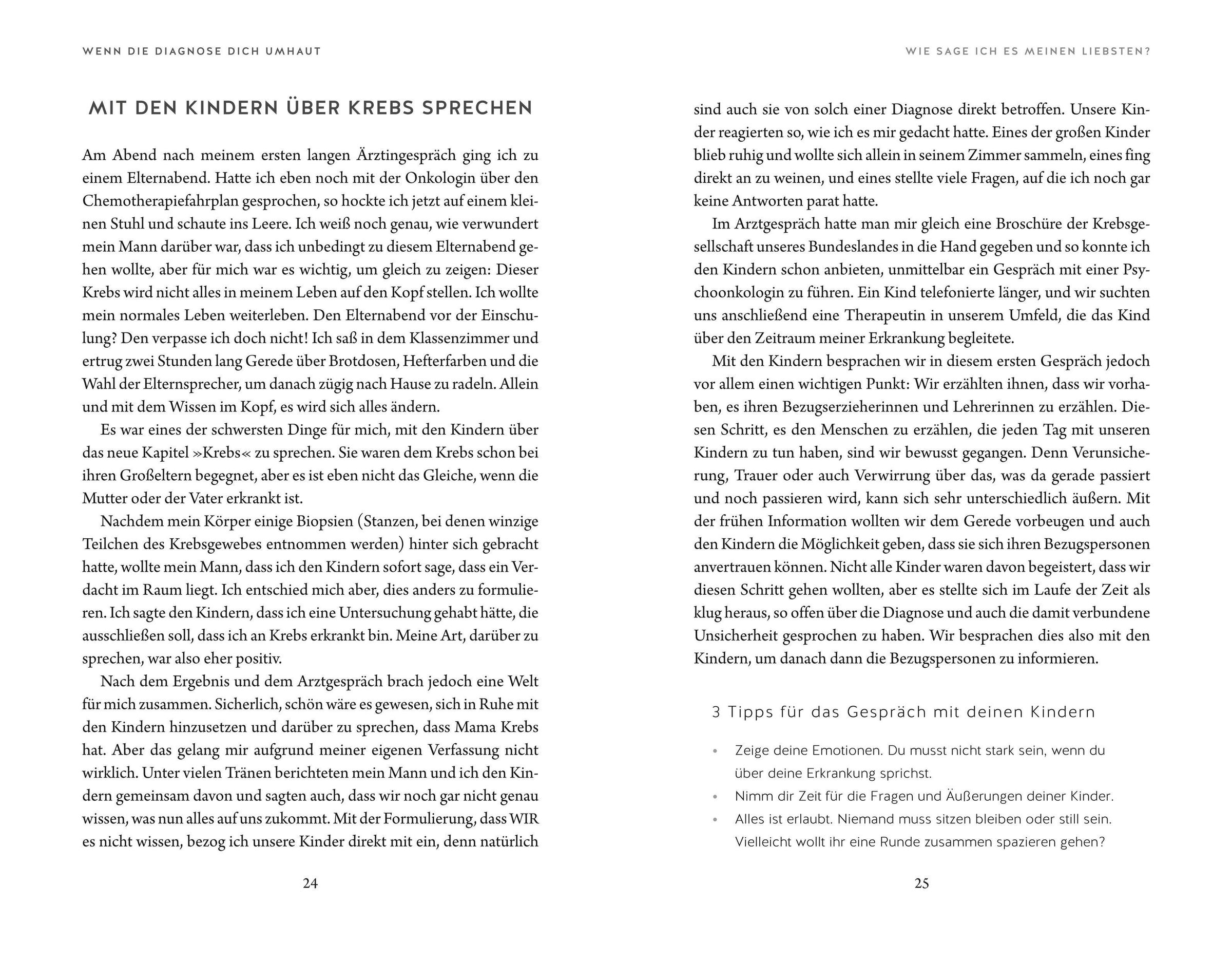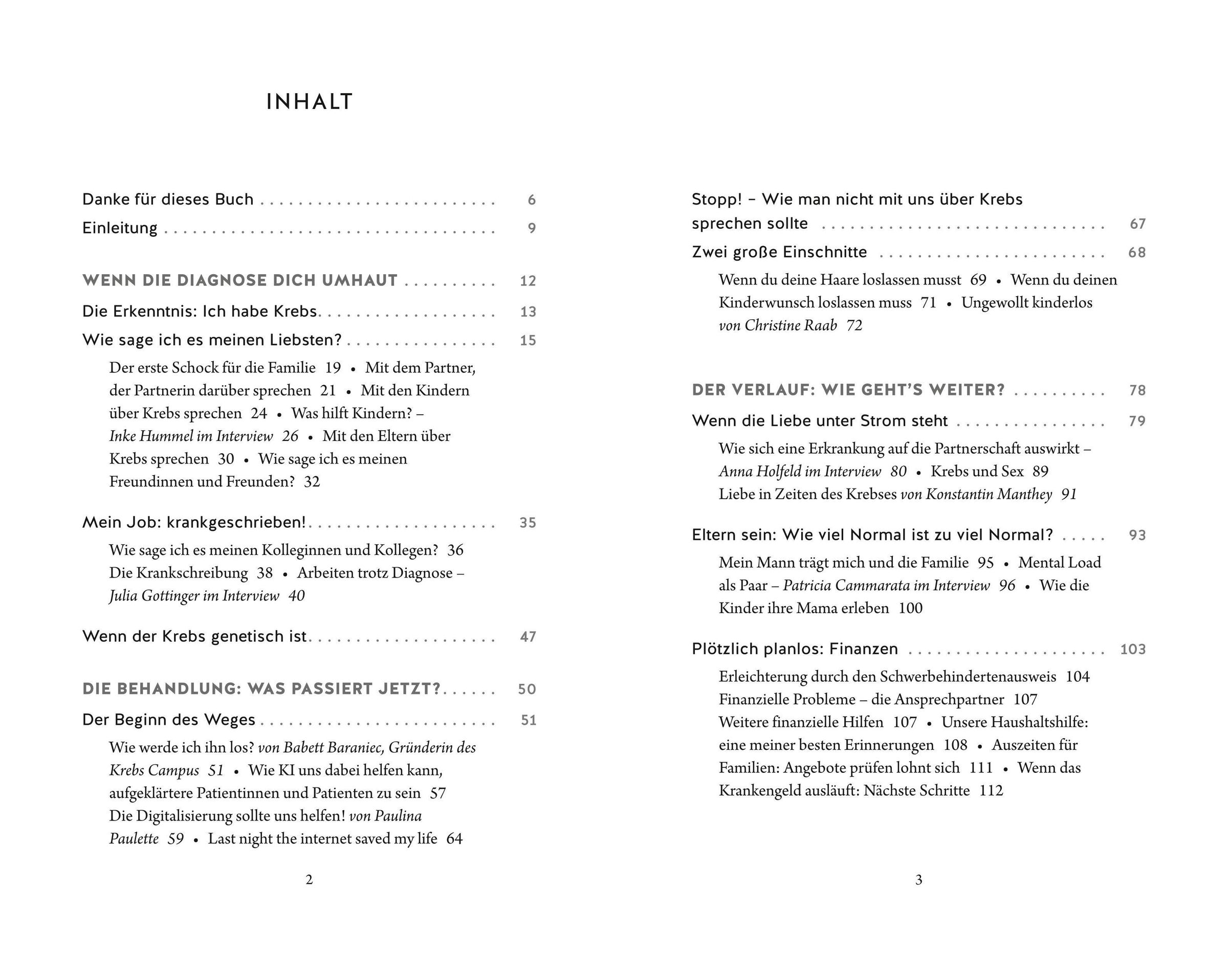 Beiträge von Betroffenen und Expert: innen bereichern dieses Buch auf vielen Ebenen: Bestsellerautorin Patricia Cammarata schreibt eindringlich über Mental Load in Familien während einer Krebserkrankung. Ernährungsinfluencerin Carolin Kotke erklärt, warum Himbeeren keinen Krebs heilen - und liefert Rezepte, die Körper und Seele guttun. Trauerbegleiterin und Bloggerin Lisa Harmann geht der Frage nach: Was trägt uns, wenn wir sterben - und wie bereiten wir unsere Familie liebevoll darauf vor?