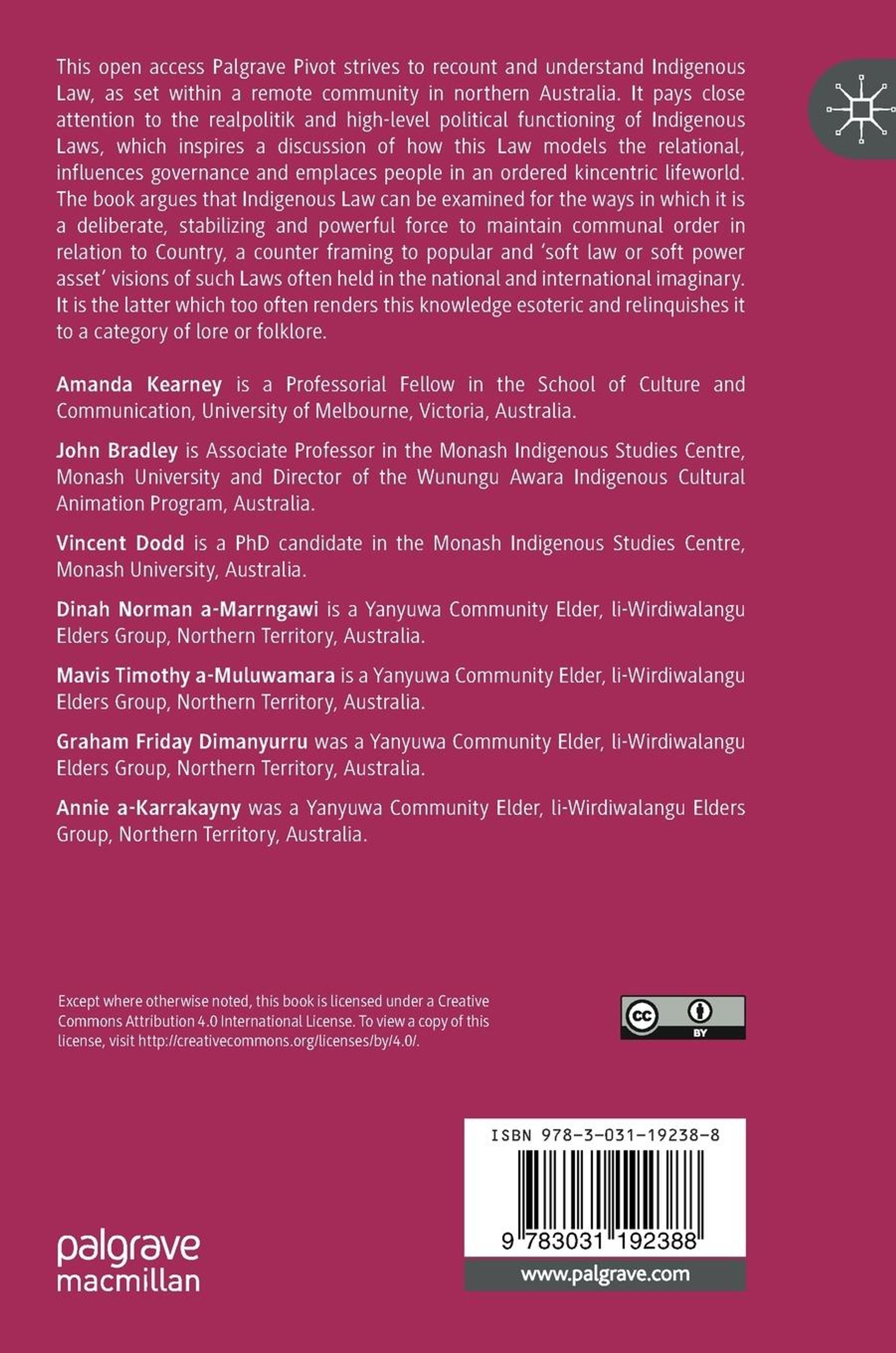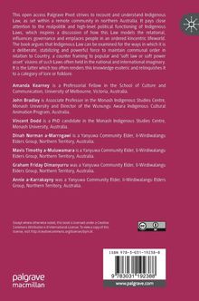 This Palgrave Pivot strives to recount and understand Indigenous Law, as set within a remote community in northern Australia. It pays close attention to the realpolitik and high-level political functioning of Indigenous Laws, which inspires a discussion of how this Law models the relational, influences governance and emplaces people in an ordered kincentric lifeworld. The book argues that Indigenous Law can be examined for the ways in which it is a deliberate, stabilizing and powerful force to maintain communal order in relation to Country, a counter framing to popular and ¿soft law or soft power asset¿ visions of such Laws often held in the national and international imaginary. It is the latter which too often renders this knowledge esoteric and relinquishes it to a category of lore or folklore. This is an open access book.