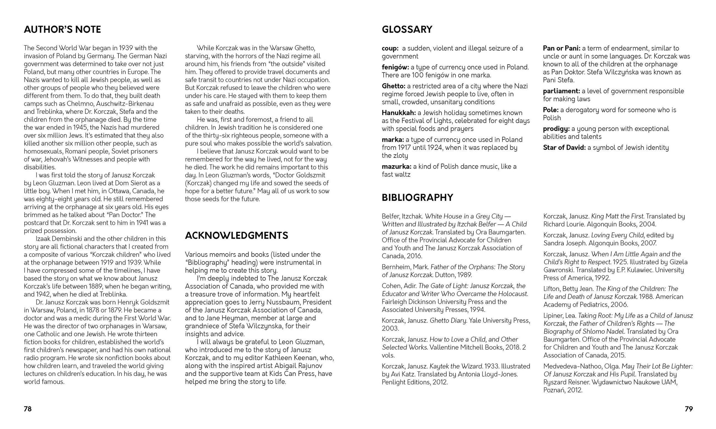 Through Amanda West Lewis's spare but resonant text and Abigail Rajunov's limited color palette, this unforgettable graphic novel brings to life an important piece of pre-war Polish Jewish history. It also pays tribute to the inspiring Janusz Korczak, a renowned writer and thinker whose advocacy for children's rights was influential around the world. Korczak is a benevolent and even playful presence in the story, who reads his books to the children and allows them to settle disputes in a children's court. The character of Izaak was inspired by several real-life children who lived at the orphanage. Told with heart and honesty - Izaak escapes the Nazis, but the others, unfortunately, do not - and paying close attention to historical details, it's an excellent lesson in how one person can change the lives of others. This book can spark discussions with children about their rights and how they can help make the world a better place. It also includes an author's note, glossary and resources.