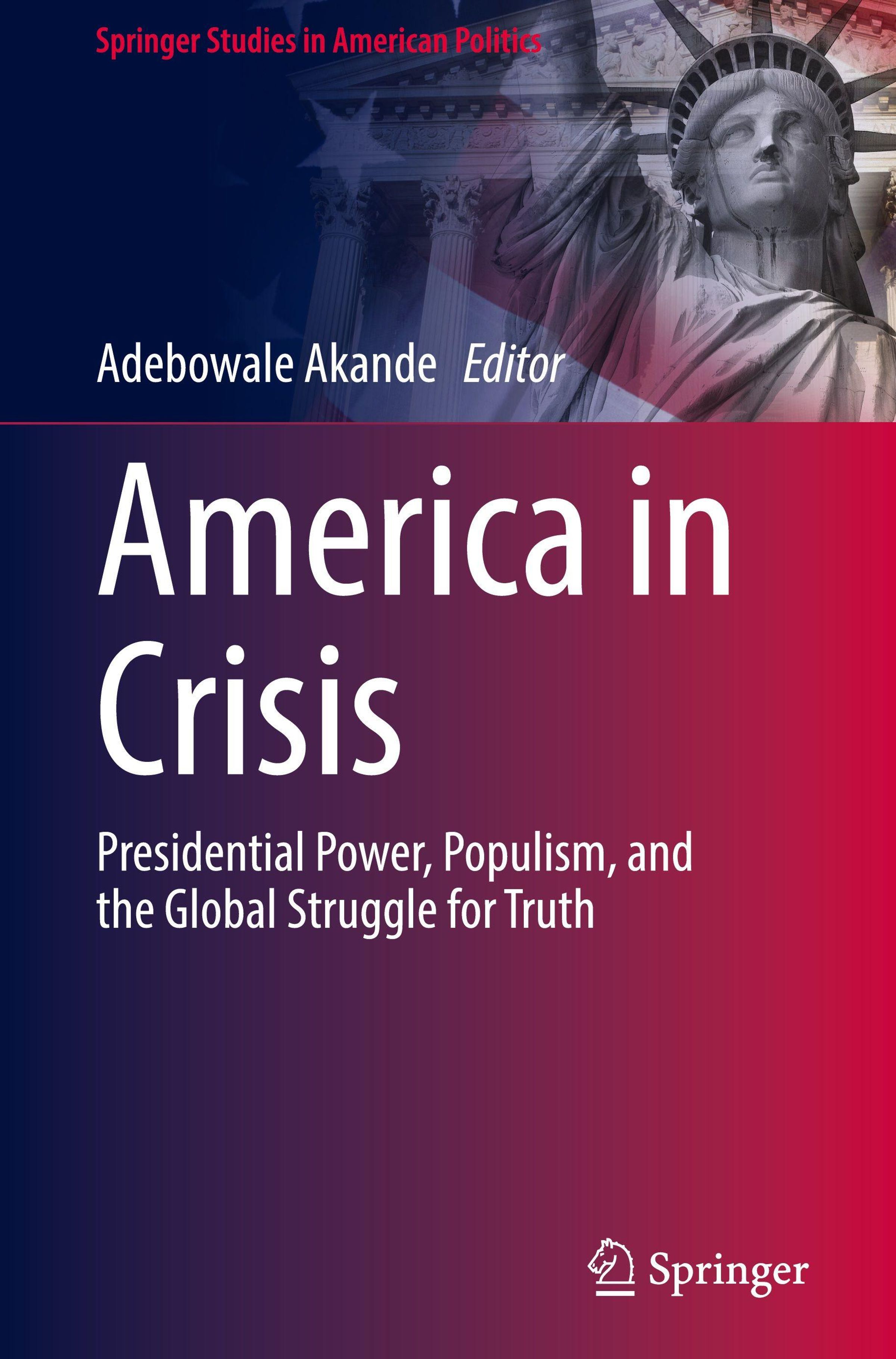 "America in Crisis" mit Untertitel zu Macht und Populismus. Statue der Freiheit teils sichtbar. Farbübergang Blau zu Rot., Buch