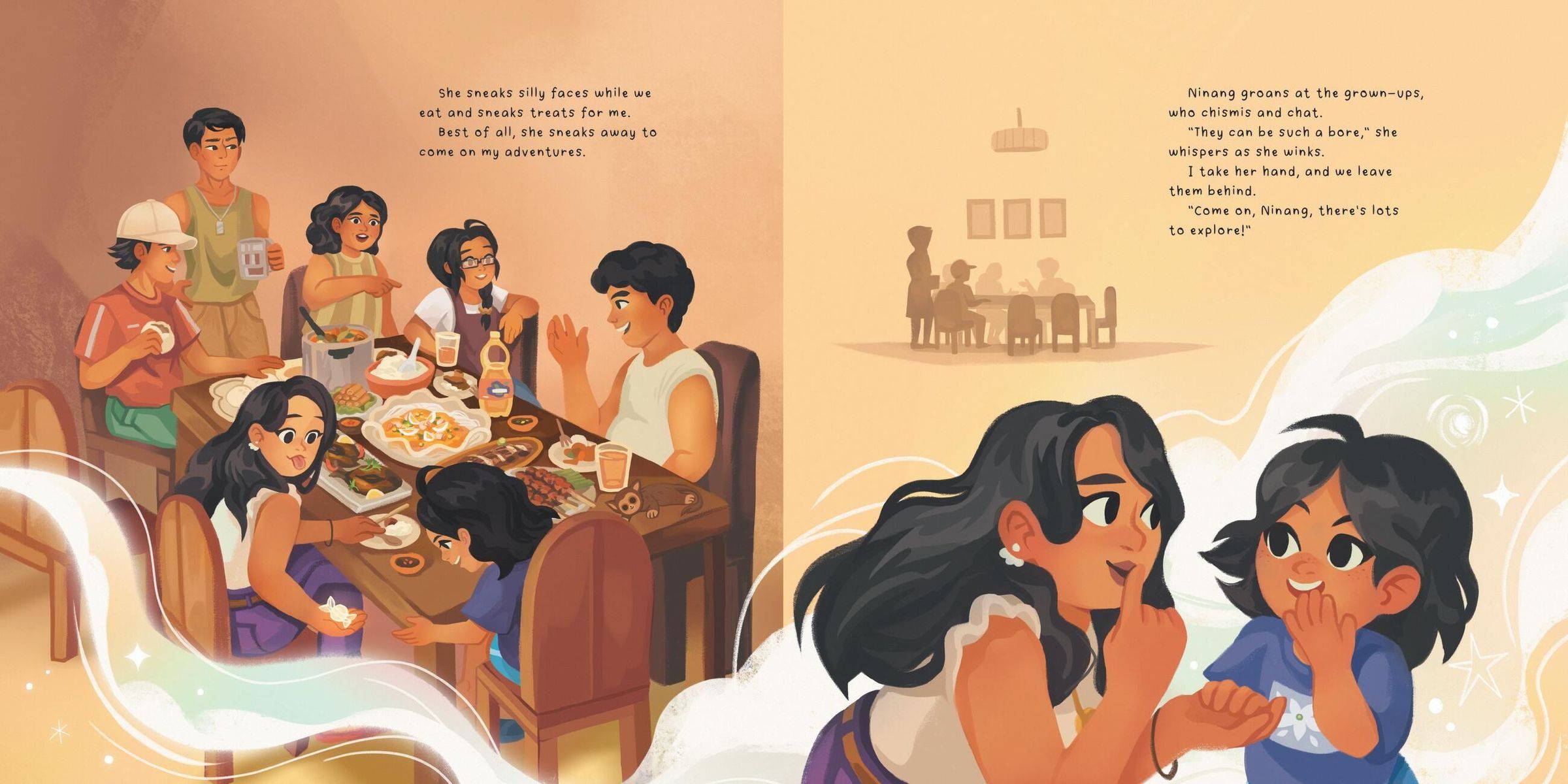 A young girl's ninang ("godmother" in Tagalog) has arrived for a visit, and she's thrilled! After all, Ninang isn't just the girl's godmother, she's also her very best friend. Ninang describes herself as "a grown-up whose heart never grew up," which means the two get to have a day full of adventures, including blasting off into outer space and rescuing lost balloons and cats stuck in trees! Unfortunately, as with all wonderful visits, this one must come to end. Or can the girl find a way to get Ninang to stay?