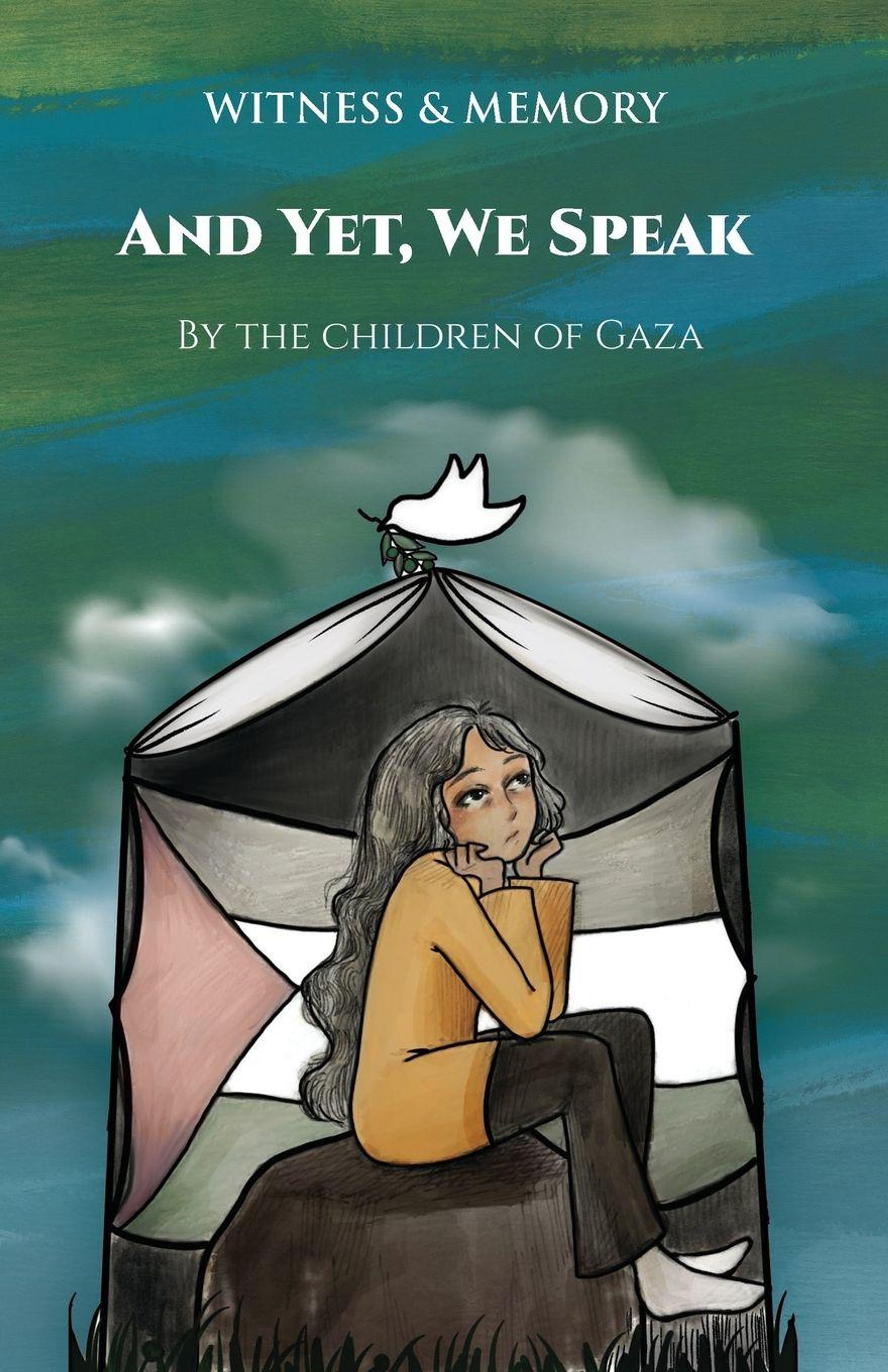 "AND YET, WE SPEAK" über nachdenklichem Mädchen, das in einem Zelt sitzt. Eine Taube mit Zweig sitzt obenauf., Buch
