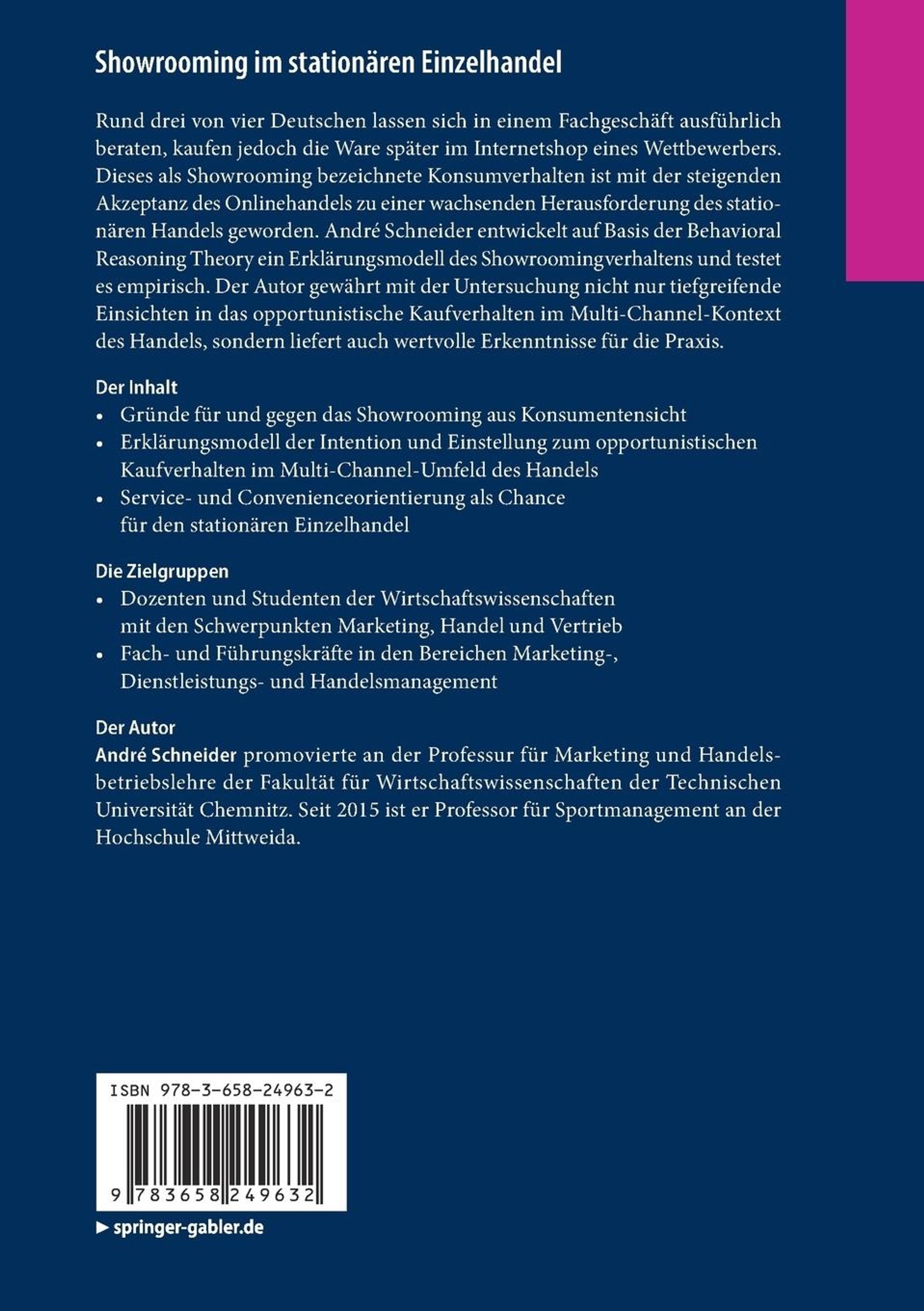 Rund drei von vier Deutschen lassen sich in einem Fachgeschäft ausführlich beraten, kaufen jedoch die Ware später im Internetshop eines Wettbewerbers. Dieses als Showrooming bezeichnete Konsumverhalten ist mit der steigenden Akzeptanz des Onlinehandels zu einer wachsenden Herausforderung des stationären Handels geworden. André Schneider entwickelt auf Basis der Behavioral Reasoning Theory ein Erklärungsmodell des Showroomingverhaltens und testet es empirisch. Der Autor gewährt mit der Untersuchung nicht nur tiefgreifende Einsichten in das opportunistische Kaufverhalten im Multi-Channel-Kontext des Handels, sondern liefert auch wertvolle Erkenntnisse für die Praxis.