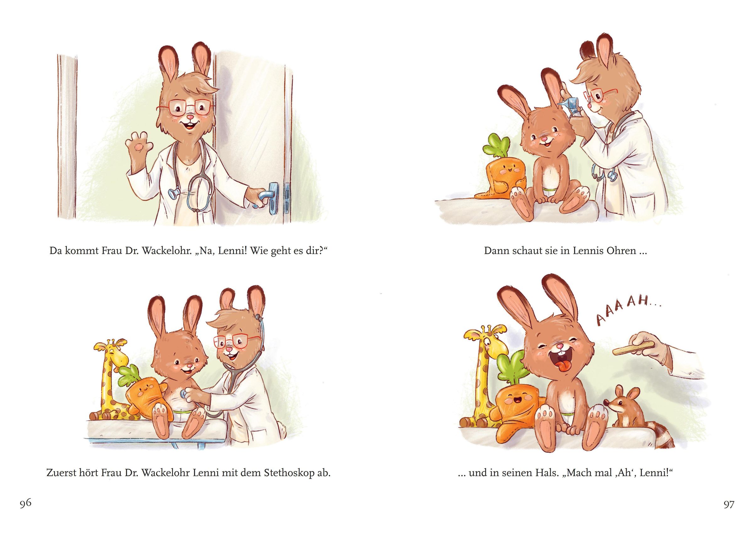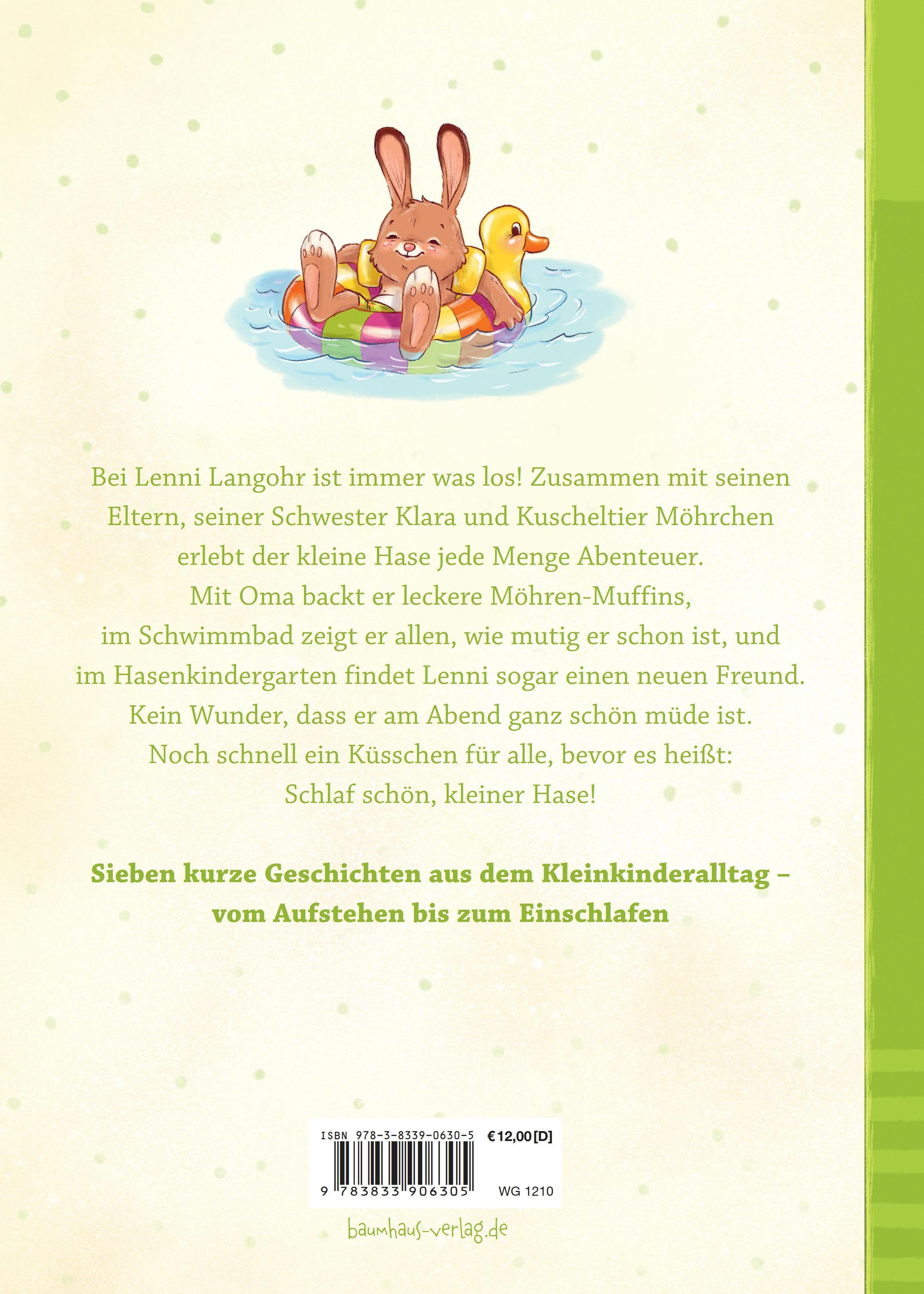 Bei Lenni Langohr ist immer was los! Mit seinen Eltern, seiner Schwester Klara und seinem Lieblingskuscheltier, einer Karotte namens Möhrchen, erlebt der kleine Hase die tollsten Abenteuer: Zu Besuch bei Oma darf er seinen ersten Karottenkuchen backen, mit Papa und Klara geht er ins Schwimmbad, und im Hasenkindergarten findet Lenni sogar einen neuen Freund. Kein Wunder, dass er am Abend ganz schön müde ist. Noch schnell ein Küsschen für alle, bevor es heißt: Schlaf schön, kleiner Hase!