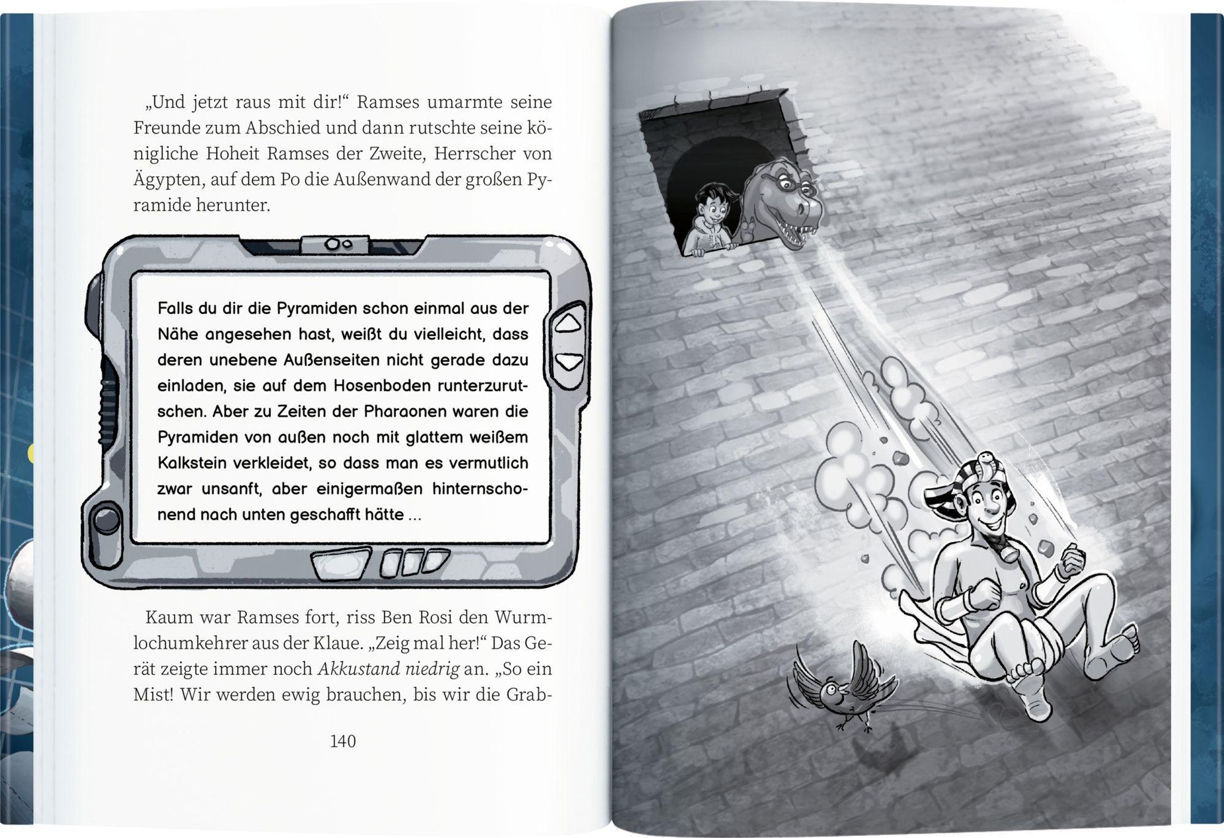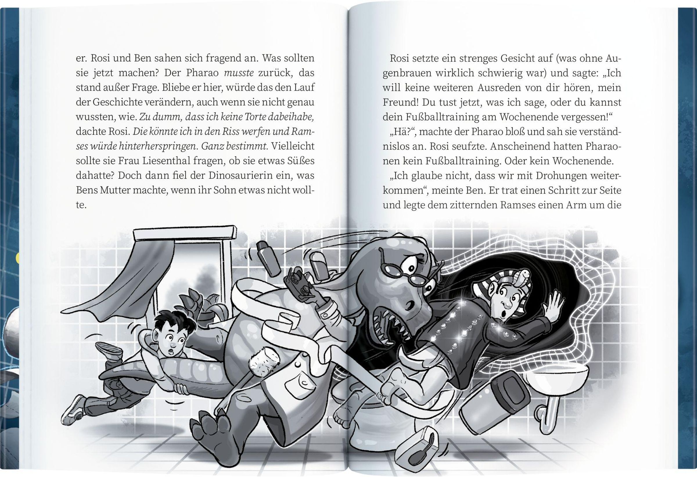 Ben wollte bloß entspannte Sommerferien - doch im Jahr 2057 passiert es schon mal, dass ein urplötzlich auftretendes Wurmloch jemanden von einer in die andere Zeit katapultiert. So auch Dinosaurier-Dame Rosi, die bei Ben und seiner Familie wohnt. Soweit, so gut. Doch so richtig turbulent wird es, als niemand geringerer als Pharao Ramses II im Gästeklo landet. Er muss dringend wieder zurück nach Hause! Für Ben und Rosi beginnt ein rasantes Abenteuer, gespickt mit Humor und überraschenden Fakten rund um Dinos und das Alte Ägypten.