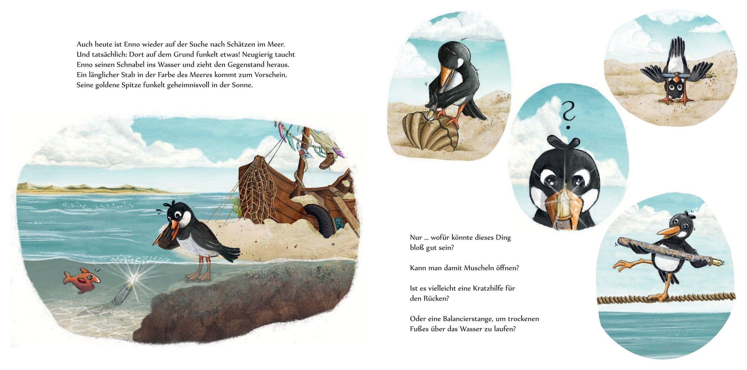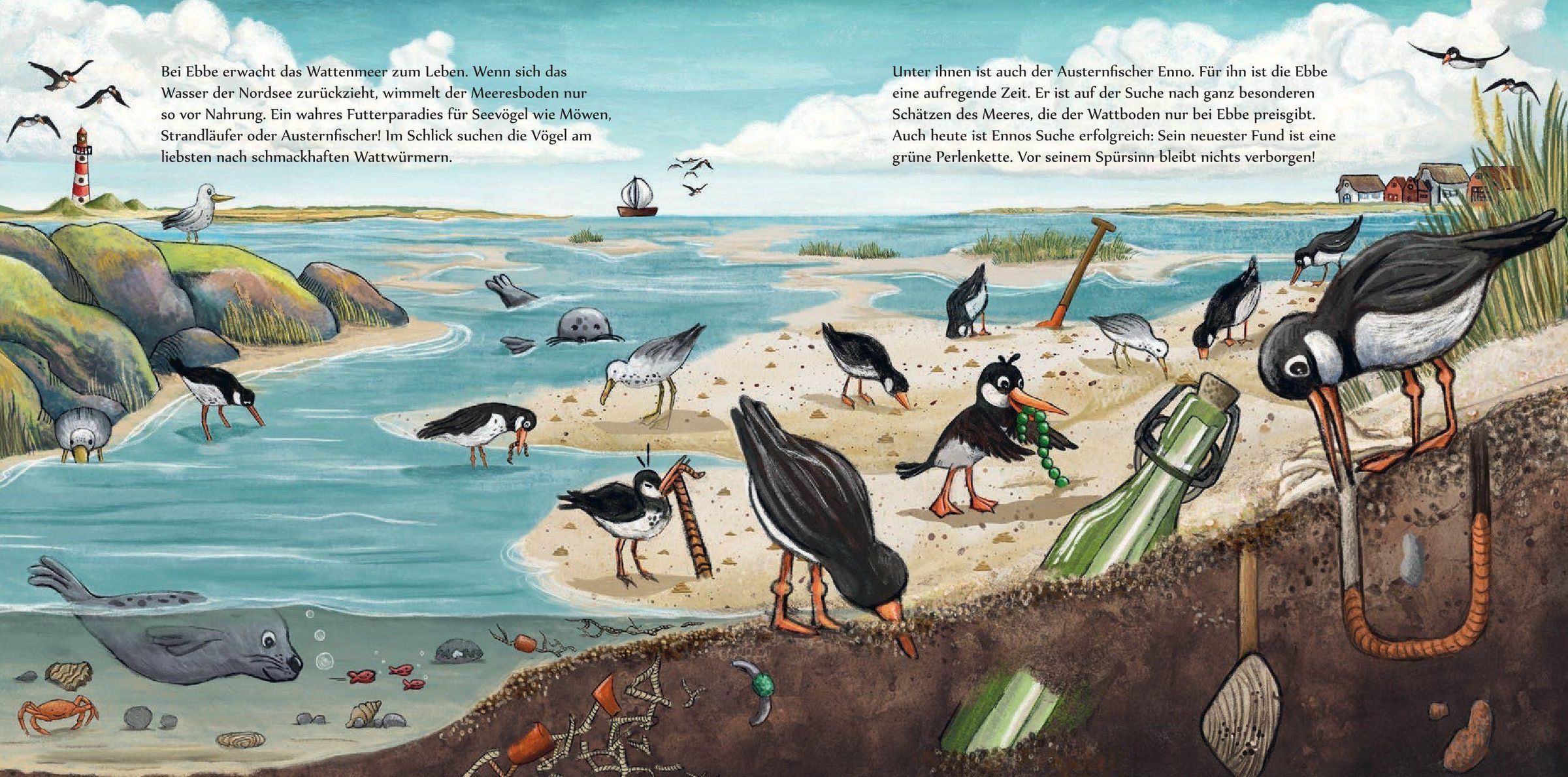 Austernfischer Enno ist begeisterter Schatzsucher . Ob kaputte Badelatschen oder altes Strandspielzeug - alles, was das Meer anspült, findet bei ihm eine neue Verwendung. Als Enno einen Füller findet, dauert es nicht lange, bis er das Lesen und Schreiben für sich entdeckt und sich ihm eine ganz neue Welt der Kommunikation eröffnet.