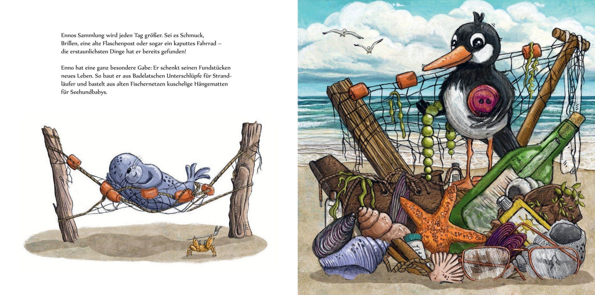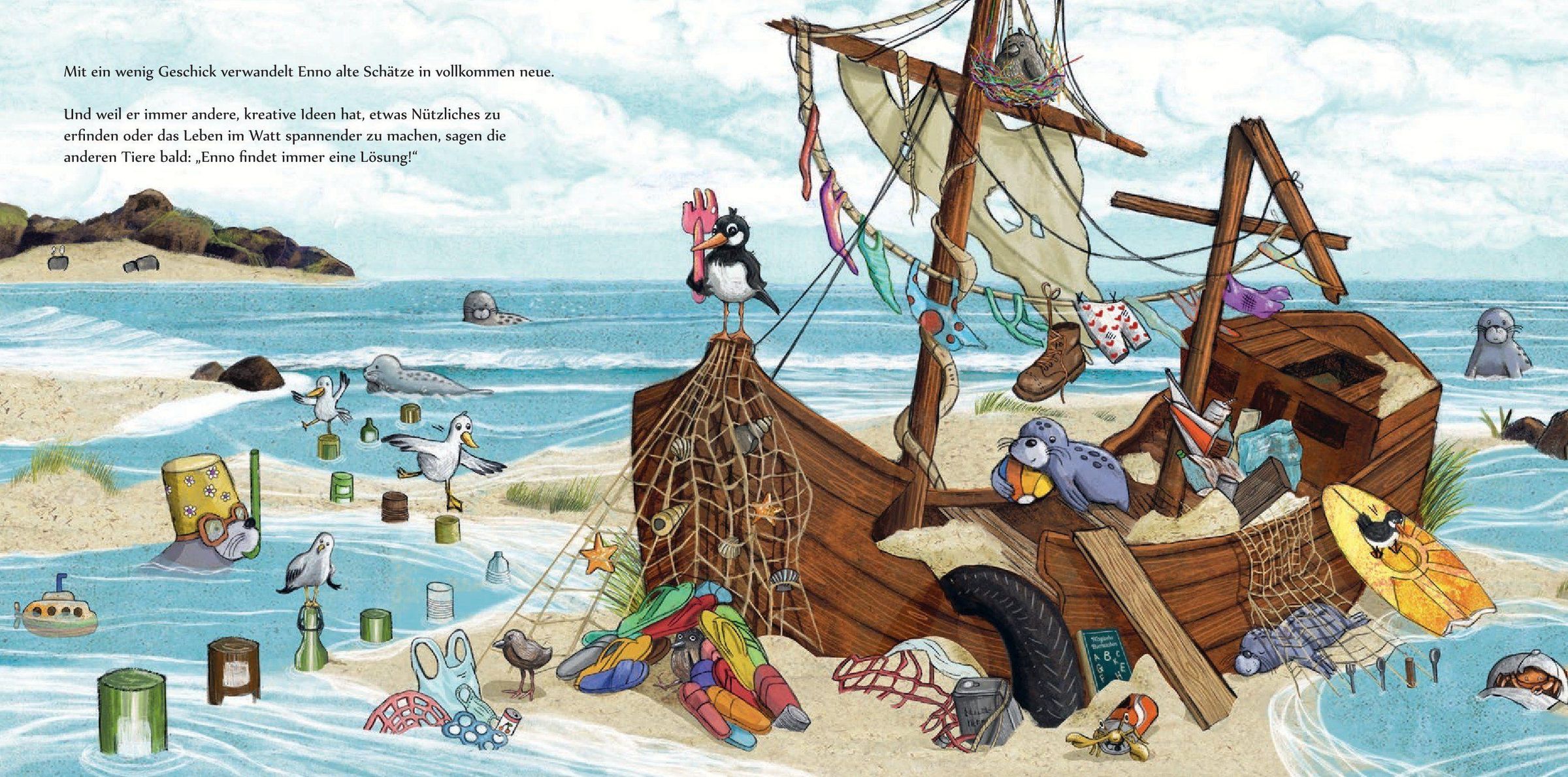 Bald jedoch merkt Enno, dass seine Schätze nicht nur nützlich , sondern auch gefährlich sein können: Ein Robbenbaby verheddert sich in einem alten Netz, ein Sandläuferküken verschluckt ein Stück Plastik, eine Möwe steckt mit dem Kopf in einer Flasche fest. Alleine können sie sich nicht befreien - und die Flut setzt bereits ein! Kann Enno seine Freunde mithilfe seiner neuen Fähigkeit retten?