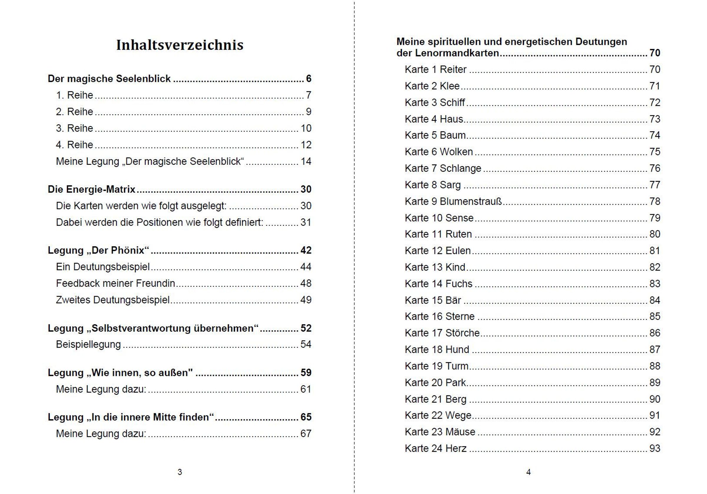 Ein spannendes Thema, wie ich finde, wert beachtet und erforscht zu werden. Dafür sind die Lenormandkarten eine wunderbare Möglichkeit, wie ein Beispiel im Buch anschaulich dokumentiert.