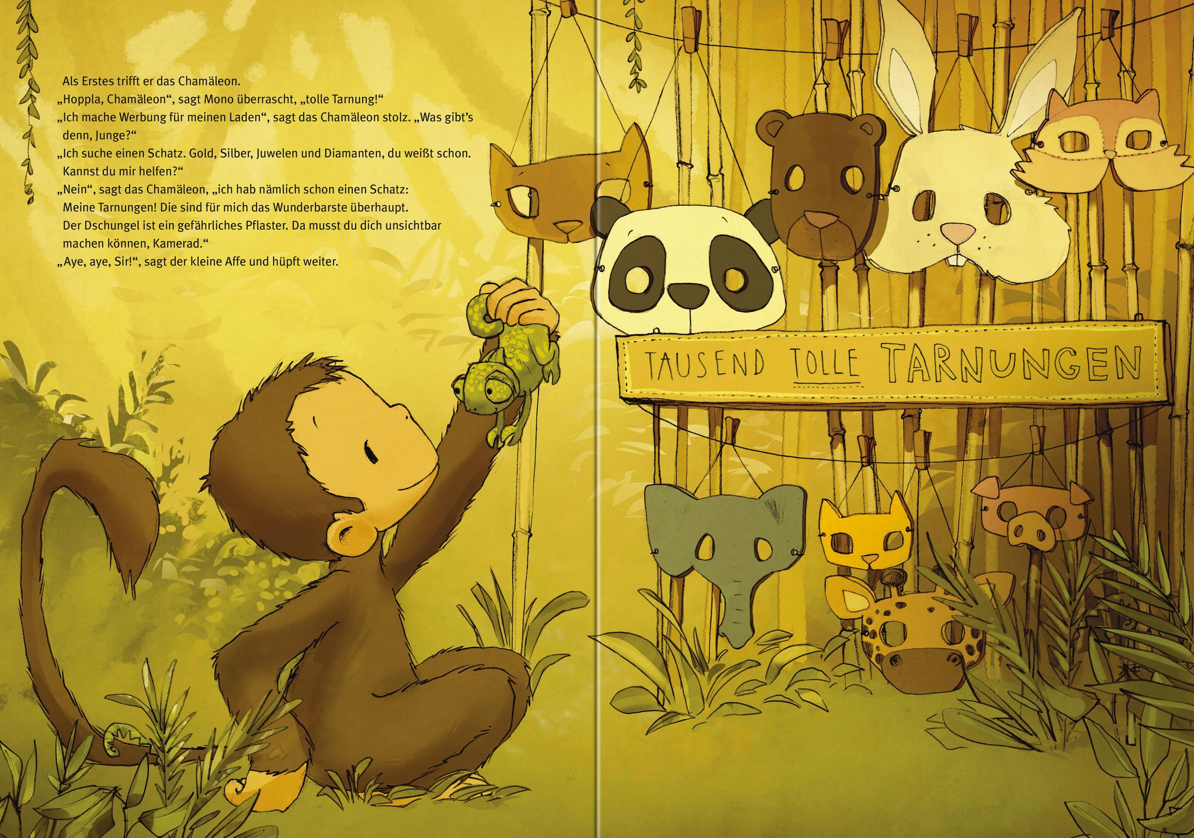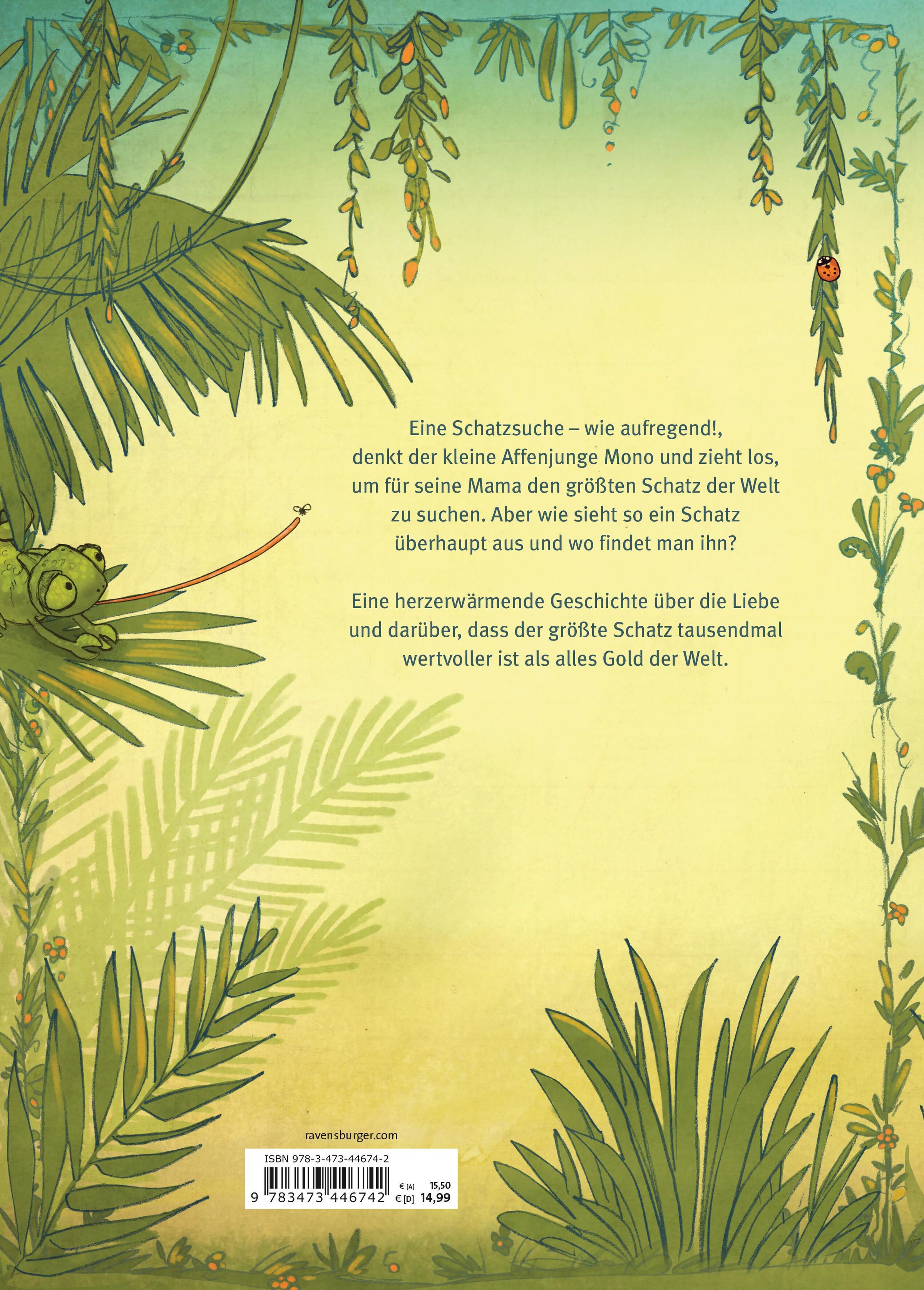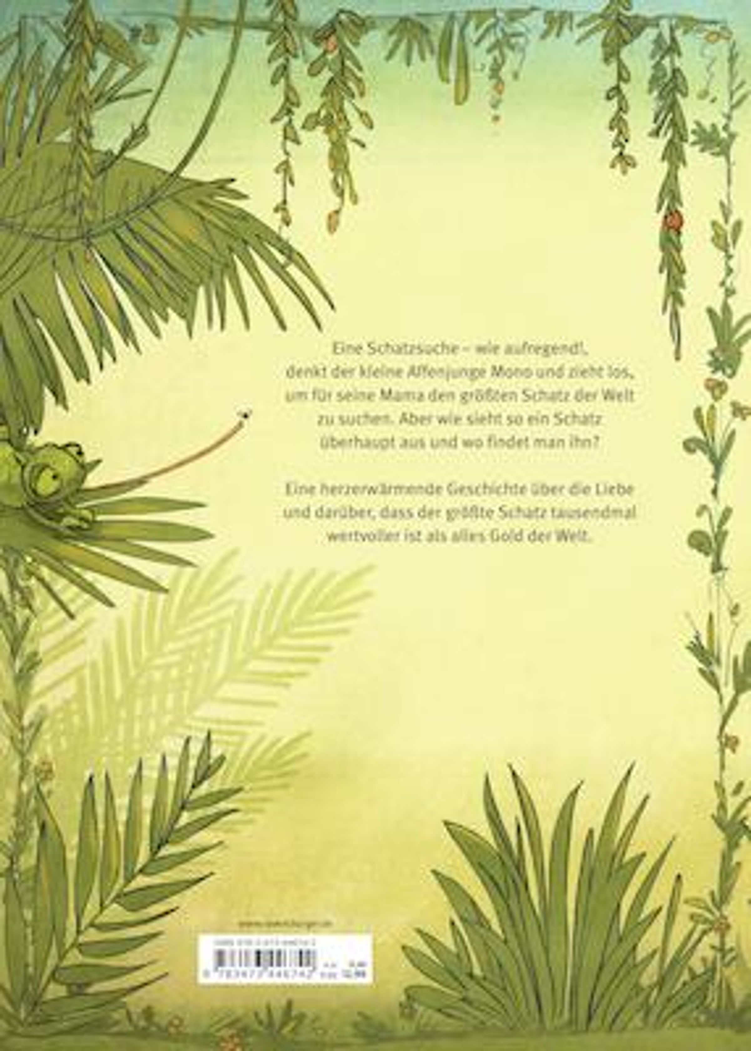 Affenjunge Mono möchte für seine Mama den größten Schatz der Welt suchen. Den ganzen Tag ist er im Dschungel unterwegs, doch Gold und Diamanten sind nirgendwo zu finden. Als das Glühwürmchen ihn abends nach Hause bringt, erwartet Monos Mama ihren Sohn schon sehnsüchtig. Und sie hat eine Überraschung für Mono: Sie hat ihren größten Schatz nämlich längst gefunden. Was das wohl sein mag?