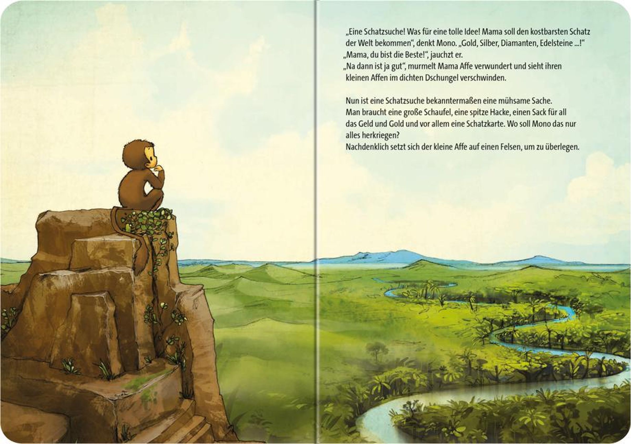 Der kleine Affenjunge Mono möchte für seine Mama den größten Schatz der Welt finden. Den ganzen Tag ist er im Dschungel unterwegs und trifft dabei viele fremde Tiere. Aber einen Schatz findet er nicht. Als es nach einem aufregenden Tag schnell dunkel wird, wartet seine Mama schon sehnsüchtig auf ihren größten Schatz... Eine herzerwärmende Geschichte für Große und Kleine.