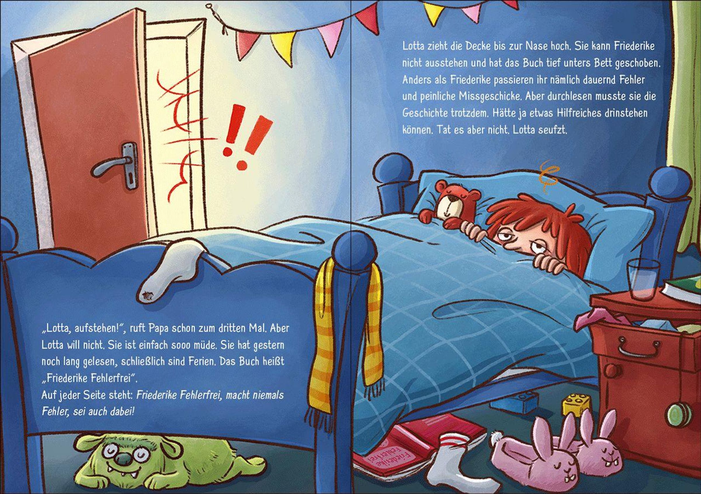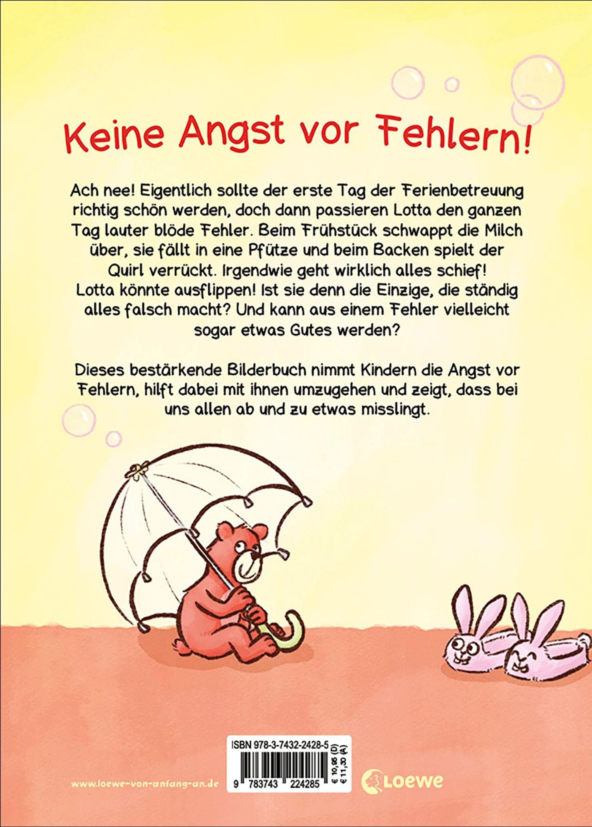 Keine Angst vor Fehlern! Ach nee! Eigentlich sollte der erste Tag der Ferienbetreuung richtig schön werden, doch dann passieren Lotta den ganzen Tag lauter blöde Fehler. Beim Frühstück schwappt die Milch über, sie fällt in eine Pfütze und beim Backen spielt der Handrührer verrückt. Irgendwie geht wirklich alles schief! Lotta könnte ausflippen! Ist sie denn die Einzige, die ständig alles falsch macht? Oder kann aus einem Fehler vielleicht sogar etwas Gutes werden?