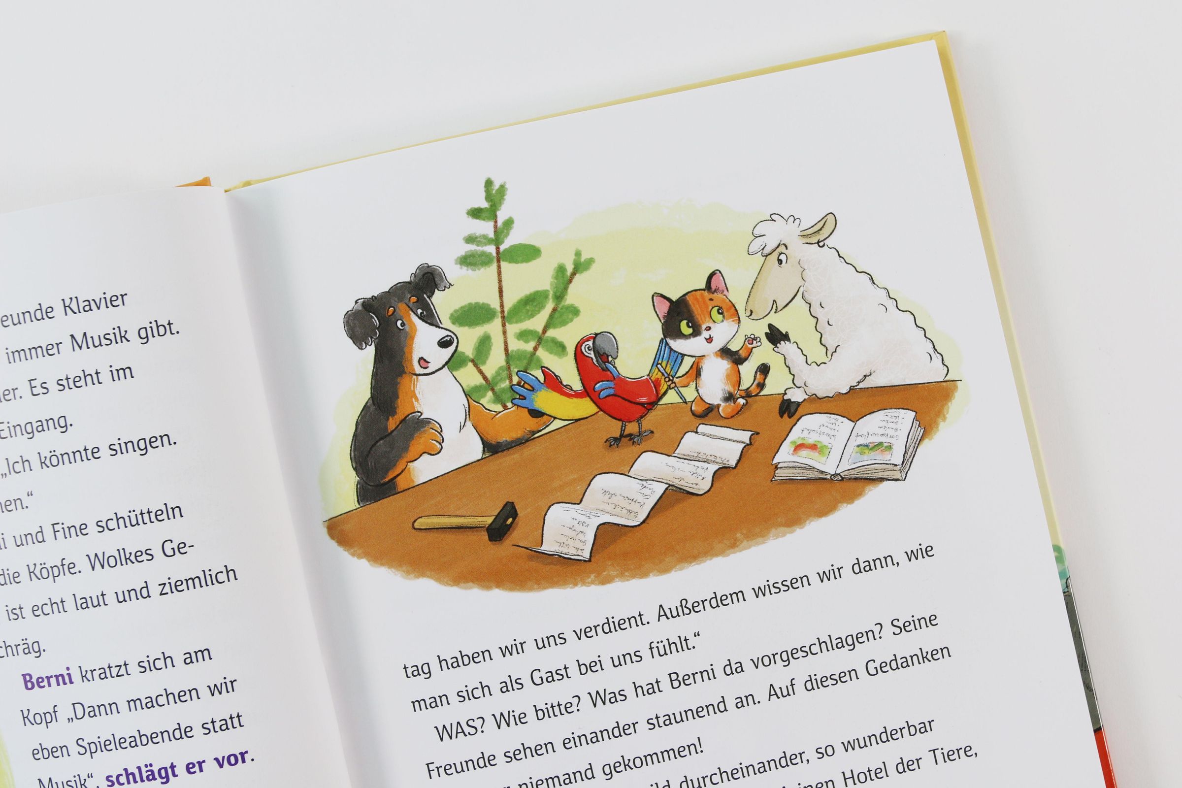 Vorlesezeit ist Zusammenzeit! Auf einem Hügel zwischen zwei Apfelbäumen, steht das kleine Hotel der Tiere. Es gehört vier allerbesten Freunde: Berner Sennenhund Berni, Schaf Wolke, Papagei Plapper und die kleine Glückskatze Fine. Aber ein Hotel zu leiten ist gar nicht so einfach und es gibt immer viel zu tun. Gäste müssen versorgt werden, Wolke braucht dringend Hilfe, ein Geburtstag steht an und dann spukt es auch noch ...! Aber egal ob bei Streit und an miesen Tag oder bei Spaß und guter Laune - diese tierischen Freunde halten immer fest zusammen. Und etwas Schöneres kann es doch gar nicht geben.