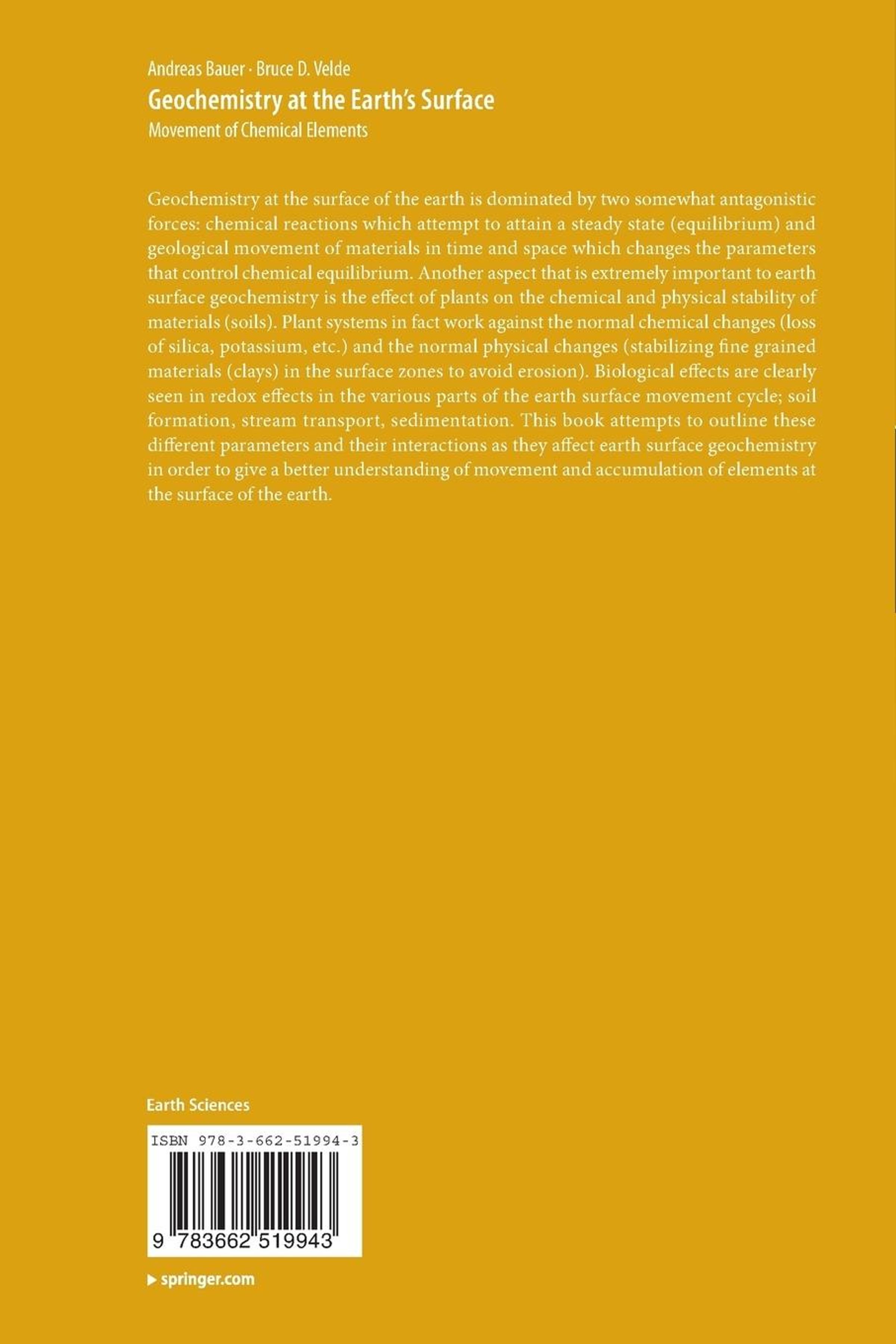 Geochemistry at the surface of the earth is dominated by two somewhat antagonistic forces: chemical reactions which attempt to attain a steady state (equilibrium) and geological movement of materials in time and space which changes the parameters that control chemical equilibrium. Another aspect that is extremely important to earth surface geochemistry is the effect of plants on the chemical and physical stability of materials (soils). Plant systems in fact work against the normal chemical changes (loss of silica, potassium, etc.) and the normal physical changes (stabilizing fine grained materials (clays) in the surface zones to avoid erosion). Biological effects are clearly seen in redox effects in the various parts of the earth surface movement cycle; soil formation, stream transport, sedimentation. This book attempts to outline these different parameters and their interactions as they affect earth surface geochemistry in order to give a better understanding of movement and accumulation of elements at the surface of the earth.