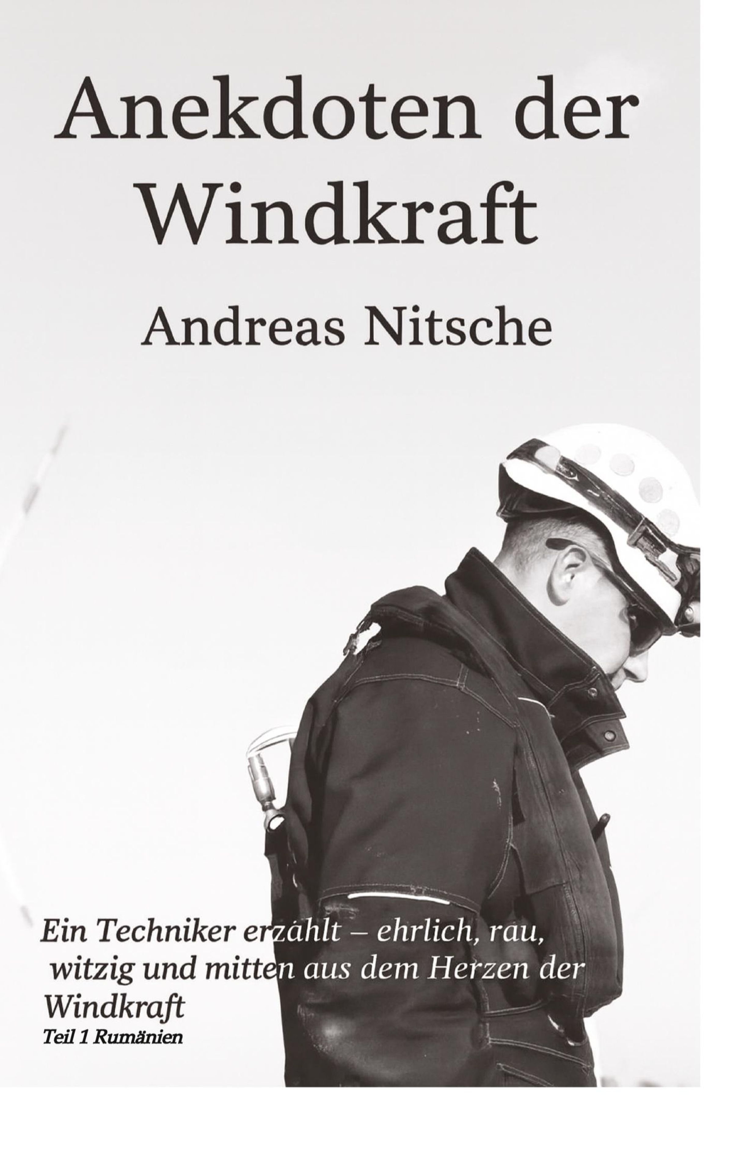 „Anekdoten der Windkraft“ von Andreas Nitsche. Ein Techniker erzählt ehrlich und witzig, Teil 1 Rumänien. Person mit Helm., Buch