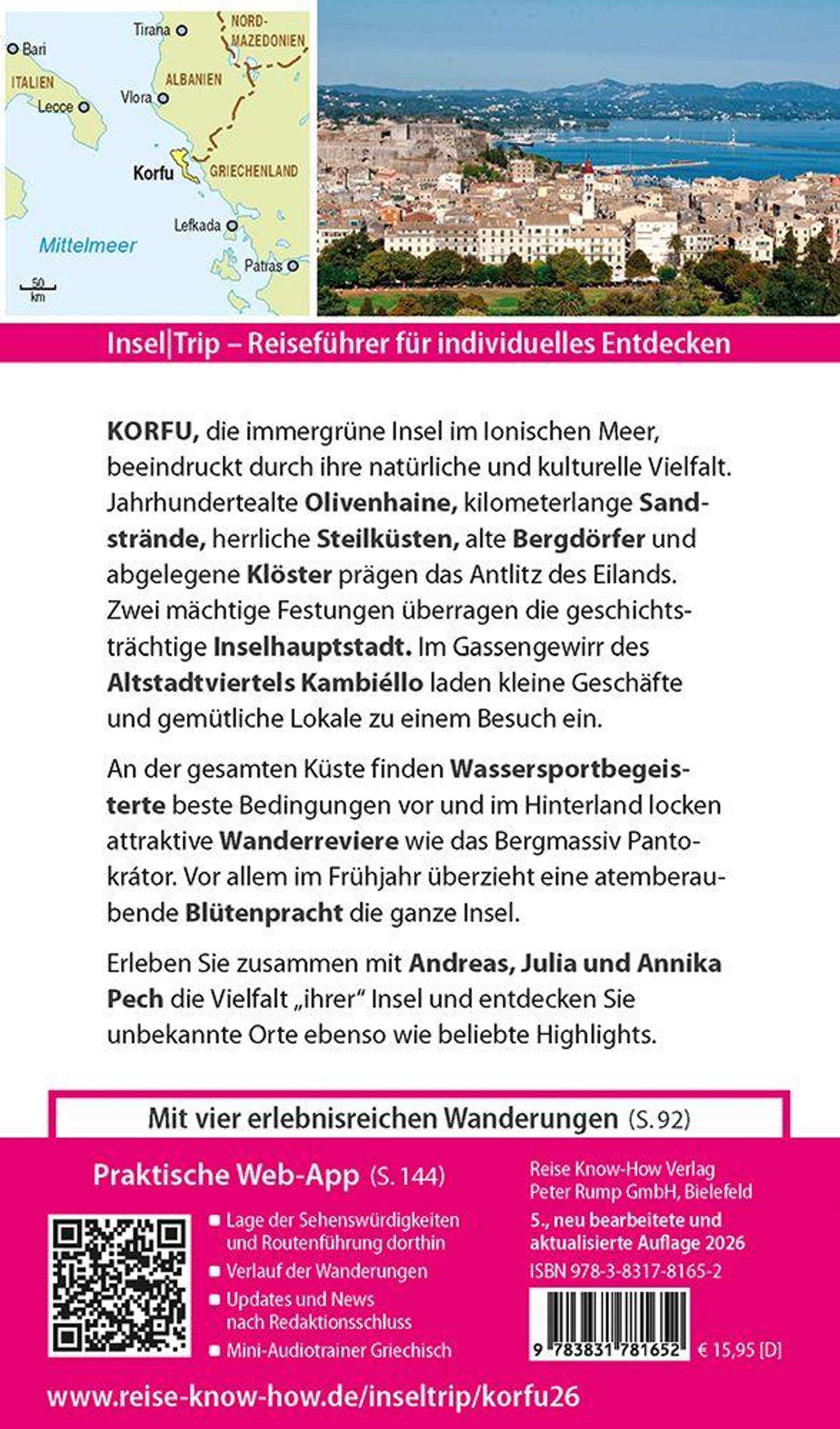 Dazu: kostenlose Web-App für Smartphone, Tablet und PC mit Inselplan- und Satellitenansichten passend zum Text, Routenführung zu allen beschriebenen Sehenswürdigkeiten und touristisch wichtigen Orten, Verlauf der Wanderungen, seitenbezogenen Updates nach Redaktionsschluss sowie einem Mini-Audiotrainer Griechisch