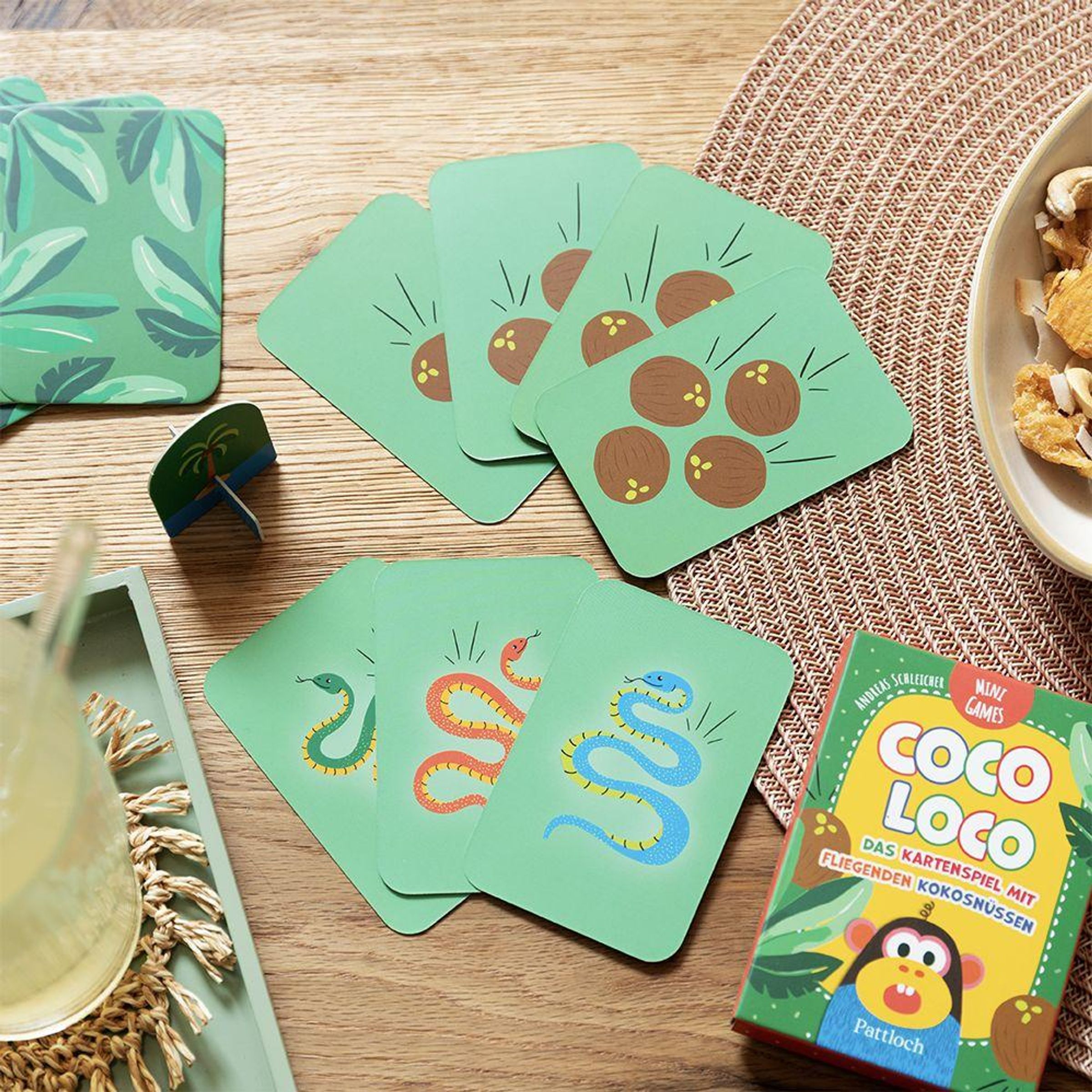 Das verrückte Kinderspiel ab 7 Jahren kommt mit 12 Kokosnusskarten, 3 Schlangenkarten, 1 Spielfigur und einer Spielidee, die großen Spaß macht.