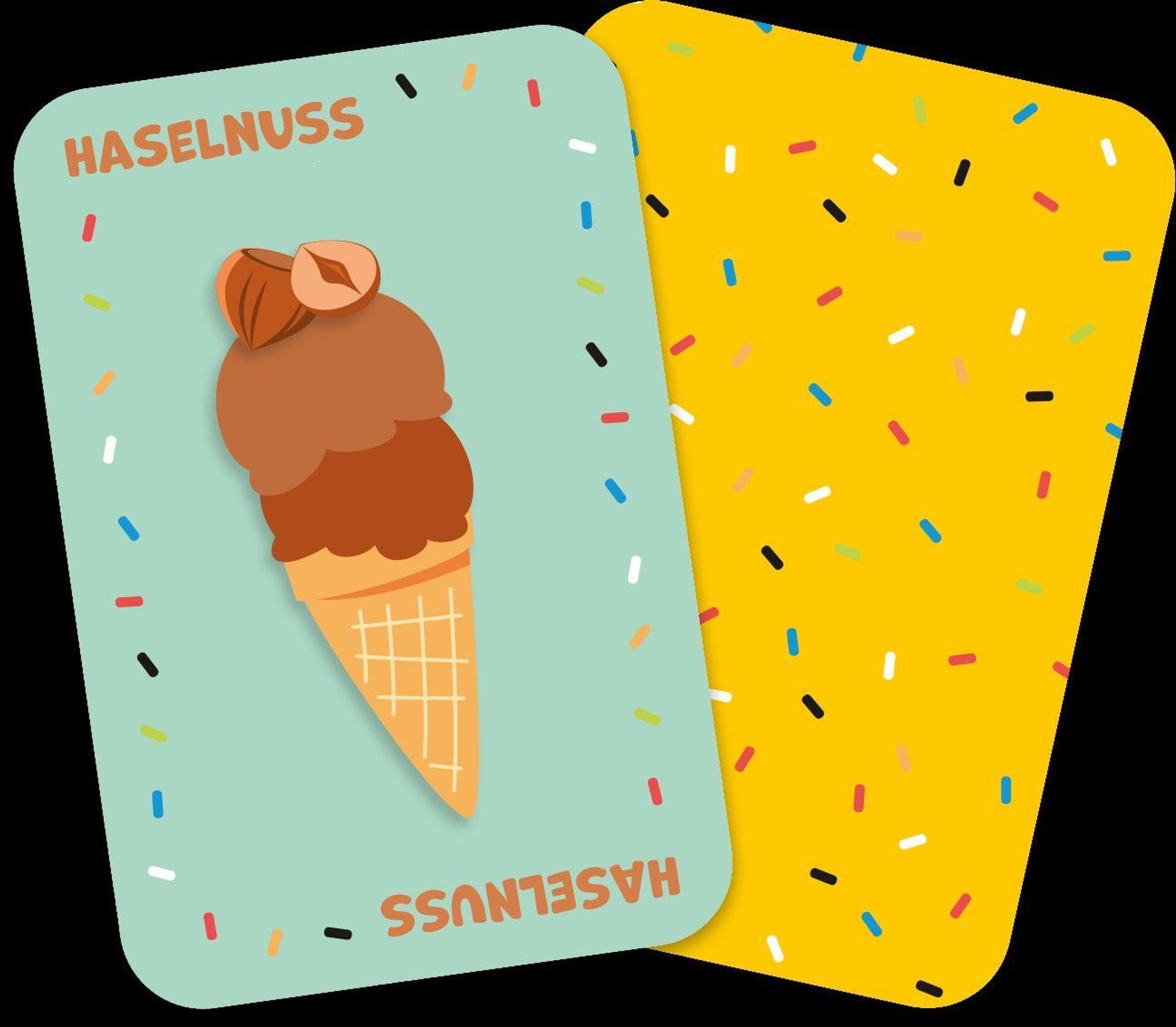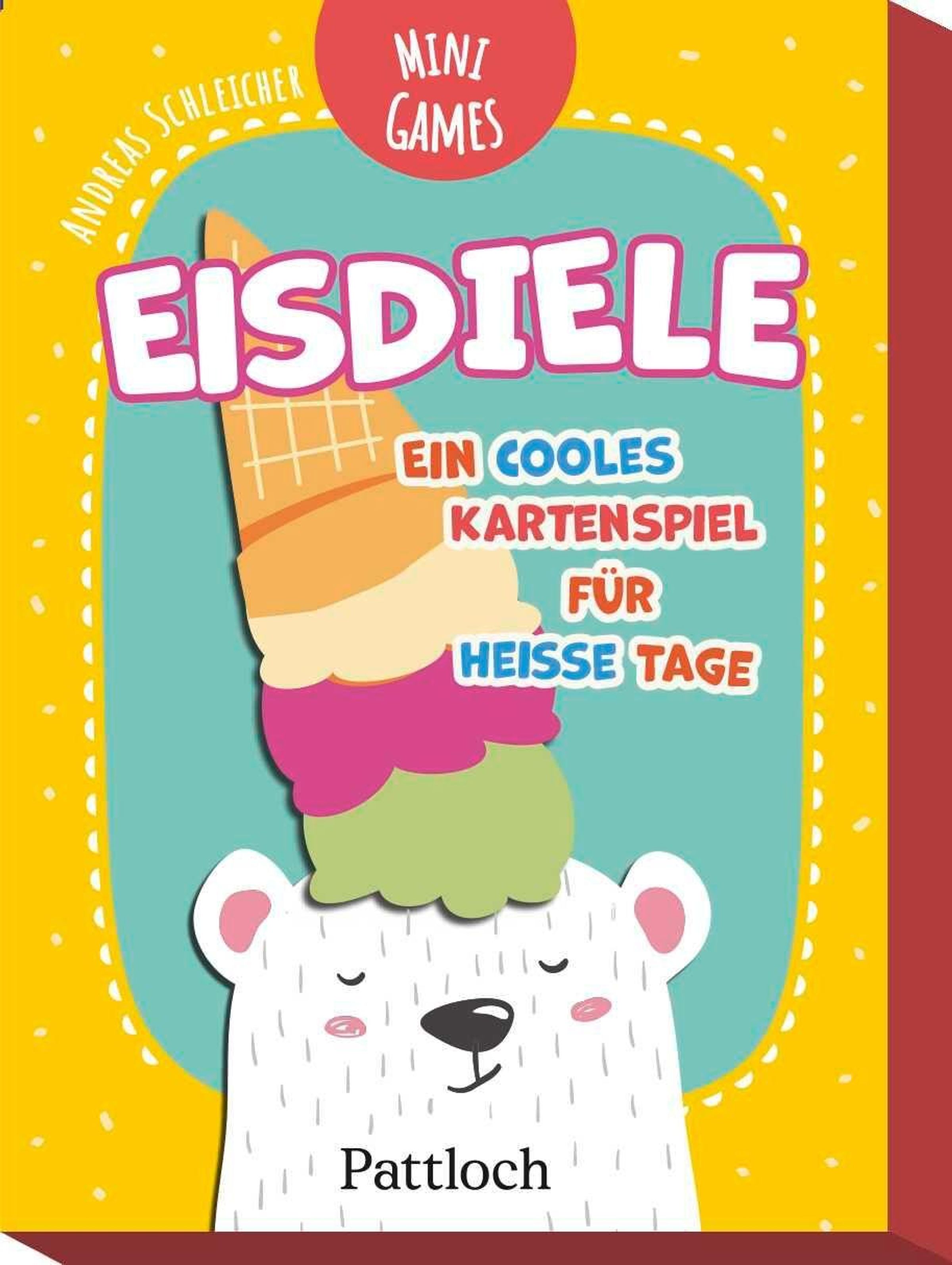 "Mini Games: Eisdiele. Ein cooles Kartenspiel für heiße Tage." Illustration: Bär mit Eistüte auf dem Kopf., Spiele