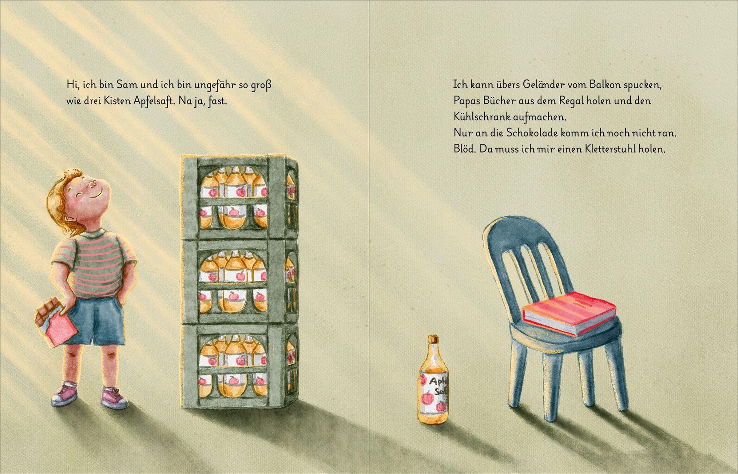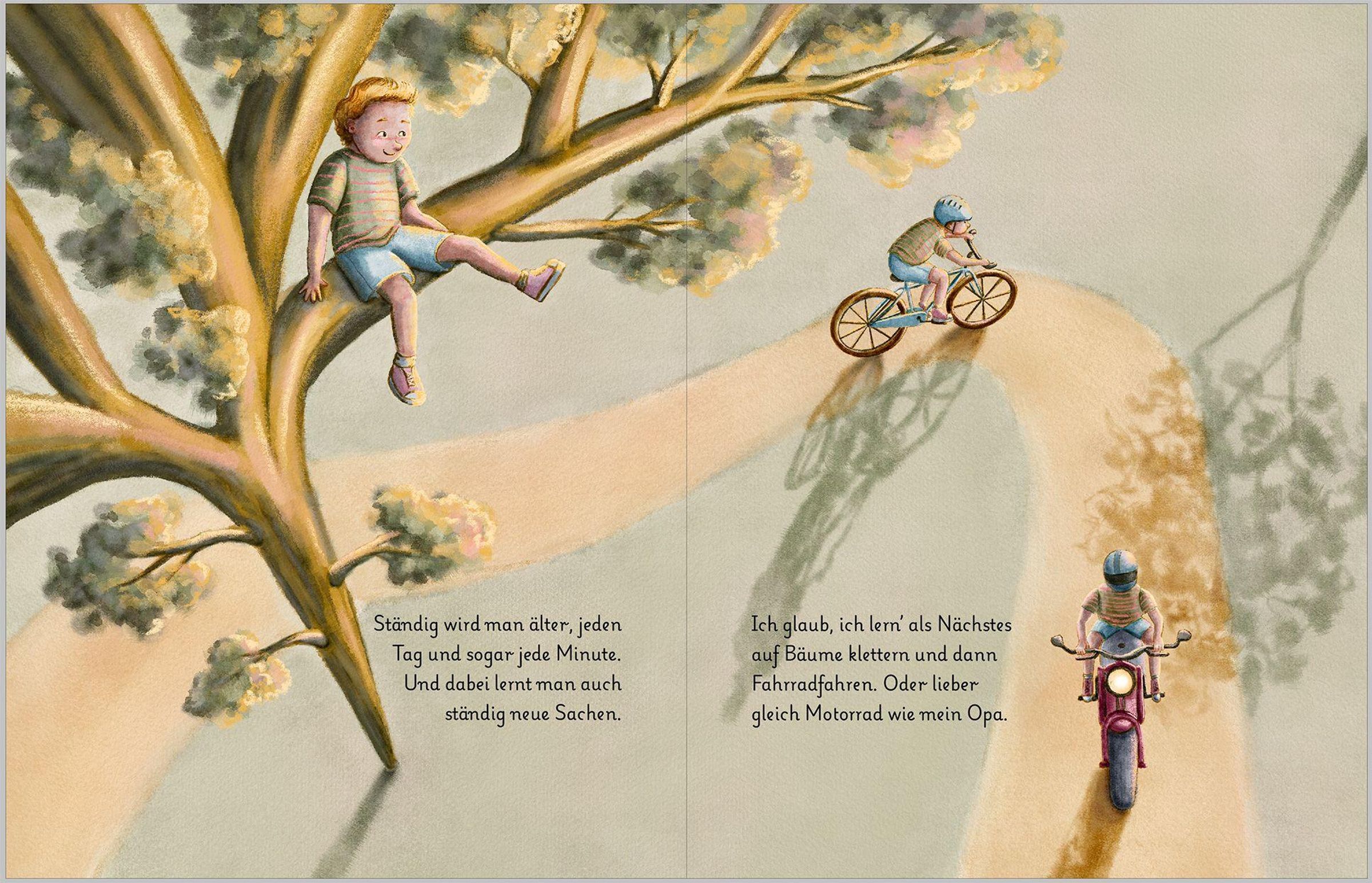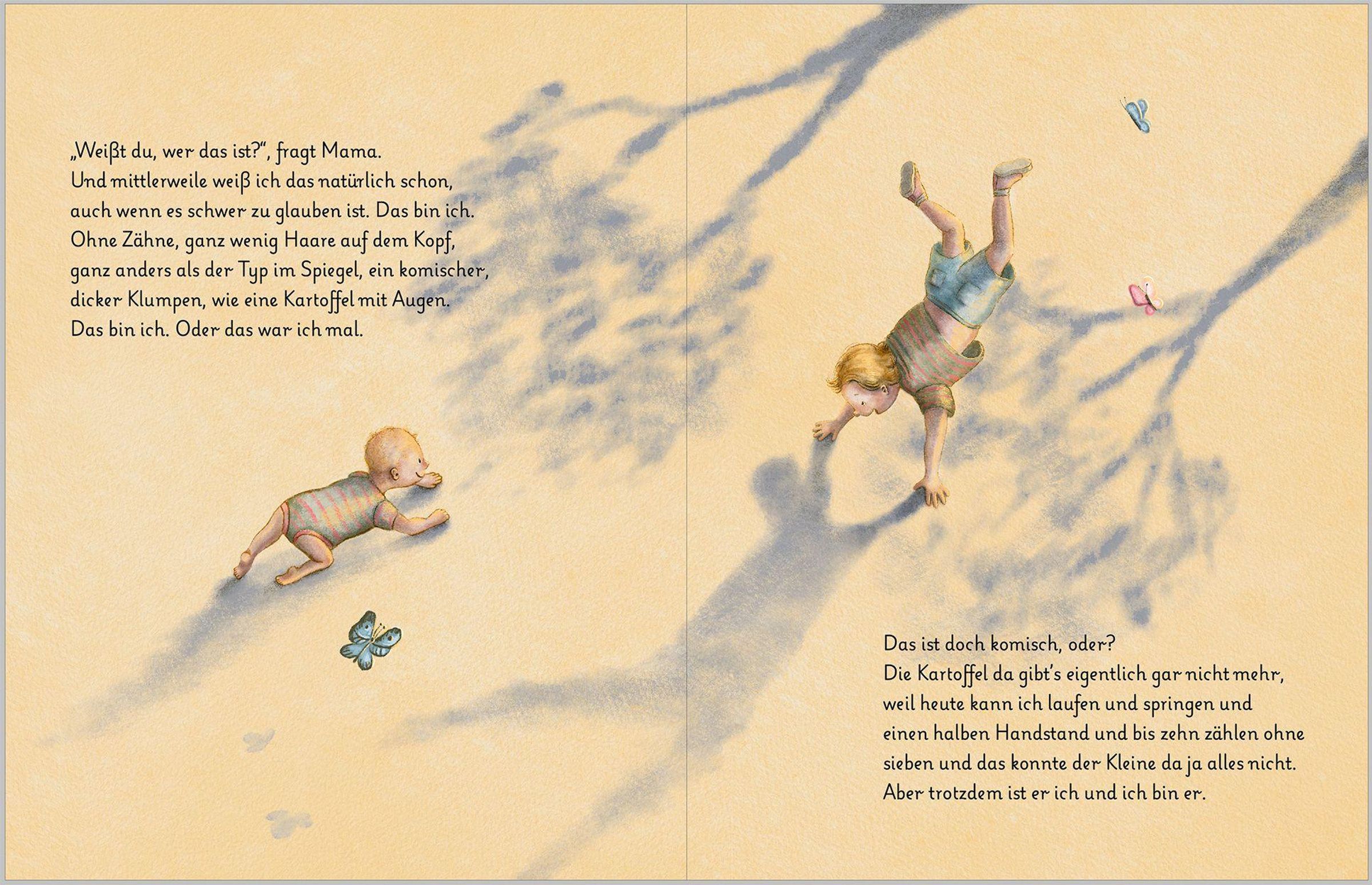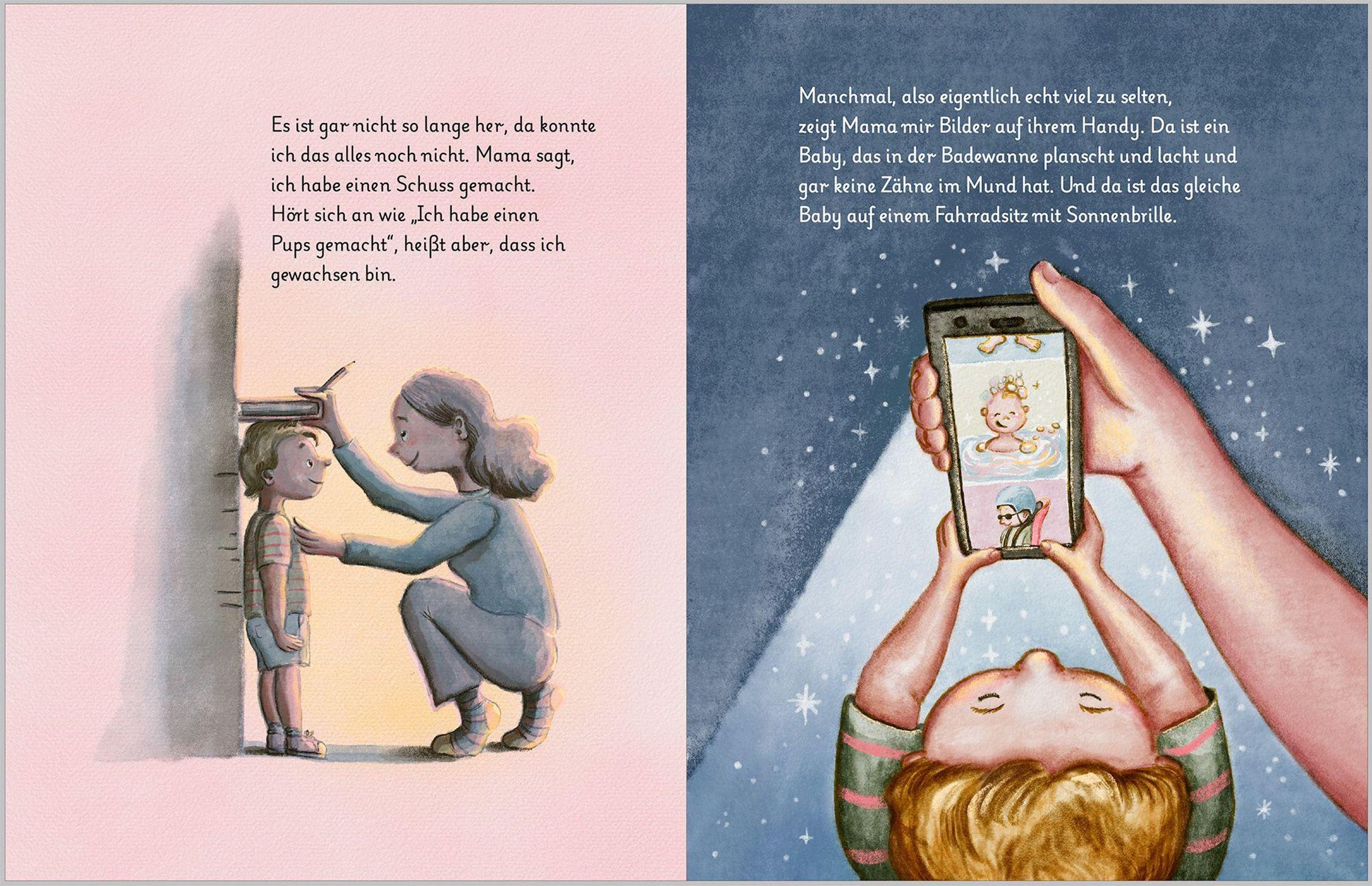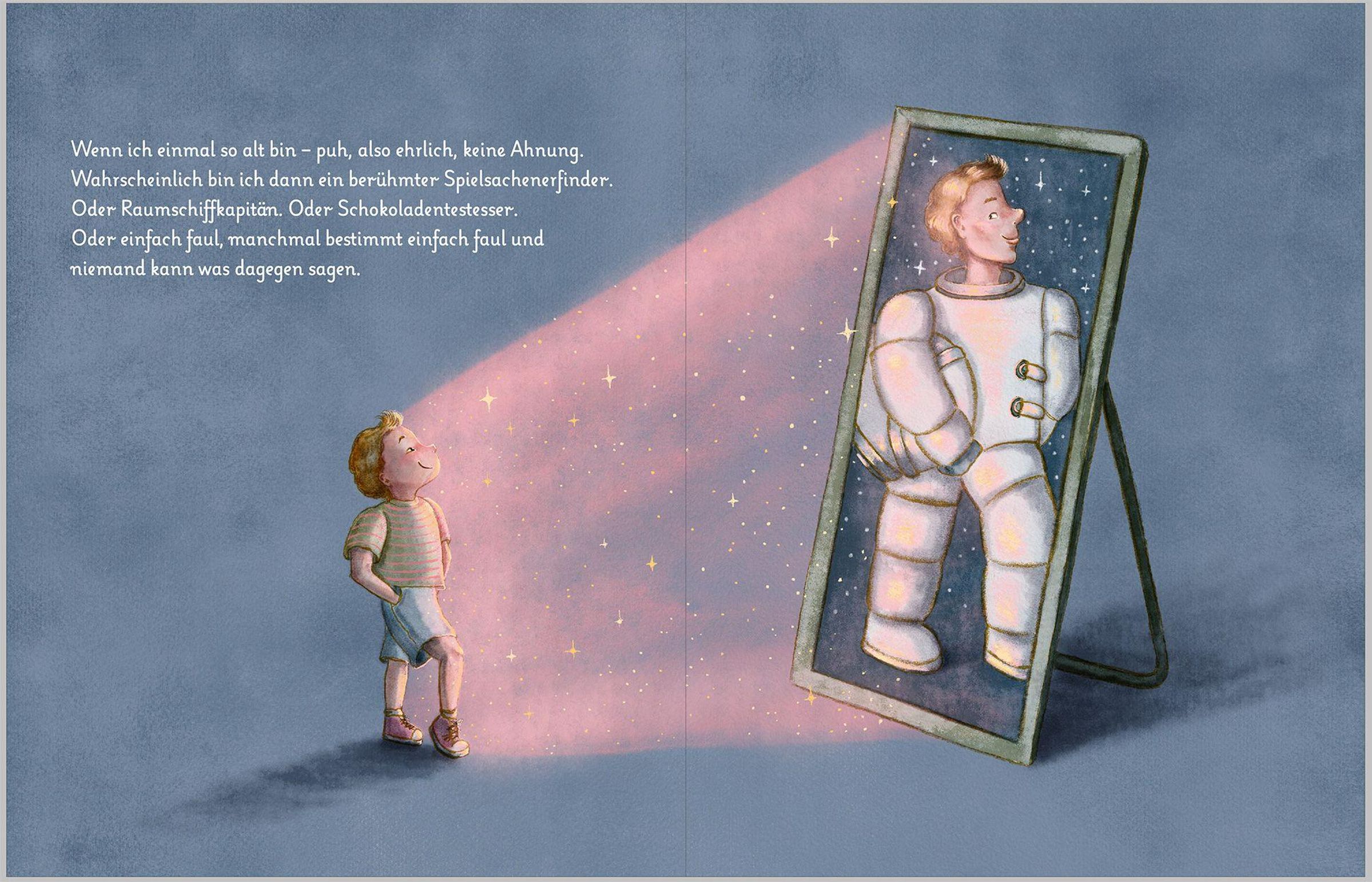 "Mehr!", rufe ich, "mehr Bilder!" Und ich bin ein bisschen sauer, weil Mama das Handy wieder einpackt. Aber mehr Bilder gibt es noch gar nicht, nur in meinem Kopf ... Ein Bild von einem Jungen, der mit seinem BMX-Rad über Rampen springt. Eins, wo er die ganze Nacht Computer spielt. Eins mit seinen Freunden am Lagerfeuer beim Zeltlager. Und eins, wo er ganz allein ein super dickes Buch zu Ende liest. Das bin vielleicht alles ich. Oder keiner davon. Oder nur der mit dem Buch zum Beispiel, das weiß man jetzt ja noch nicht. Für Kinder ab 5 Jahren.