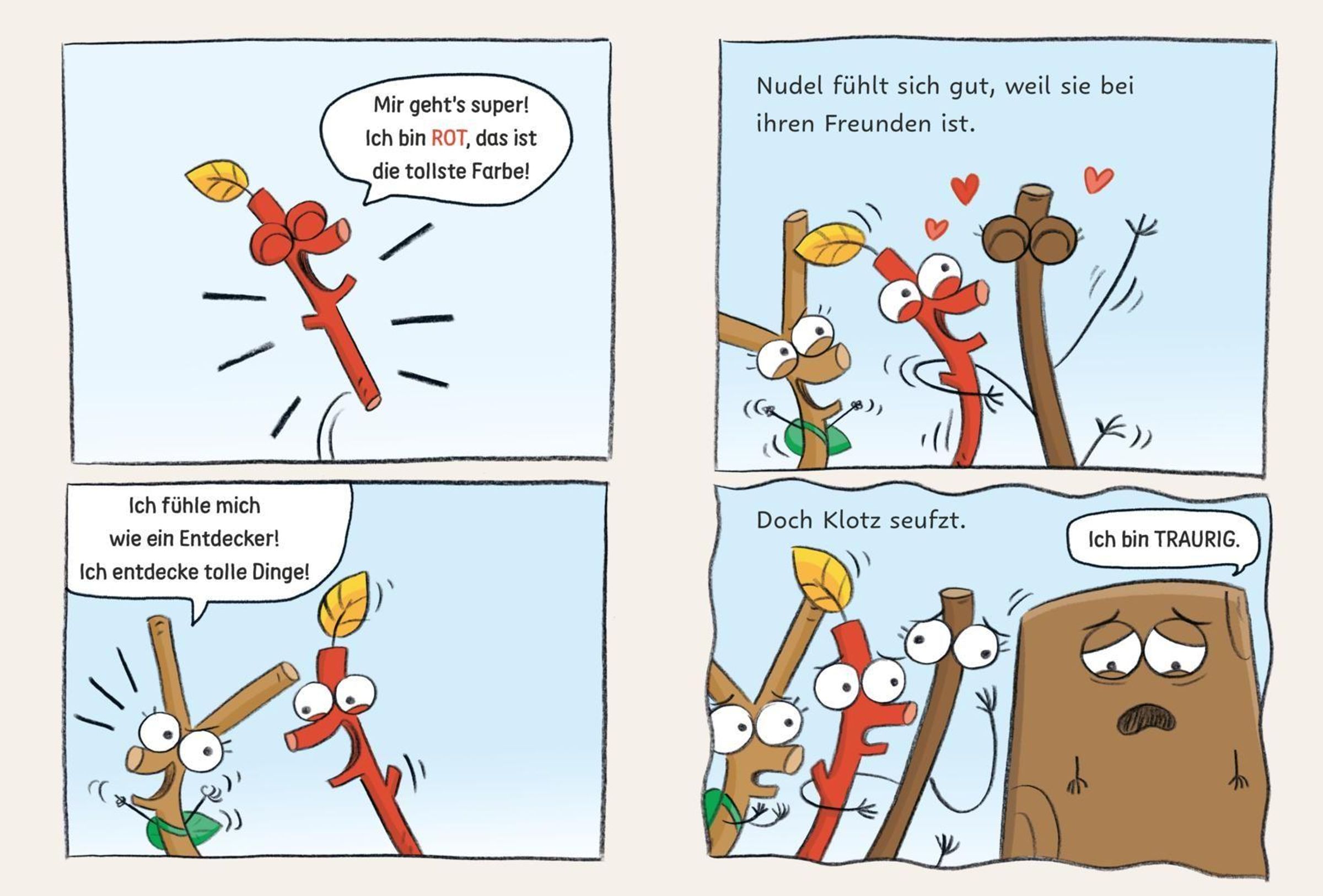 Auf die Äste, fertig, los! Bei der Baum-Bande ist jeder Tag ein Abenteuer. Die vier holzigen Freunde Klotz, Rot, Zwille und Nudel halten zusammen wie Harz und Rinde, egal ob einer von ihnen glücklich, grantig oder völlig überdreht ist. Denn zusammen lässt sich einfach jedes Gefühl besser aushalten und die Freude in den kleinen Dingen des Lebens finden.