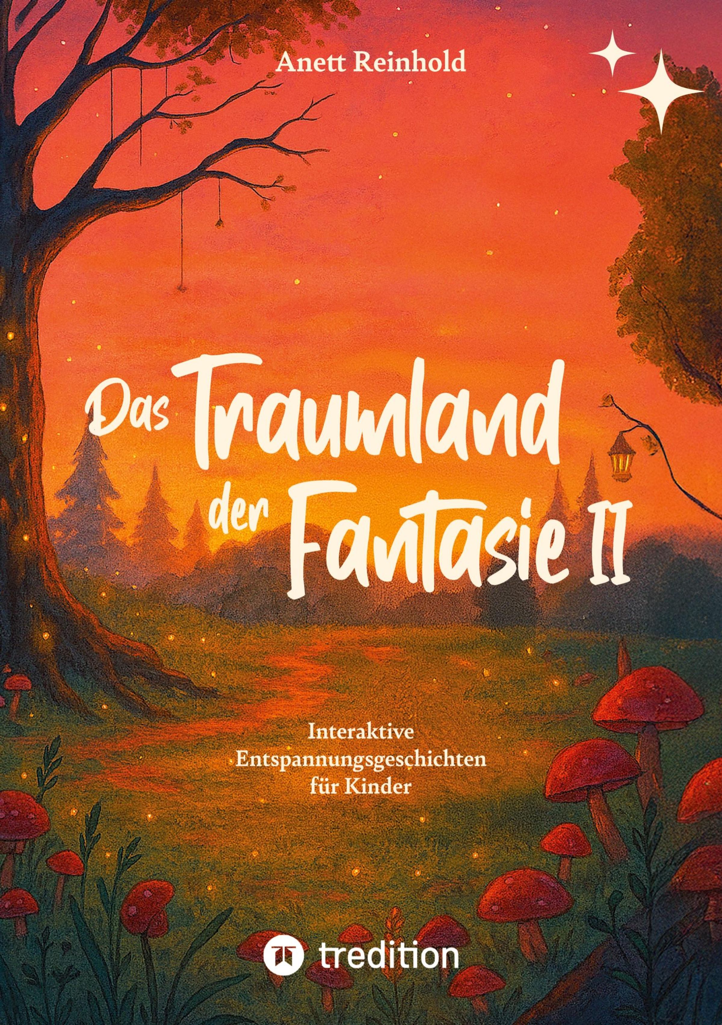 "Das Traumland der Fantasie II" von Anett Reinhold. Illustration: Baum, Pilze, Laterne, Abendhimmel. Entspannungsgeschichten für Kinder., Buch